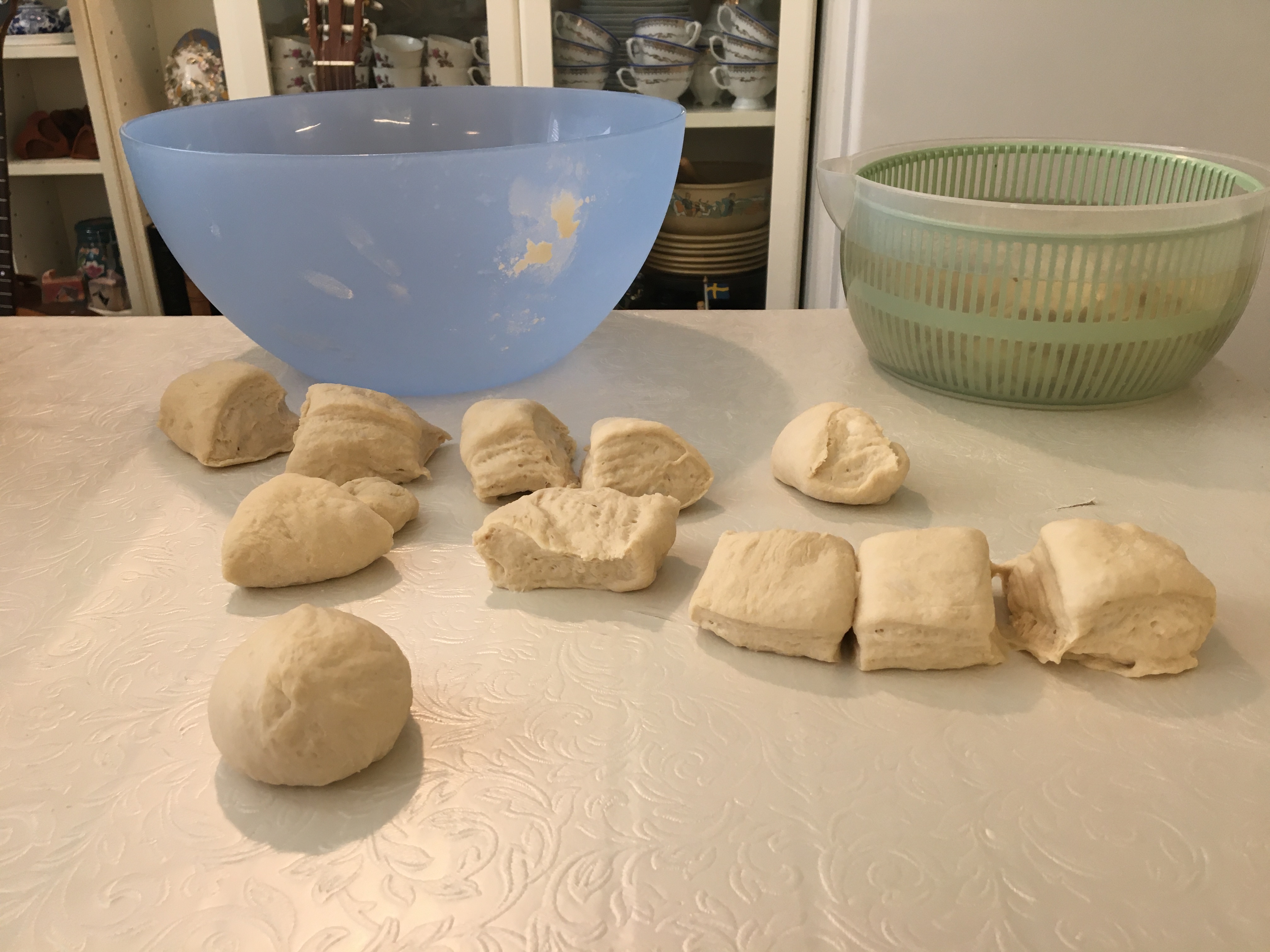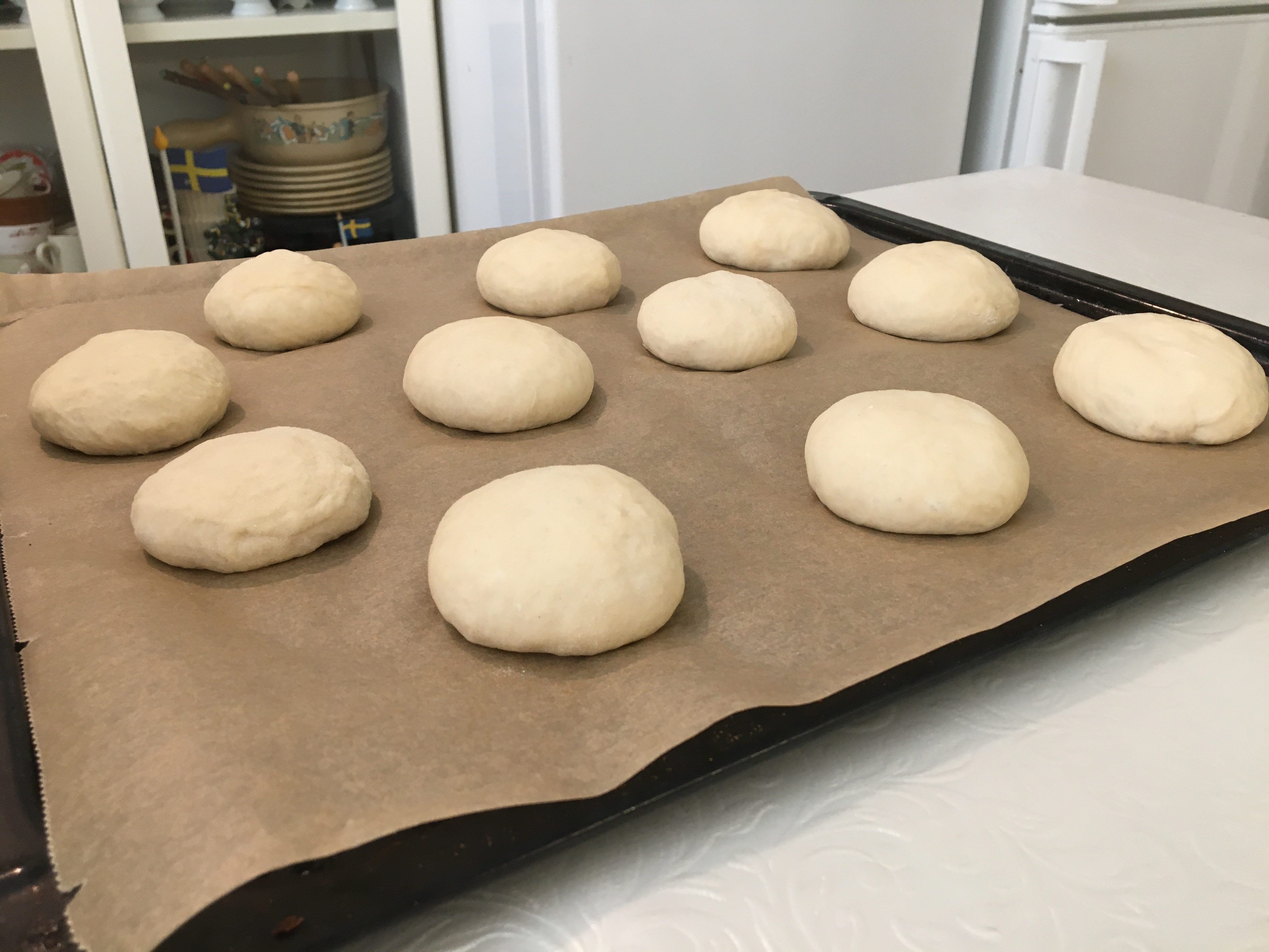 Turn dough out onto a lightly floured work surface, flatten dough, and press into rectangle. Cut dough into 12 pieces and form pieces into rolls. Place rolls apart on prepared baking sheet. Cover and let rise until doubled in size, about 30 minutes.