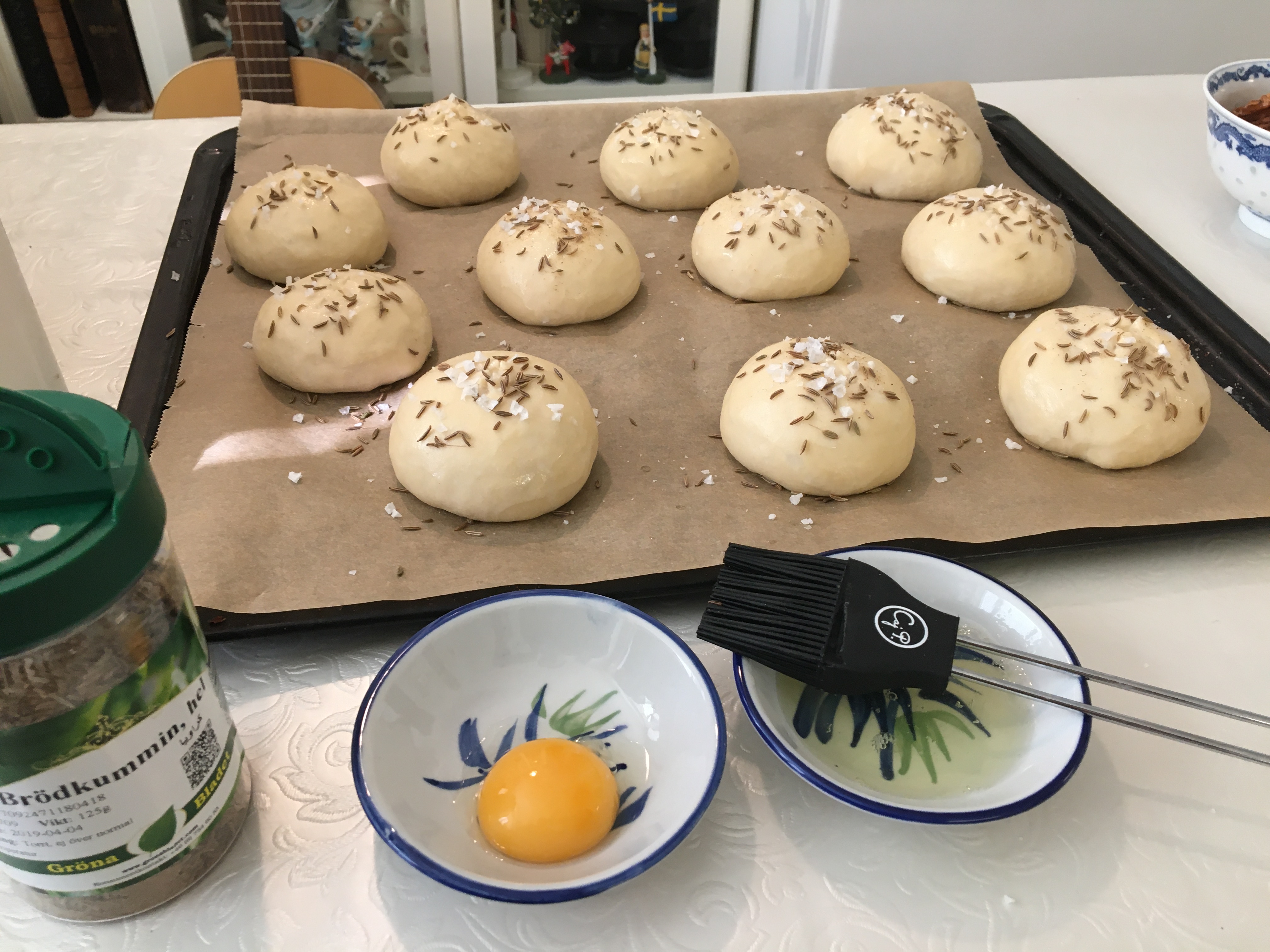 Whisk 1 egg white and 2 teaspoons water together in a small bowl. Use kitchen shears to cut an X at the top of each roll. Brush rolls with egg white mixture and sprinkle with caraway seeds and salt.