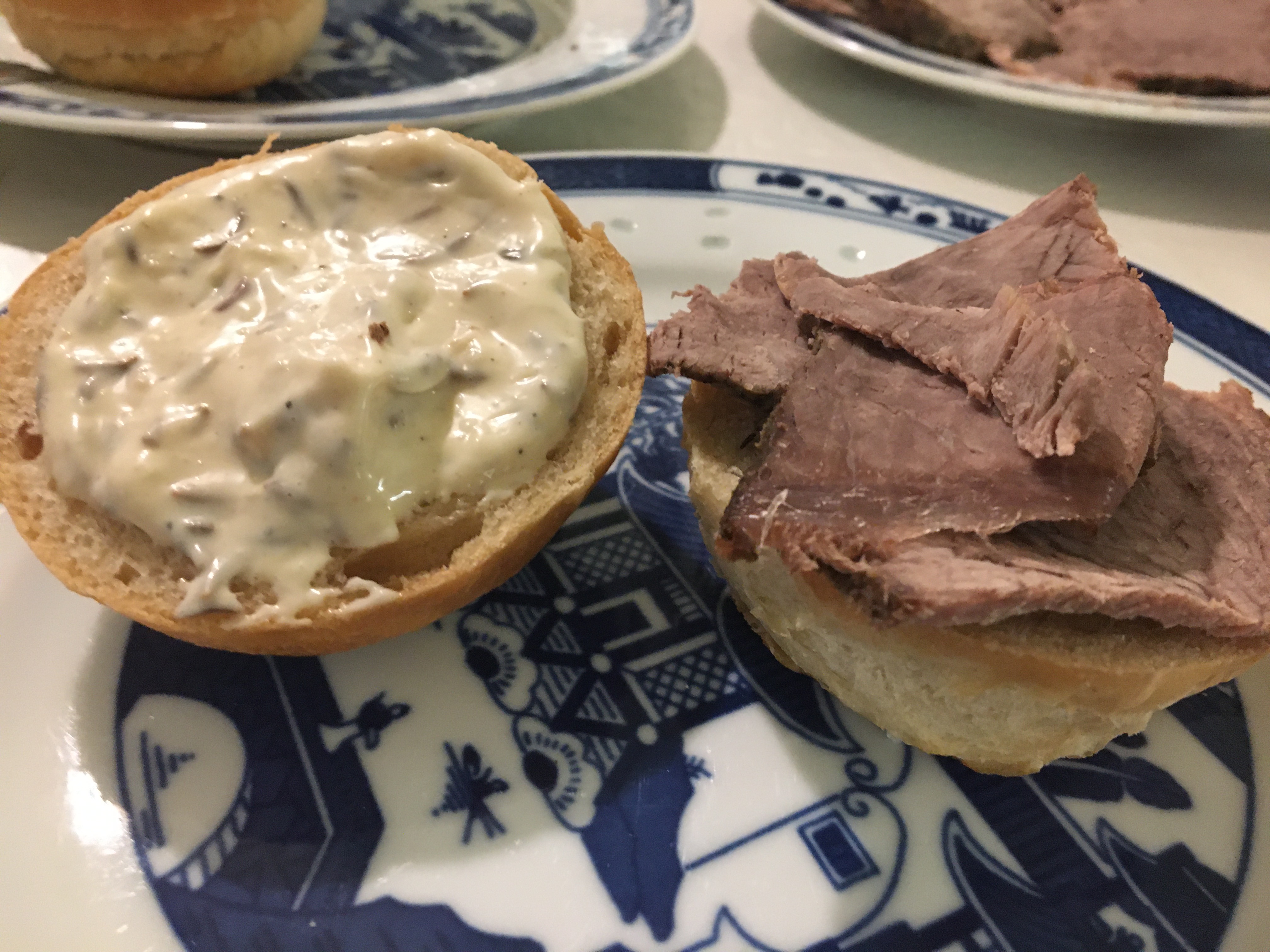 Cut the rolls in half and dip the top into the warm jus. Top the bottom of the rolls with roast beef. Spread the horseradish sauce on top of the roast beef and then top with the dipped roll.