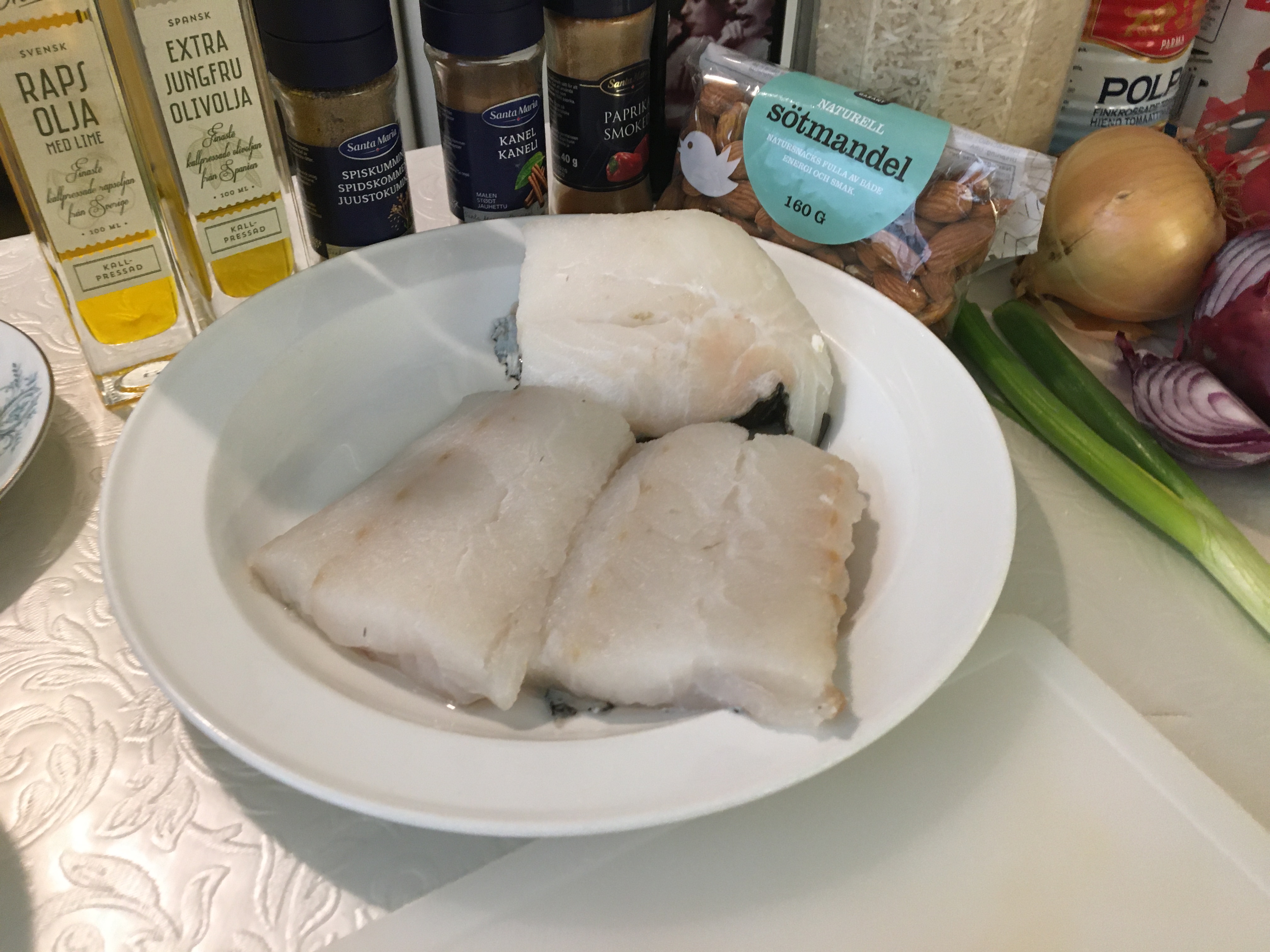 How about cod in a delicious rich tomato sauce with flavors from Morocco? Served with rice and a crispy almond and pea salad.