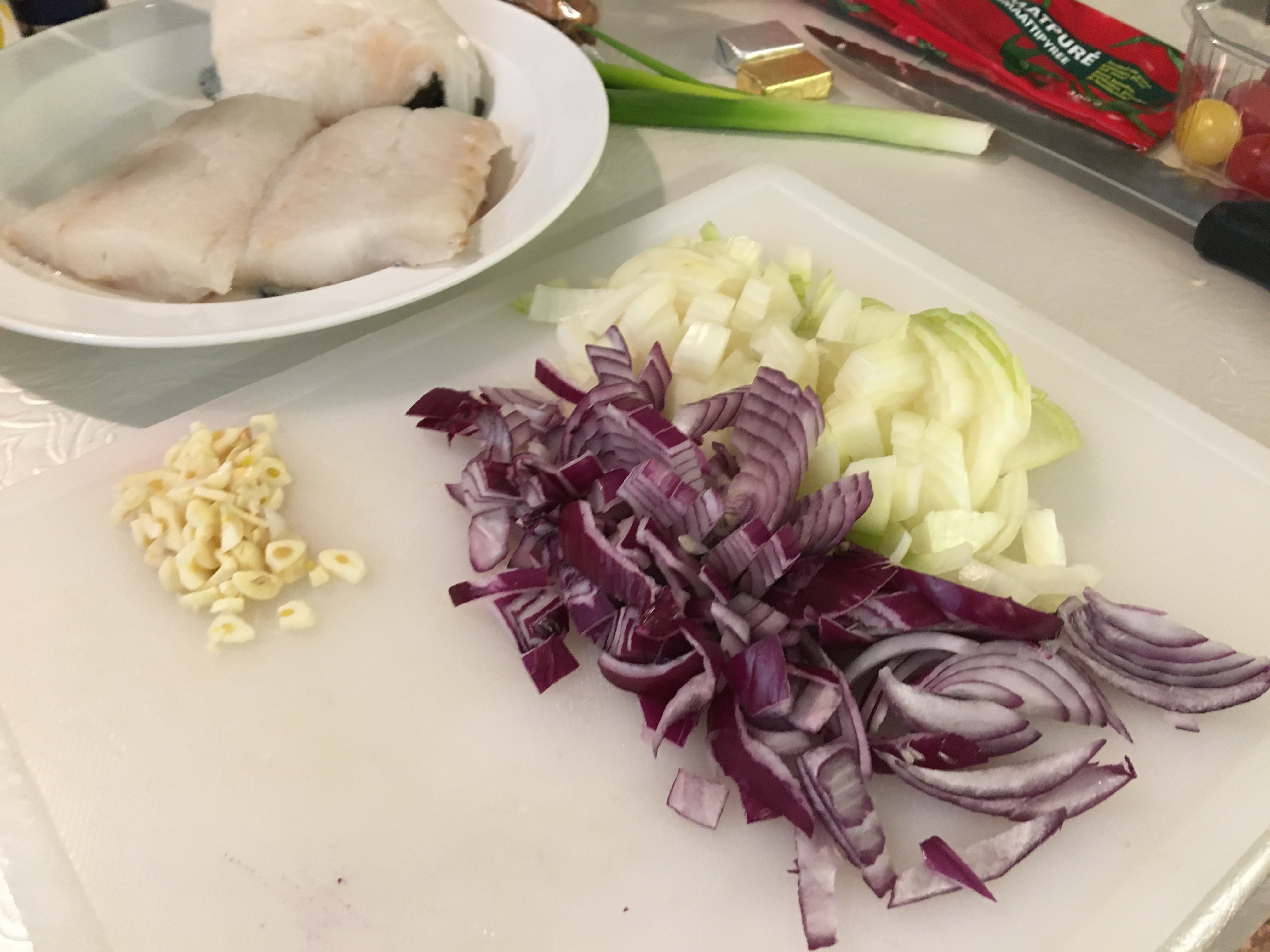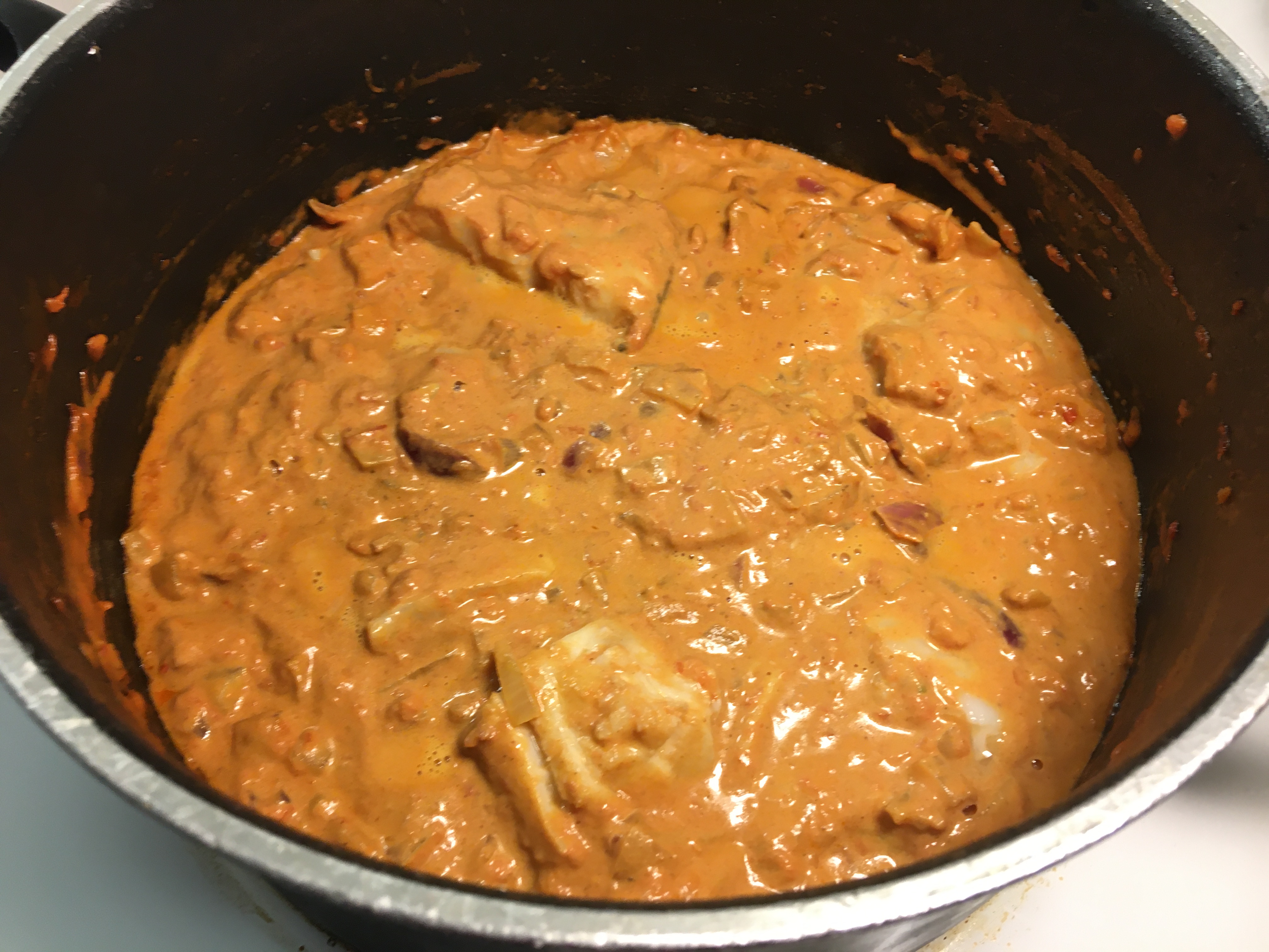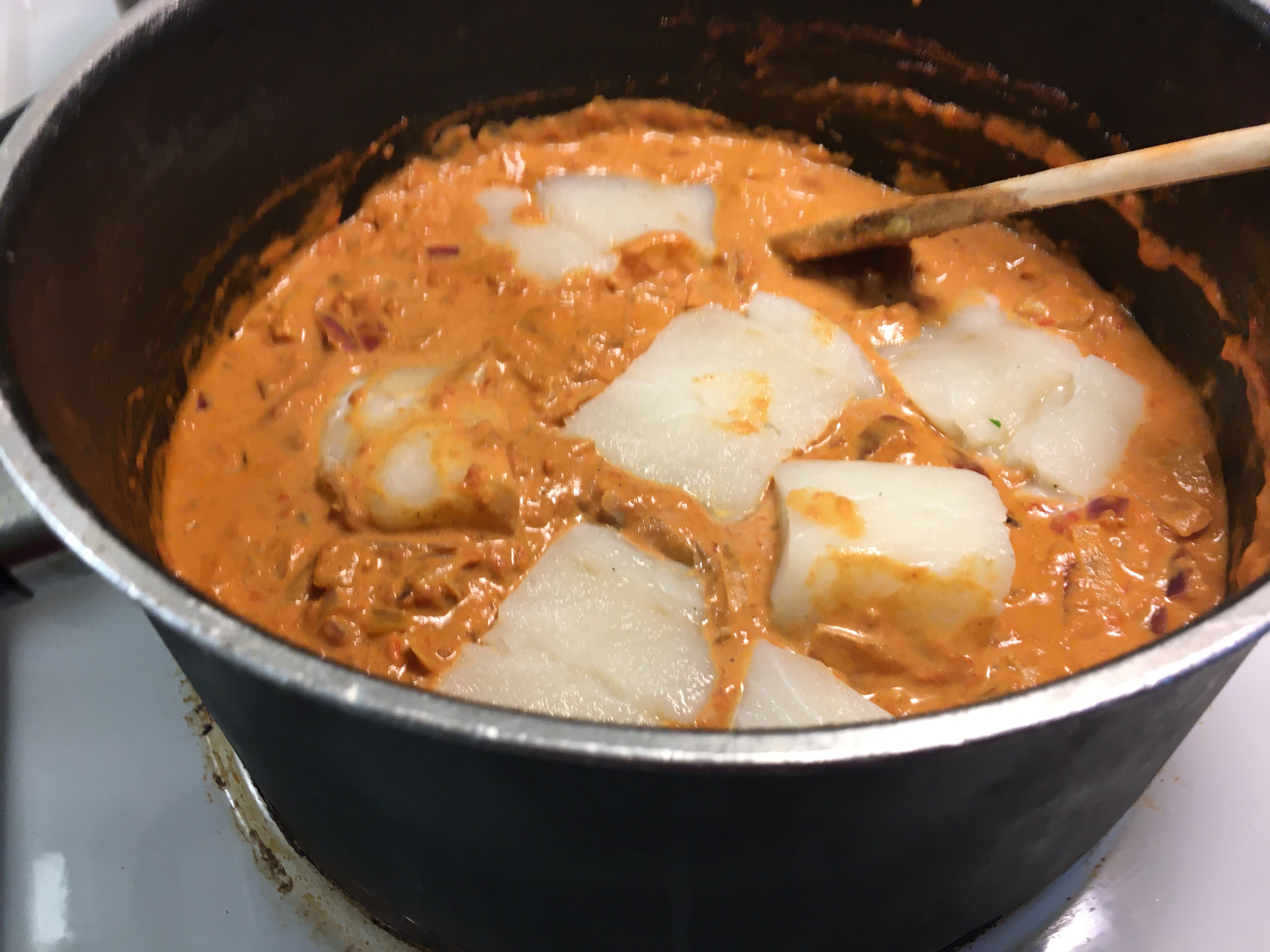 Cut the cod into smaller pieces and add to the tomato sauce. Let simmer for about 5 min.