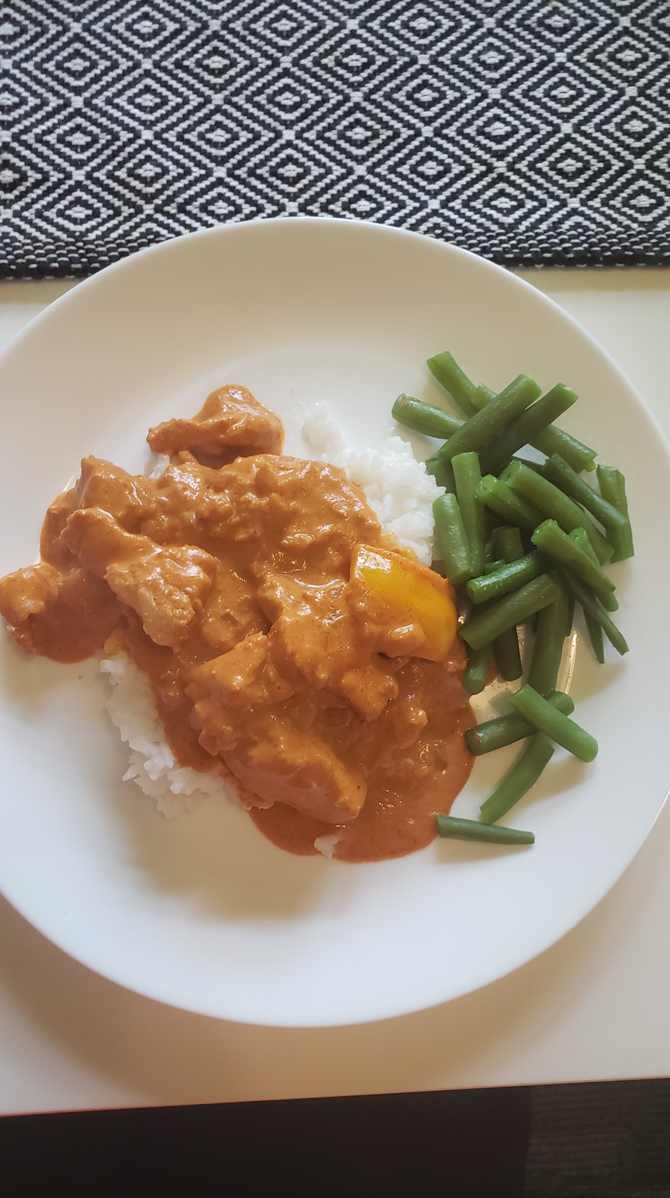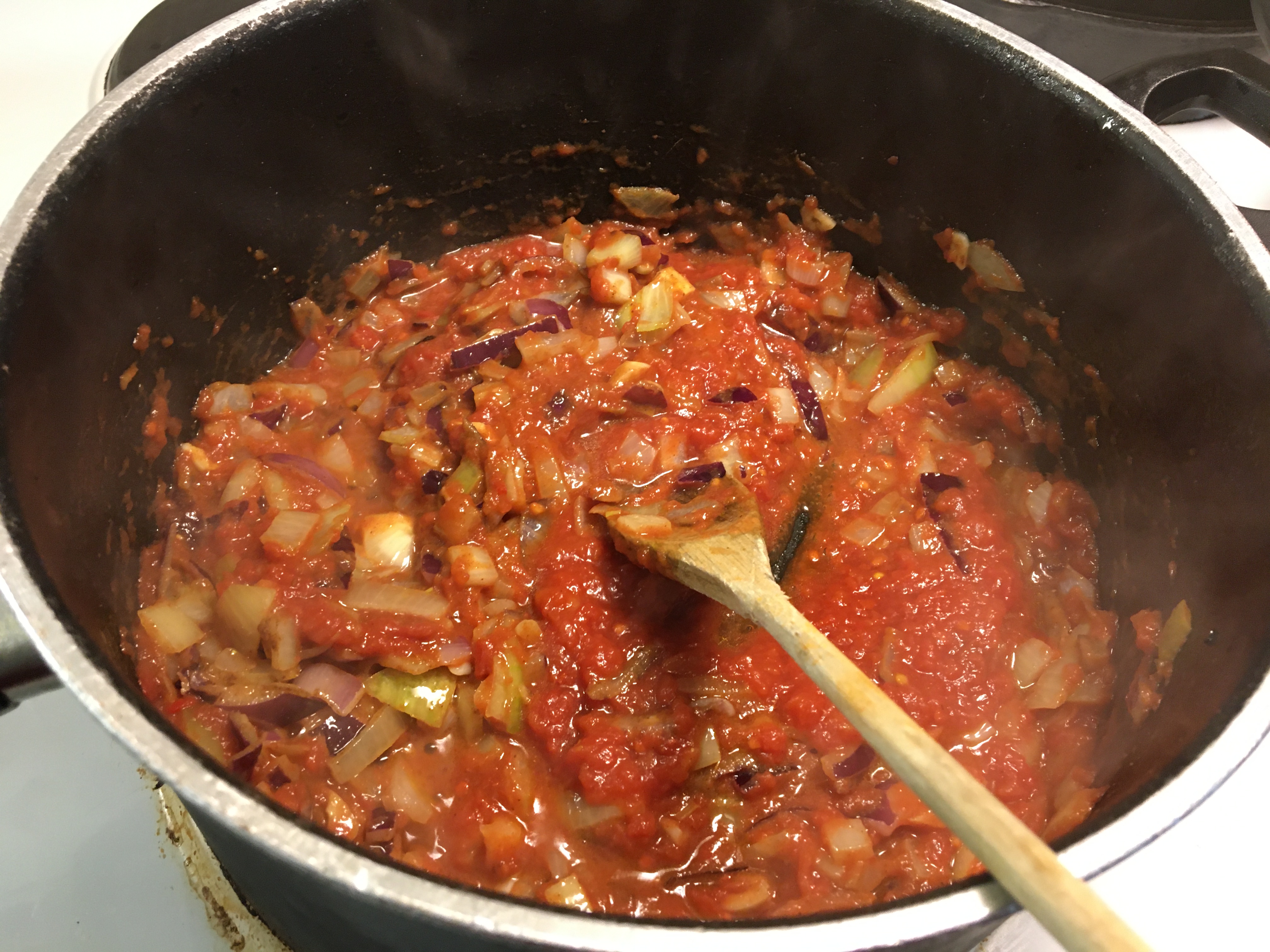 Add tomato puree, vinegar, crushed tomatoes, cumin and cocnut milk (cream or oat milk) and let sauce simmer for 5 min.