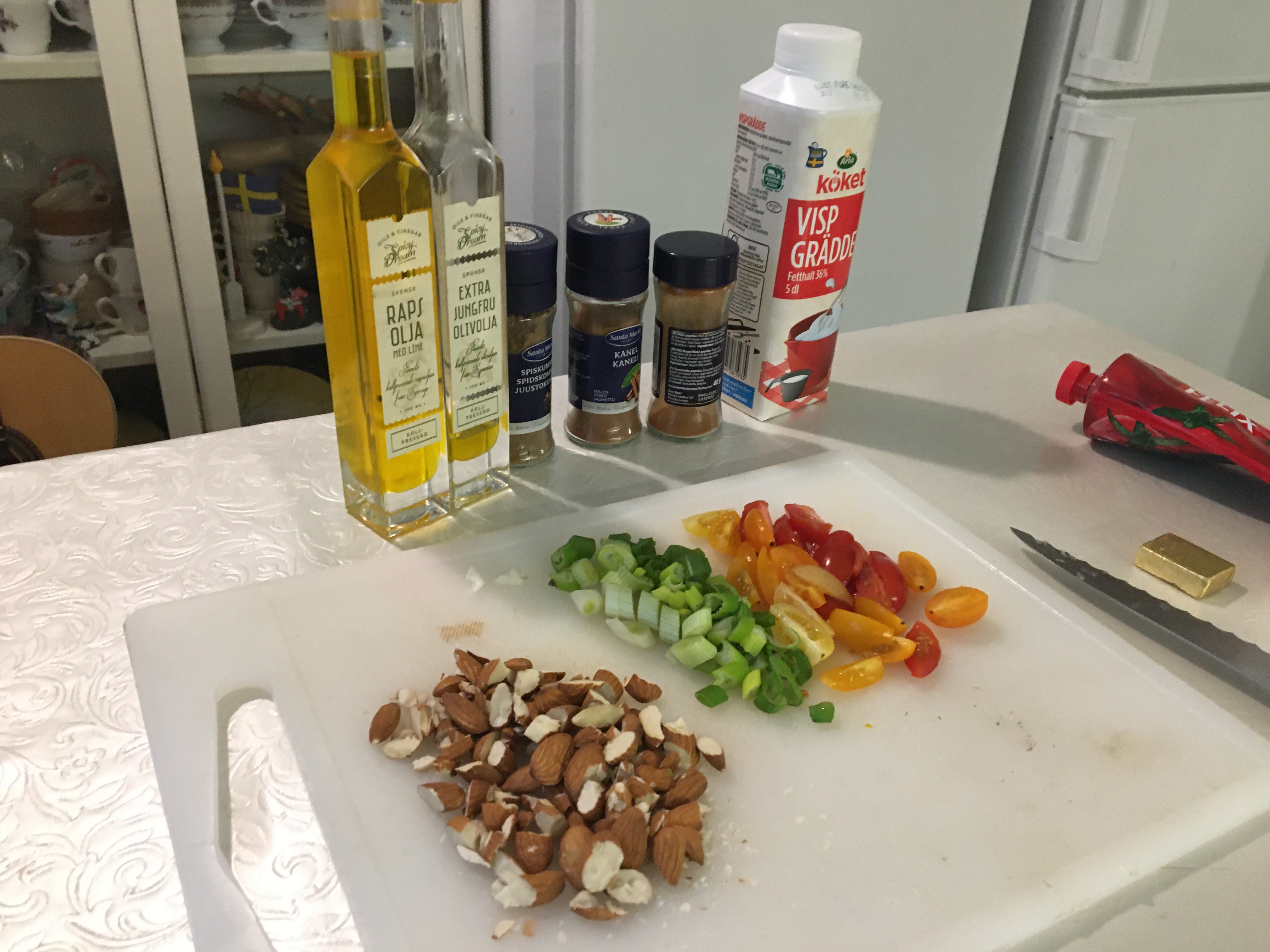Heat olive oil in a frying pan and fry onions, garlic and peppers together with cumin, paprika powder and cinnamon on medium heat for about 2 min.