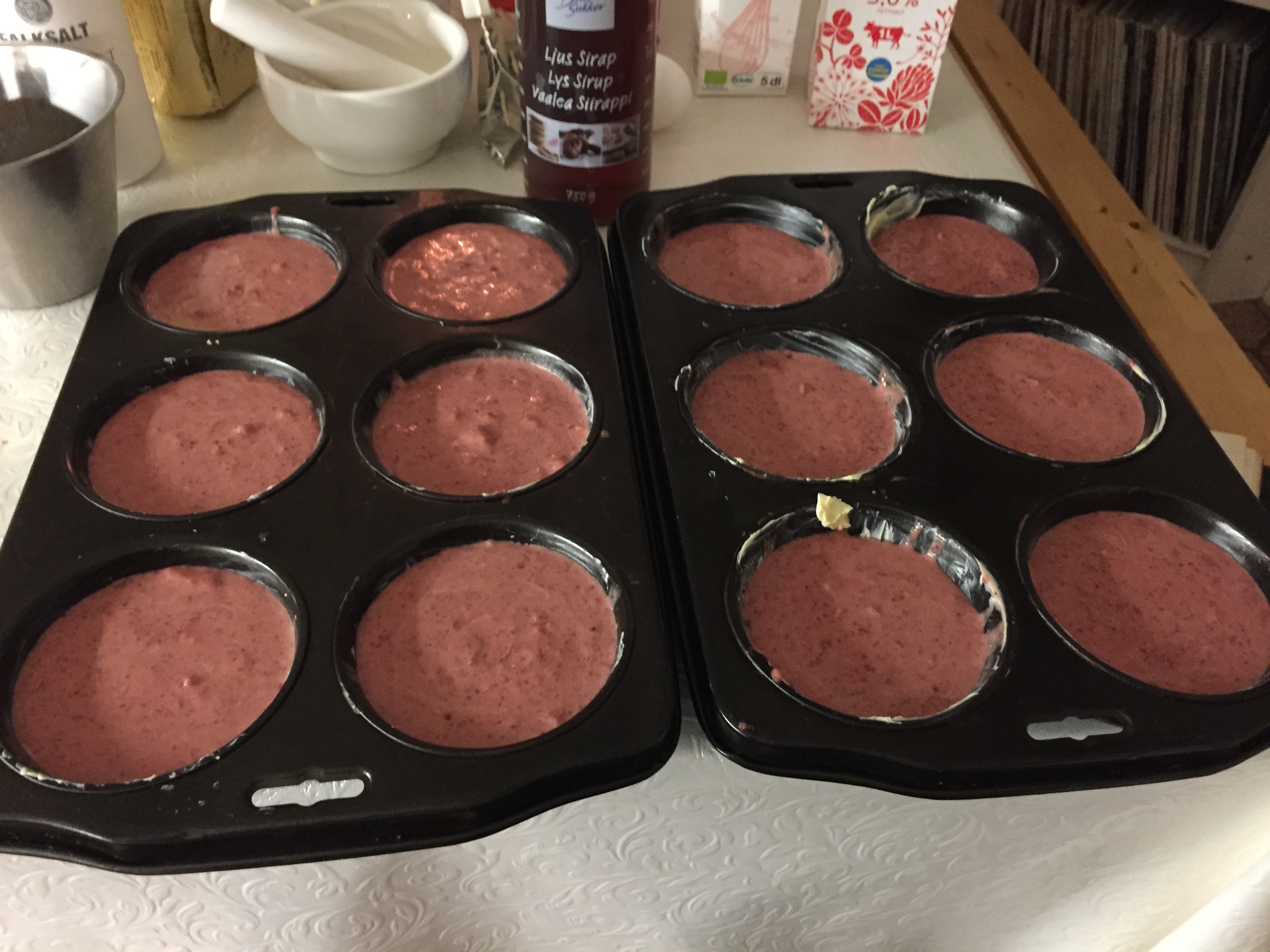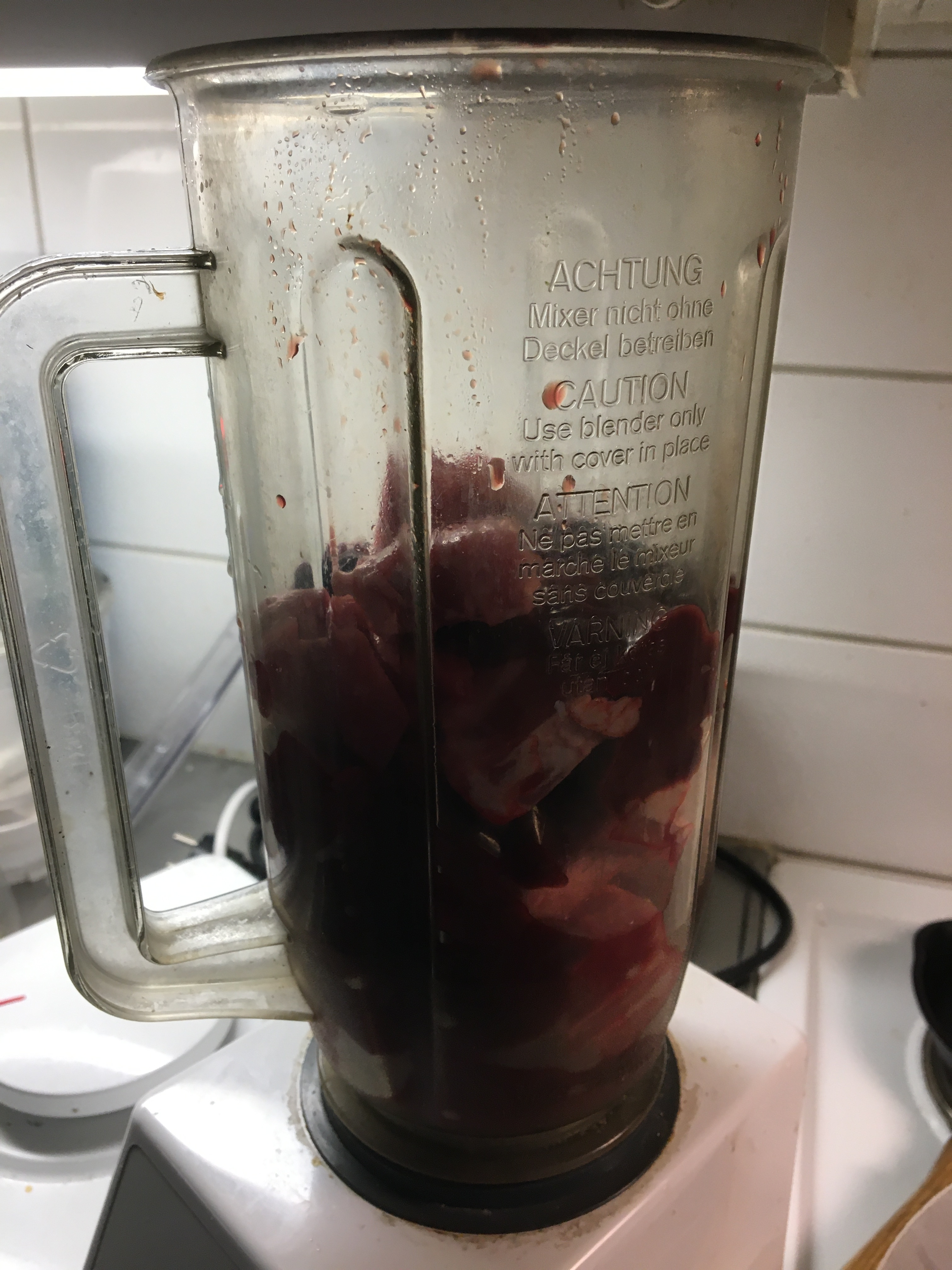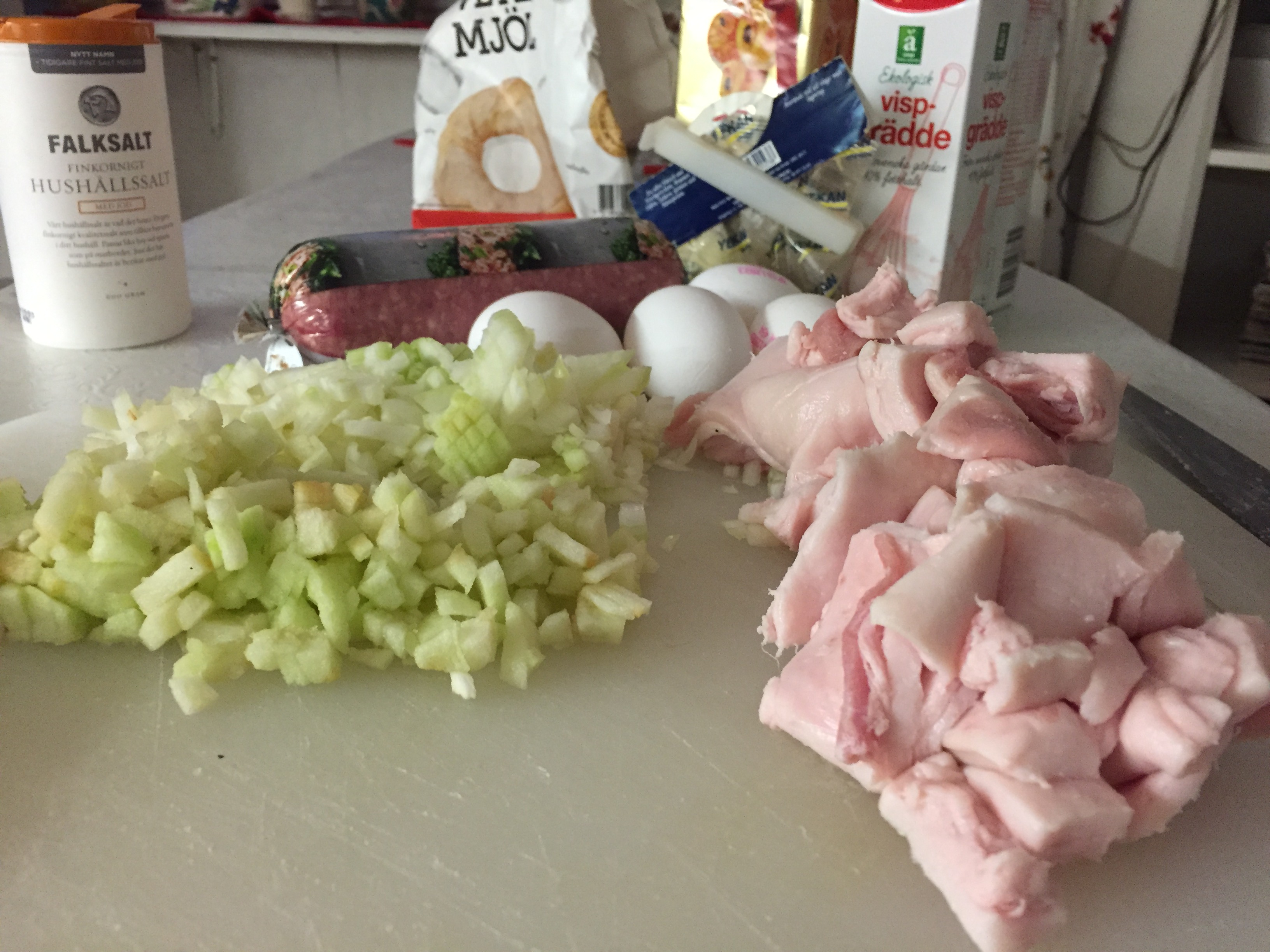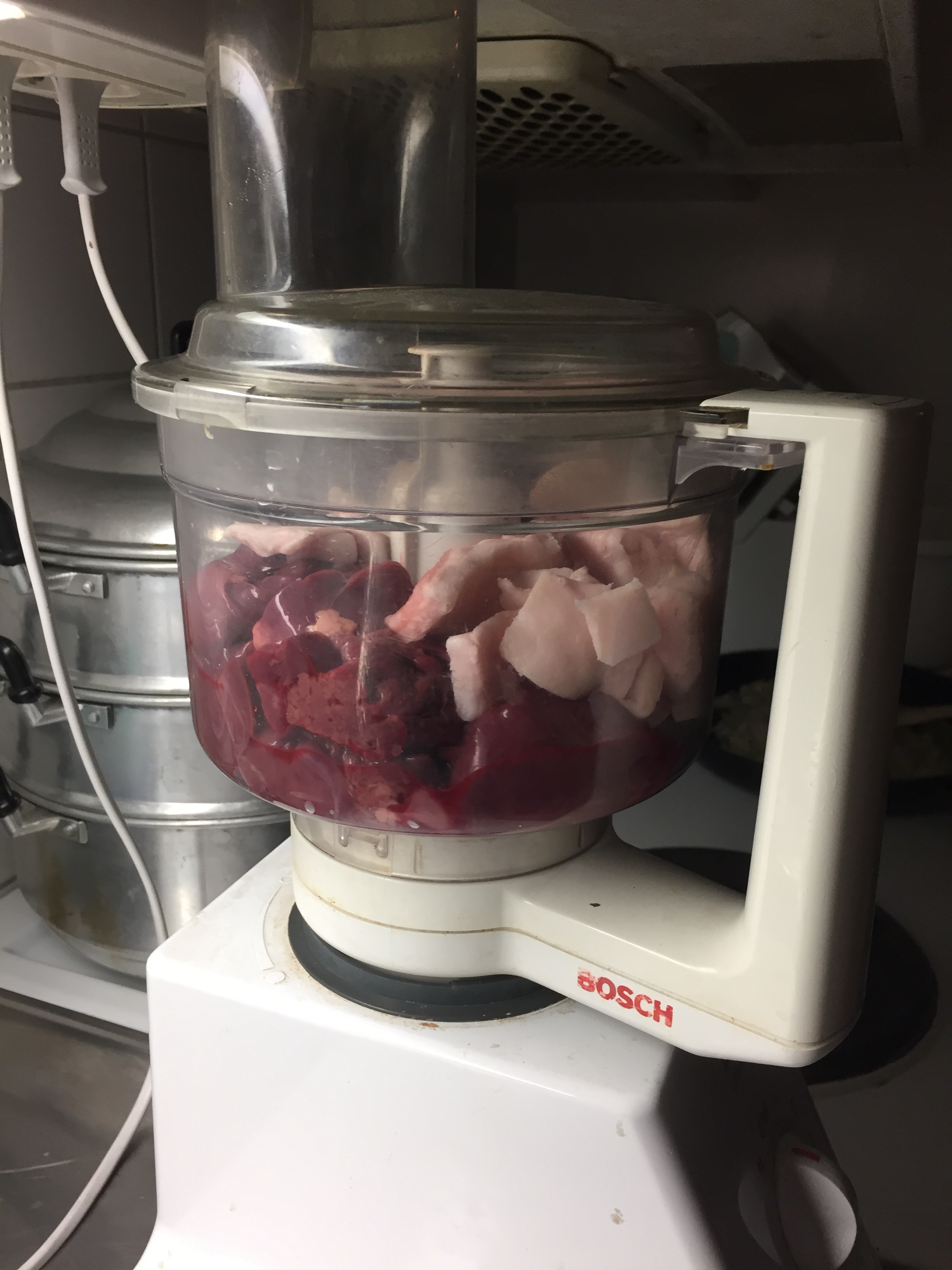 Preheat the oven to 175˚. Cut the liver into centimeter-sized pieces. Heat the butter in a frying pan and fry the onion shiny and translucent on low heat. Take the onion and let it cool. Mount the knife in the food processor or use the mixer.