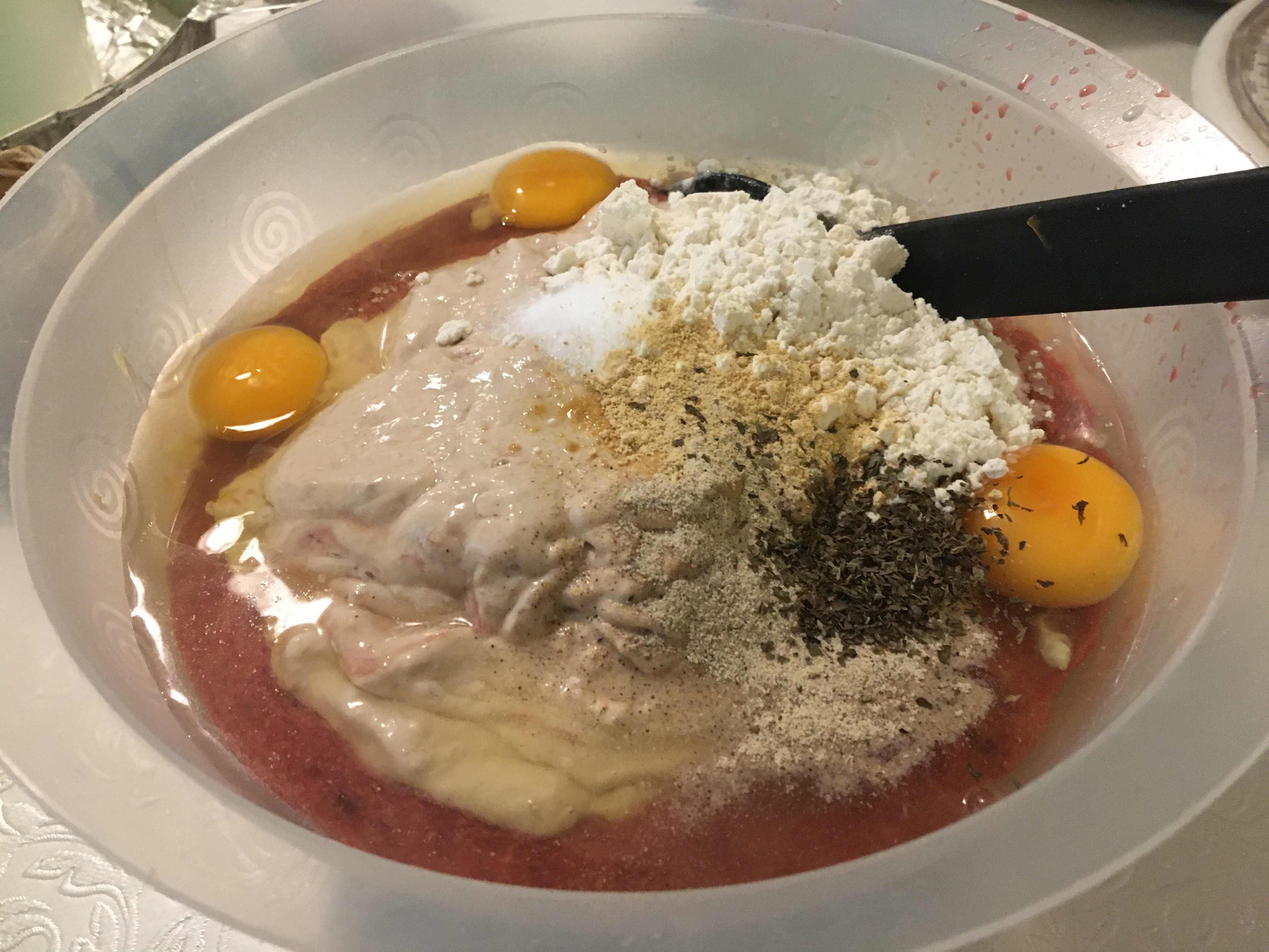Set a oven pan in the lower part of the oven. Pour the batter into a greased ovenproof dish (a breadloaf pan) and place it in the oven pan. Fill the outer oven pan with water and bake the loaf in the pan in water bath to an internal temperature of 72˚, about 1 hour.