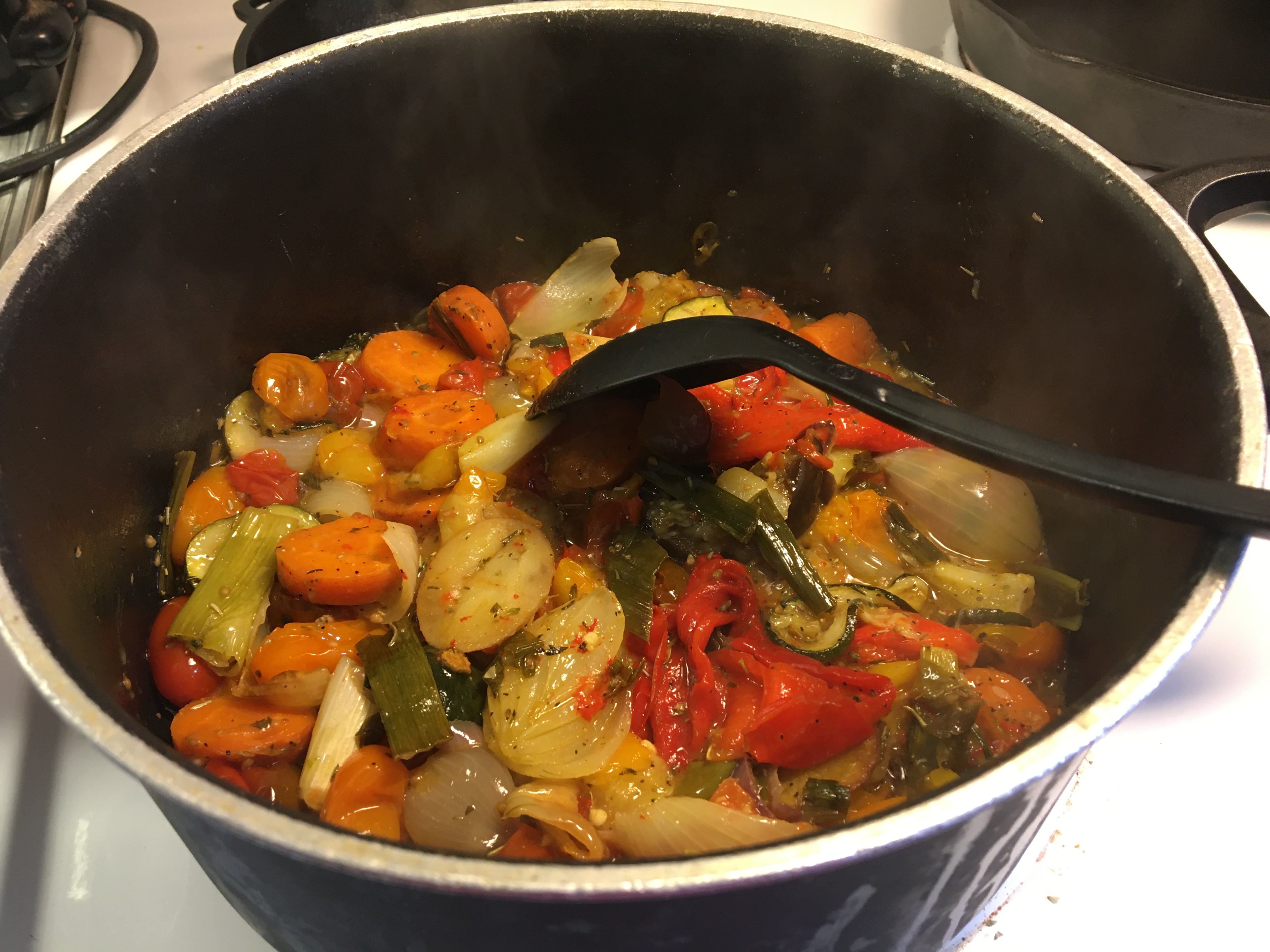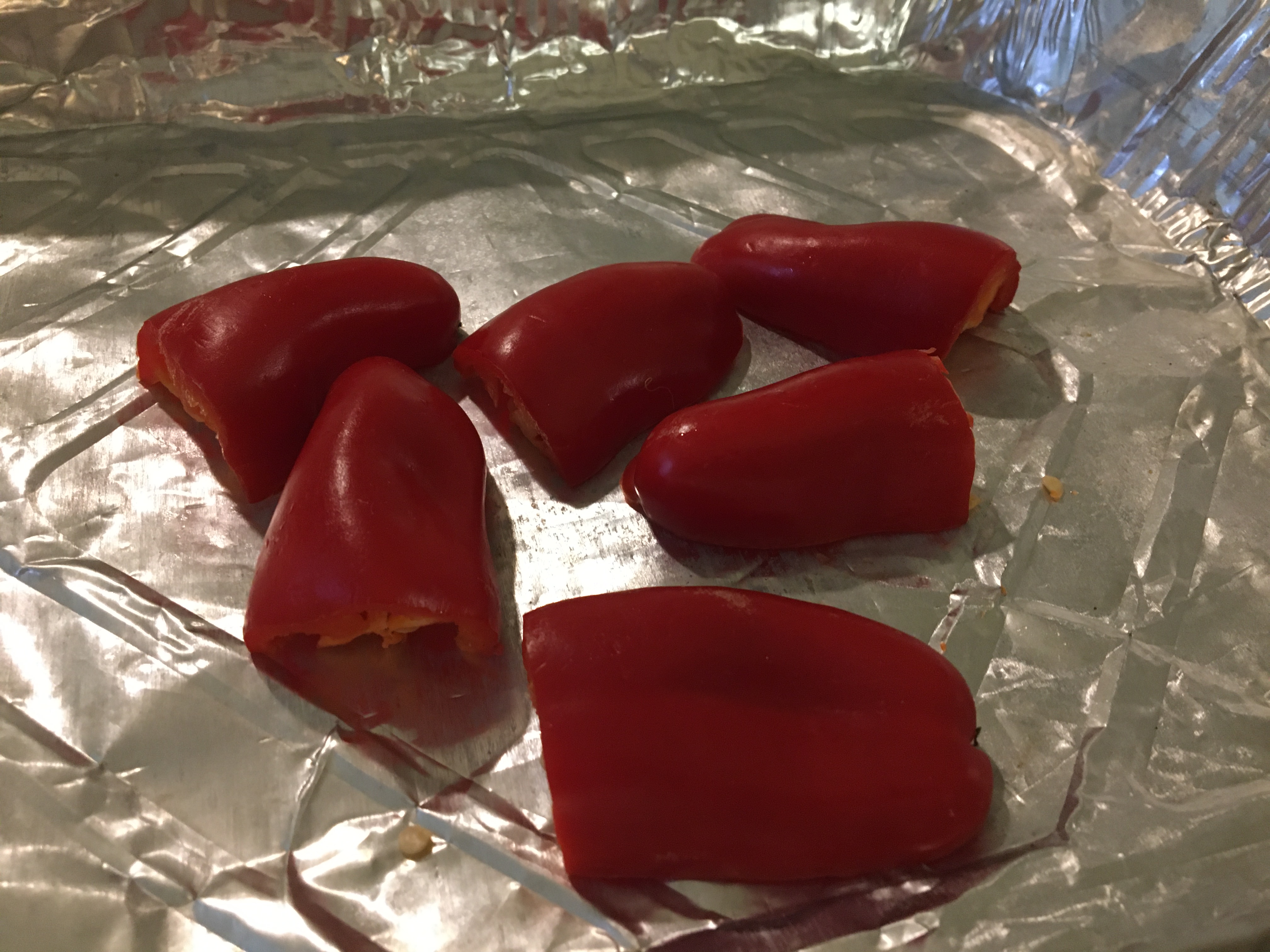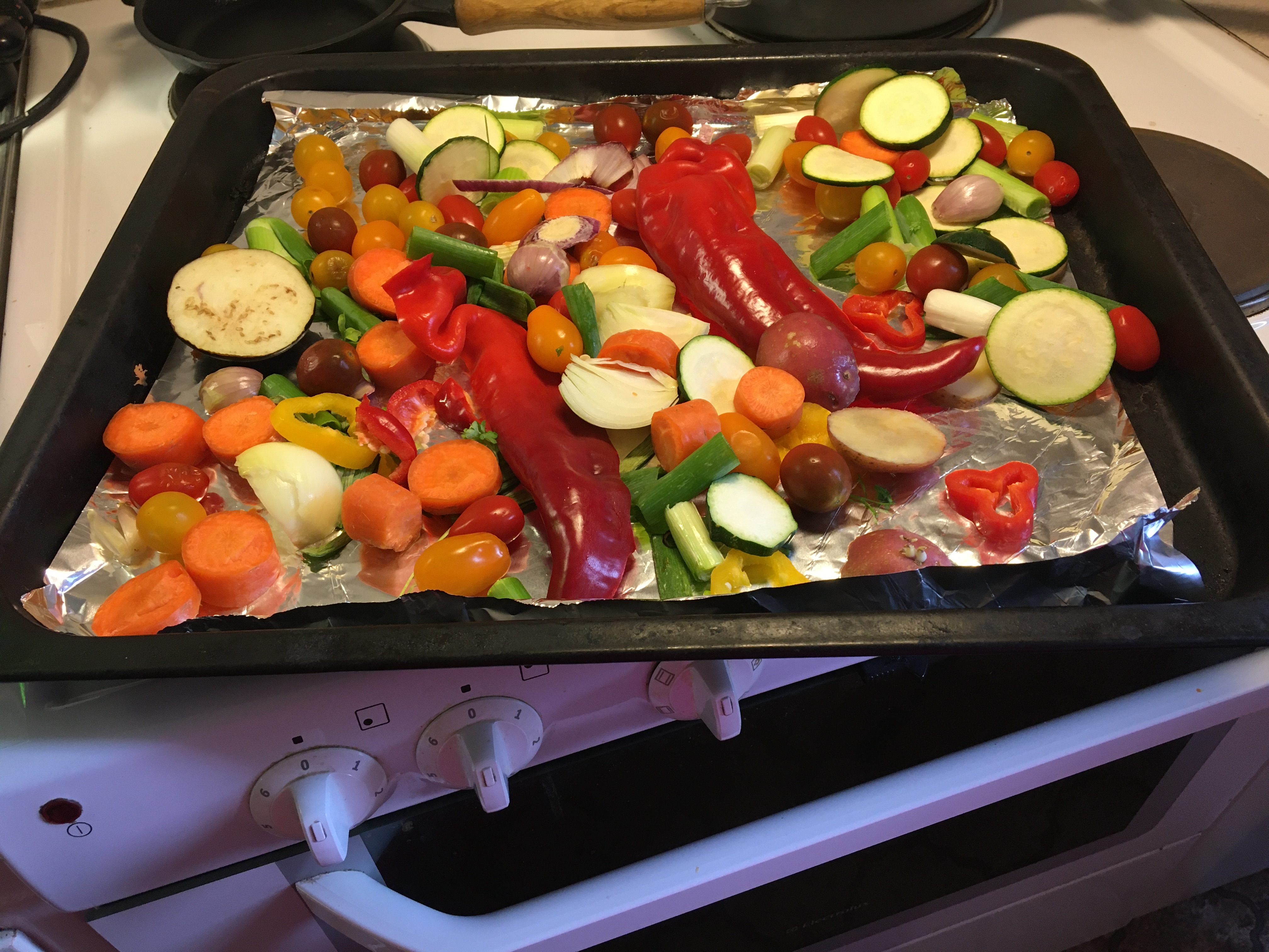 Slice the vegetables and place on a baking tray. Sprinkle some salt and olive oil over. Rost the vegetables in the oven until they have some color. Take out and if you wish take the skin off the peppers.