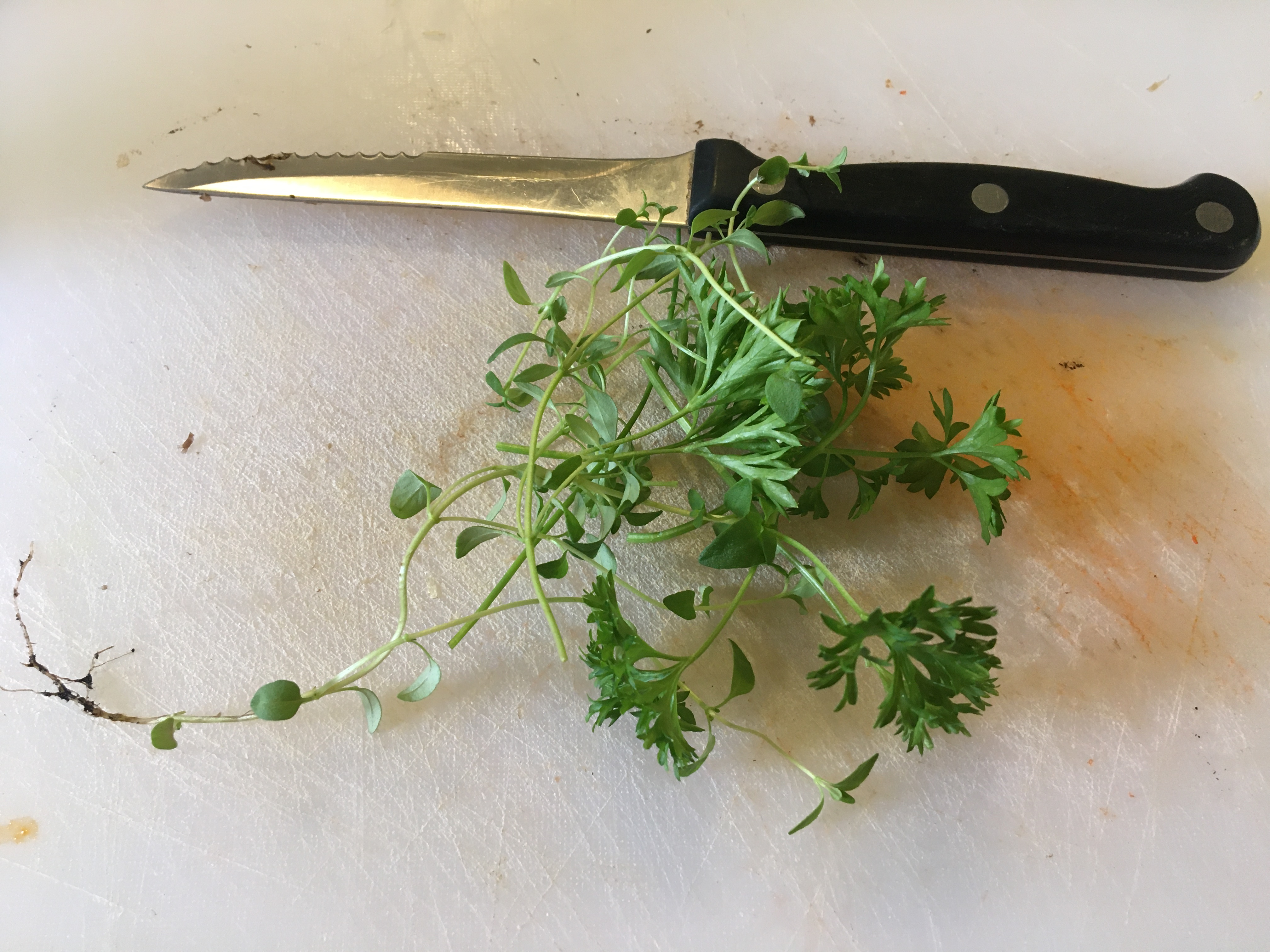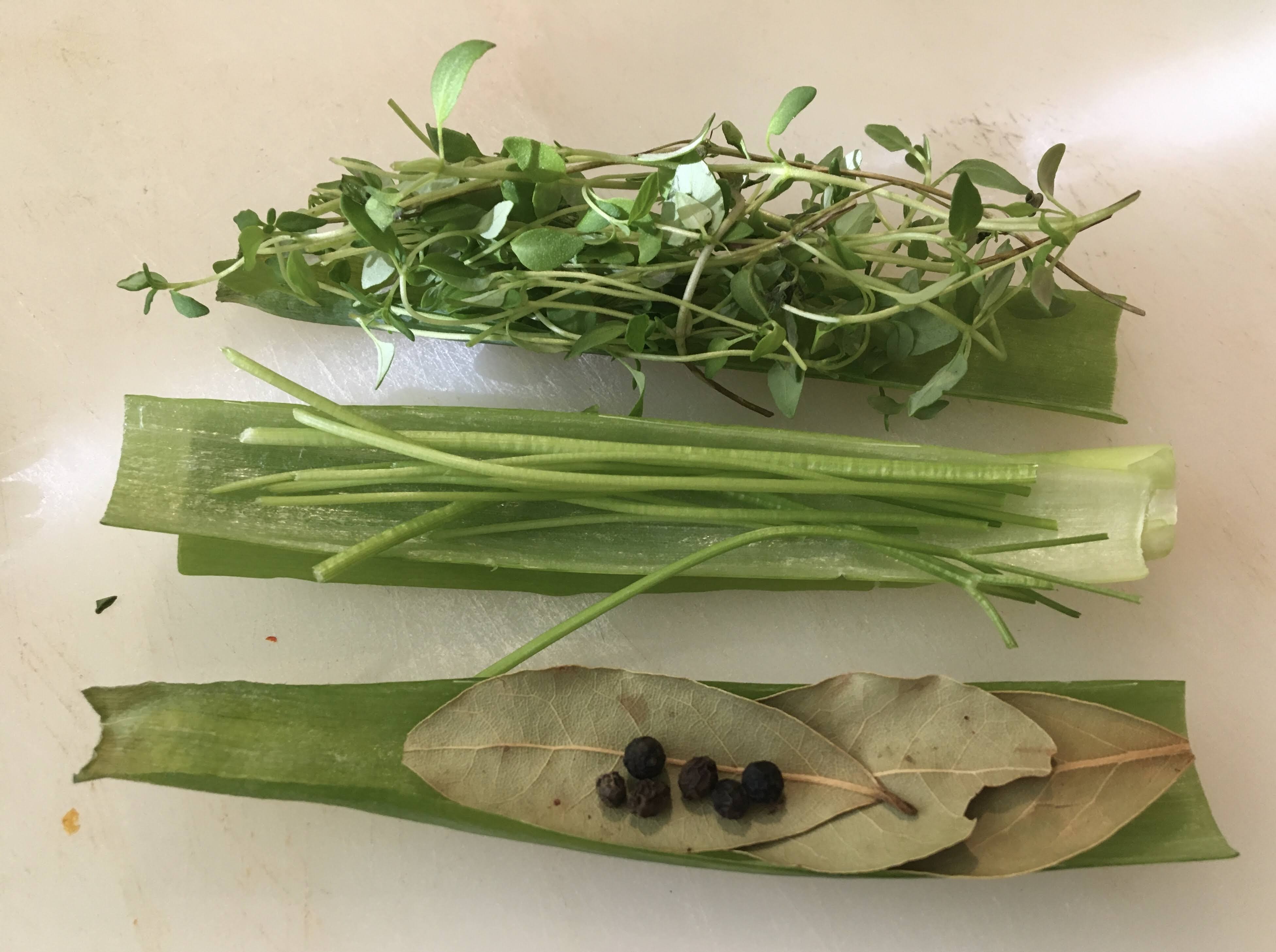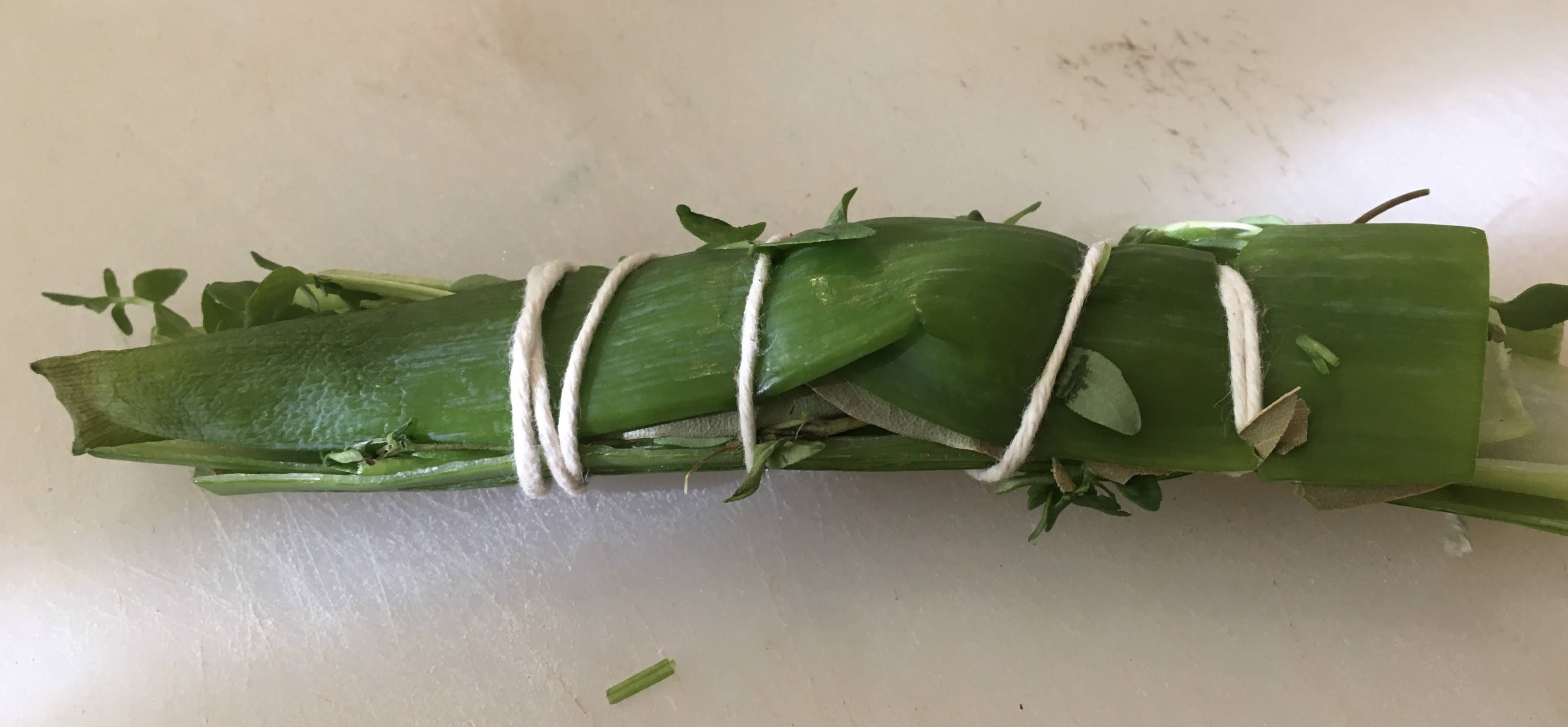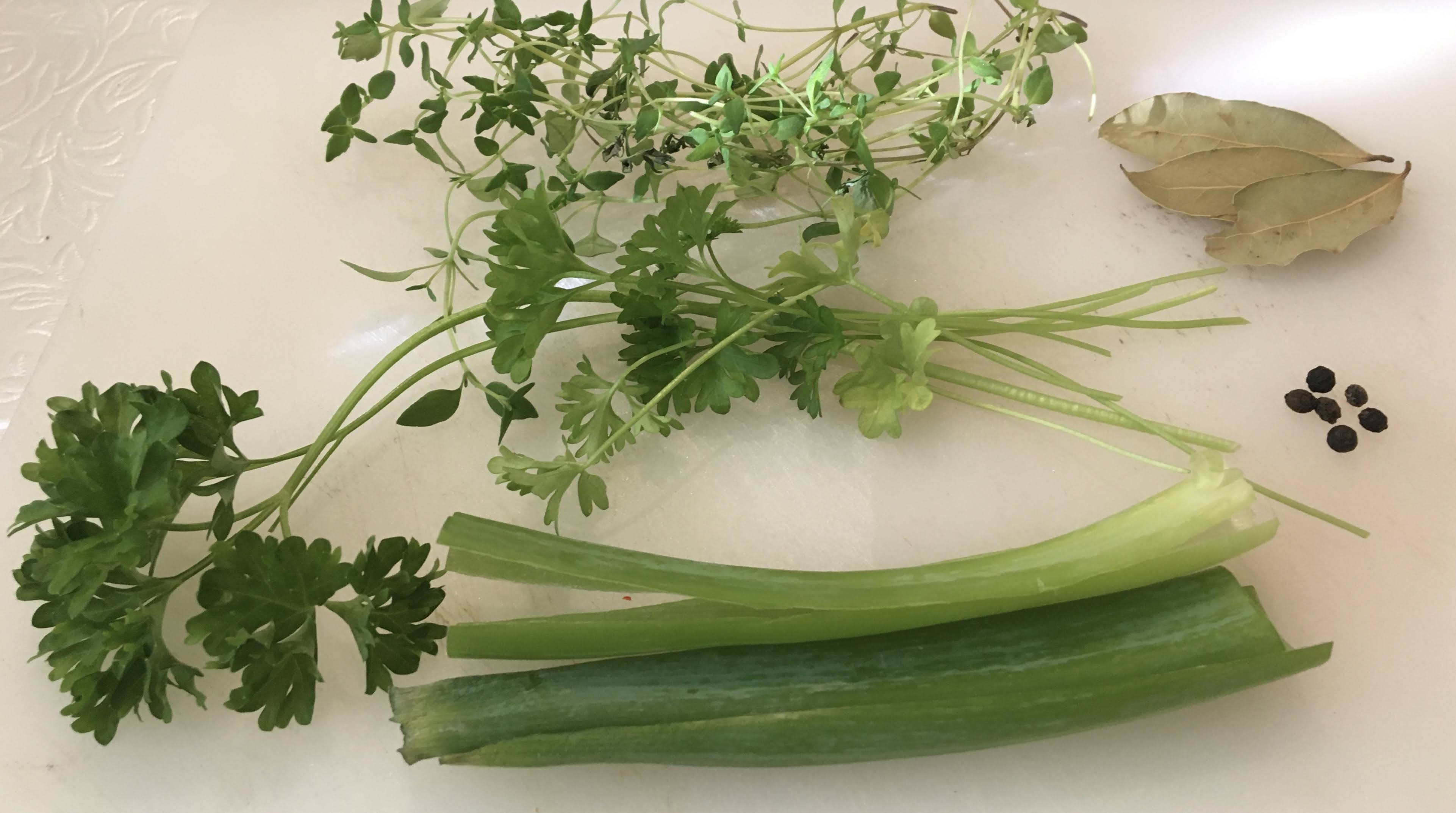 If you would like to use fresh herbs in your bouquet garni, an ideal combination is 4 or 5 sprigs of parsley, 1 or 2 sprigs of thyme, and 1 bay leaf. Gather the parsley and thyme sprigs, place the bay leaf on top, and use a piece of kitchen twine to bind it all together, keeping one piece of the string long enough so you can easily pull out the herb bundle.