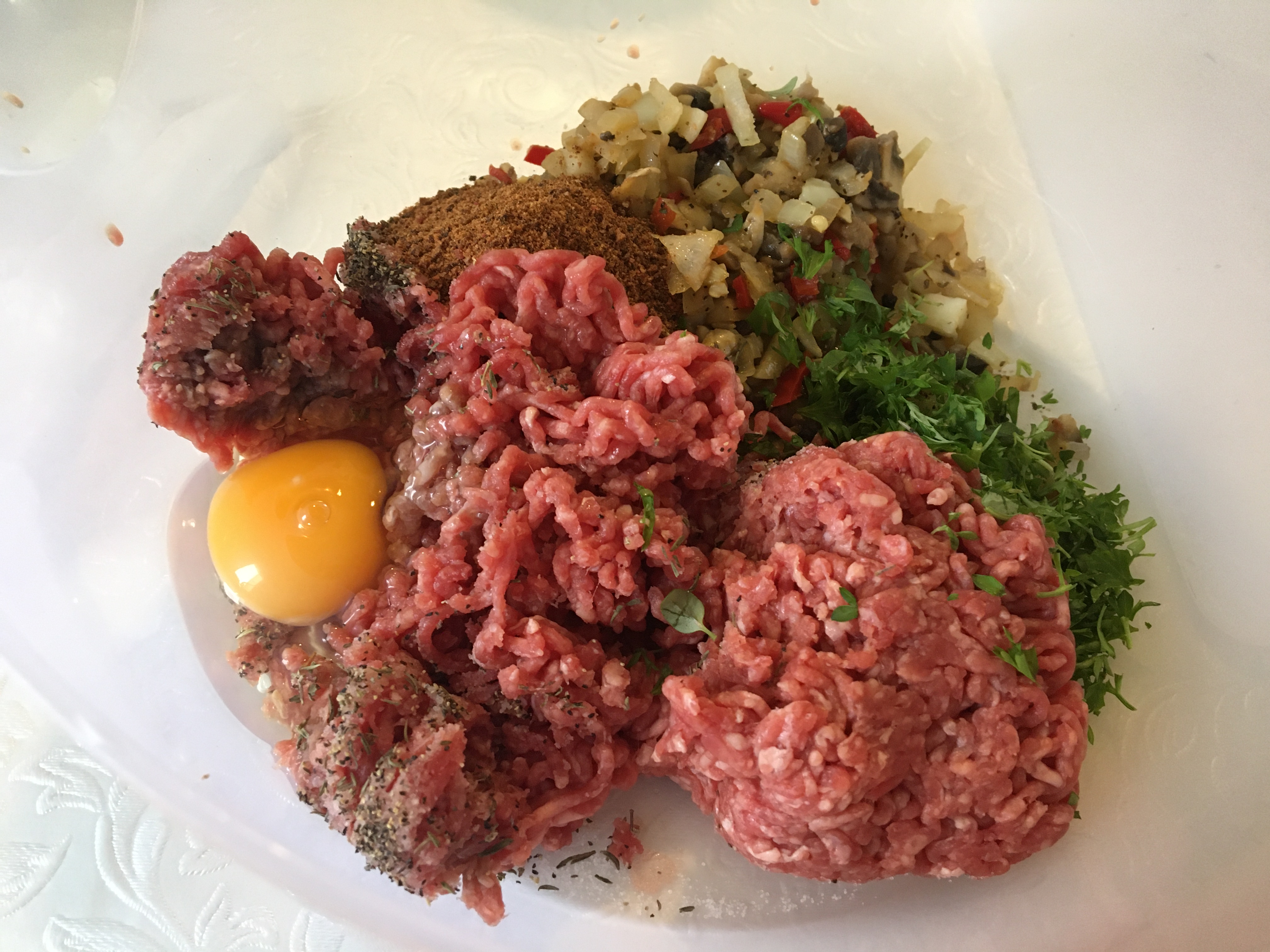 In a large bowl combine cooled mushrooms, beef, seasoning, onion, garlic breadcrumbs, egg and all ingredients until incorporated. Shape mixture into meatballs about 1 ½ inch (3, 8 cm) . Fry in small batches in butter in a frying pan.
