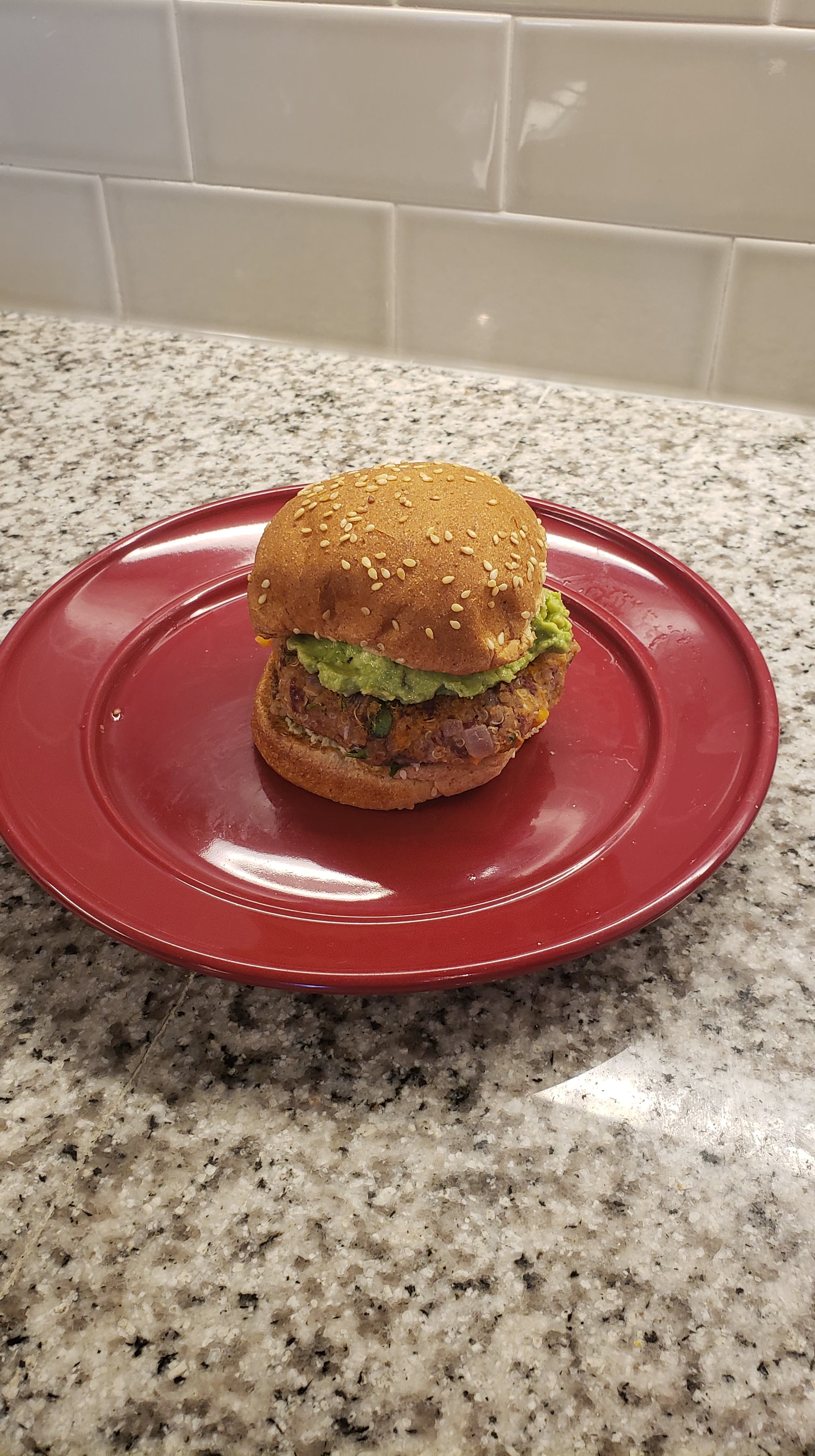 Assemble the burger. Place the burger on a bun of your choice. Top with beetroot hummus. Add some slices of Avacado. Enjoy!