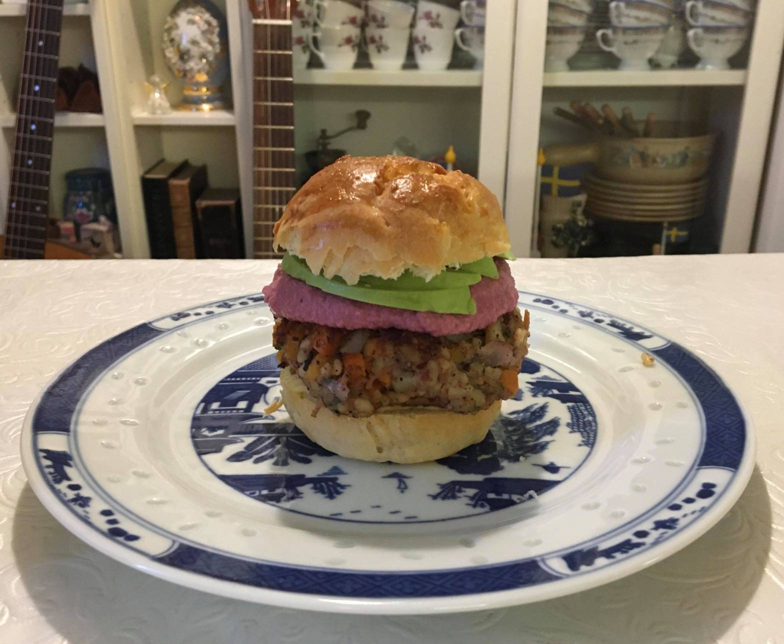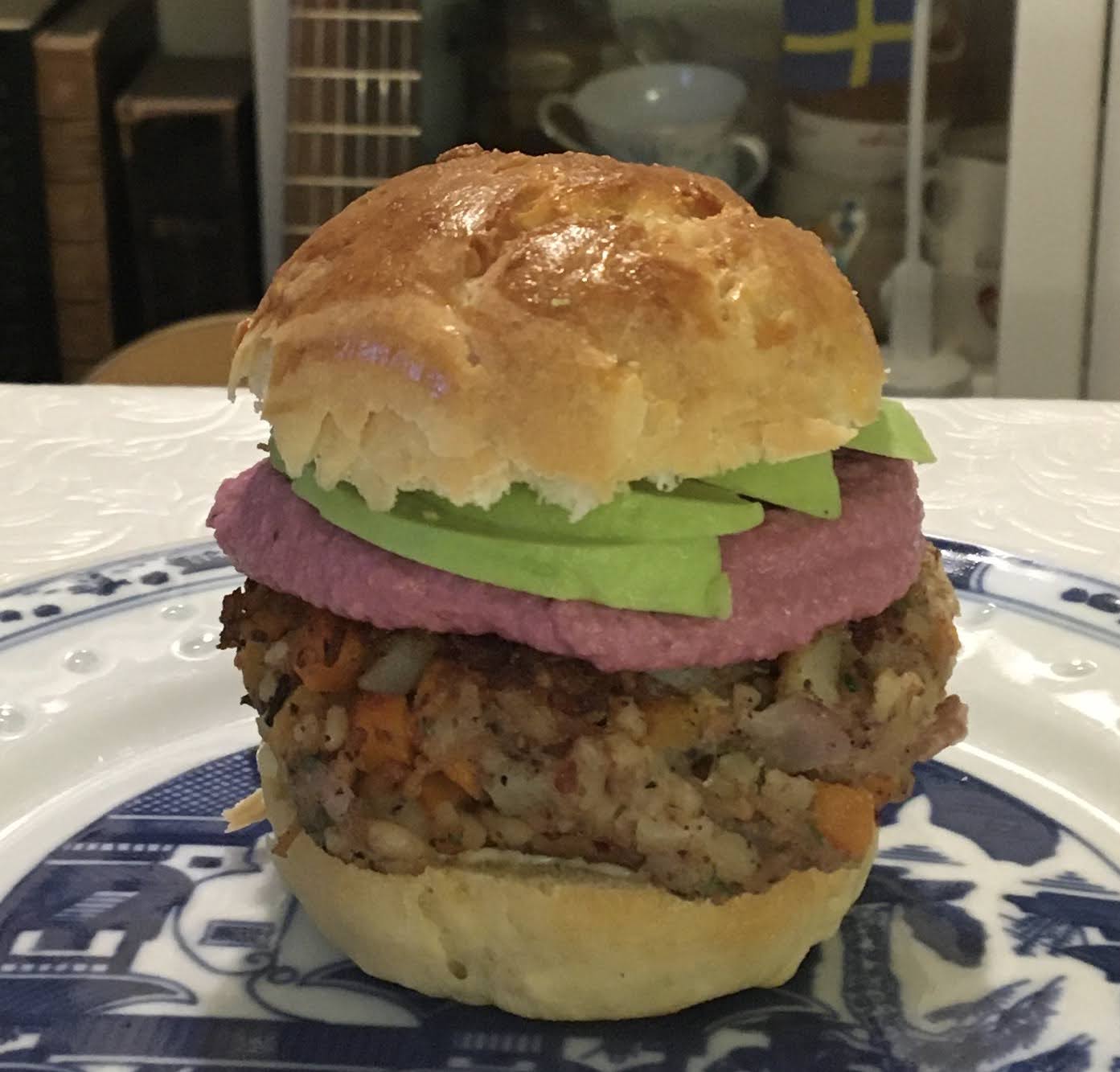 Serve on a bun with (vegan) mayo, avocado and some beetroot hummus!