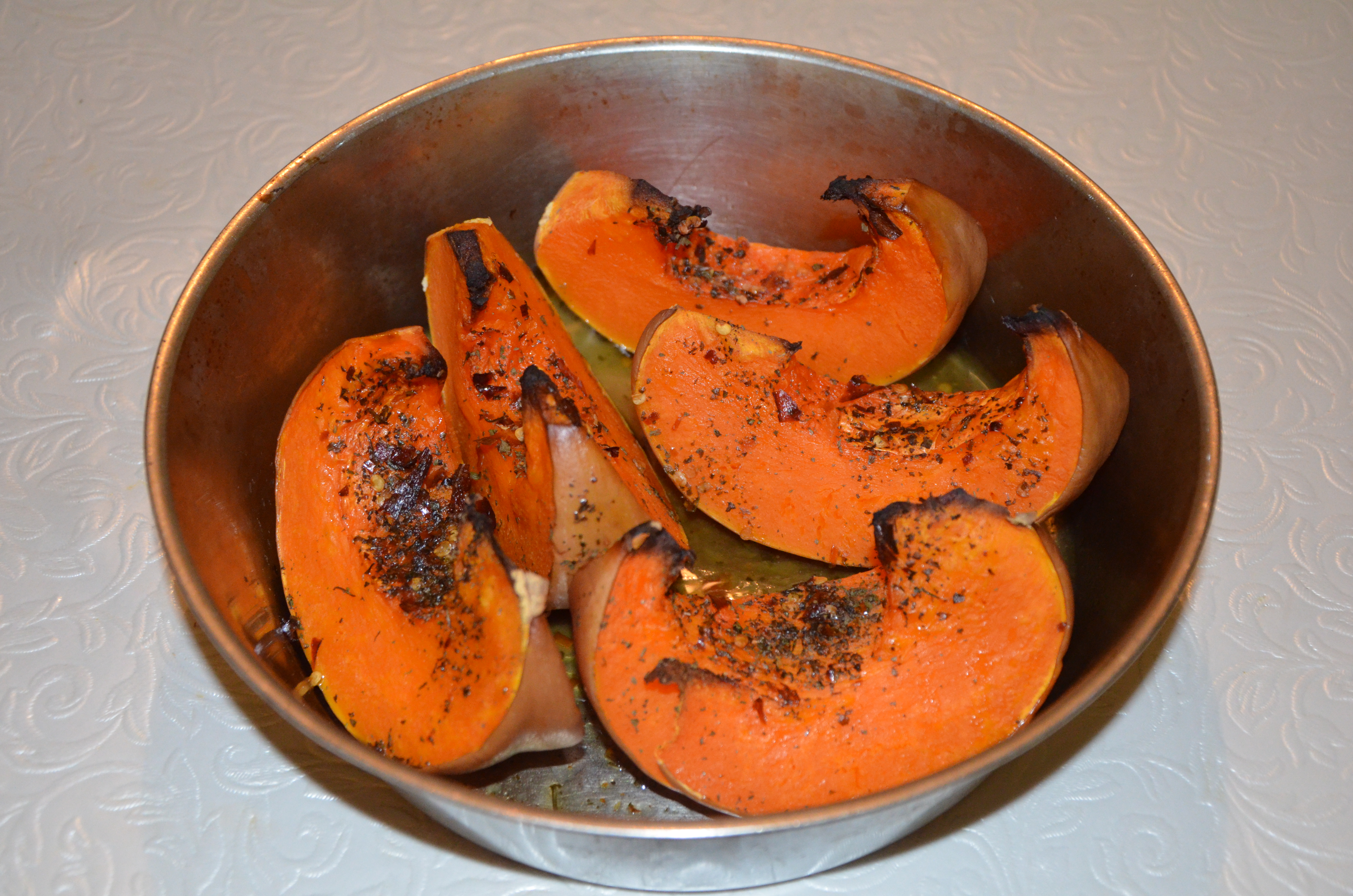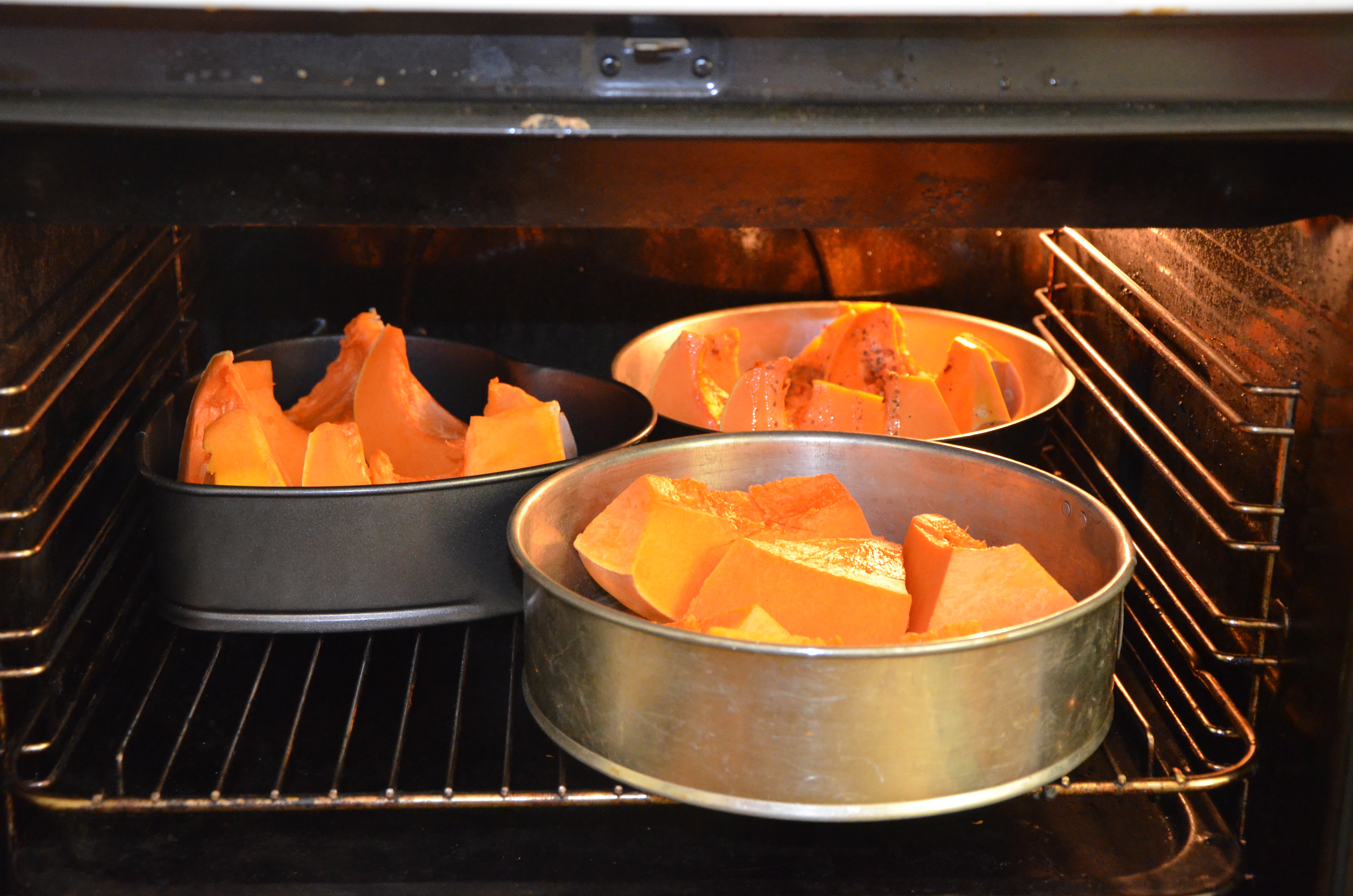 Sprinkle the spices over the pumpkin with some black pepper. Roast the pumpkin for 1 hour, or until soft and slightly caramalised at the edges.