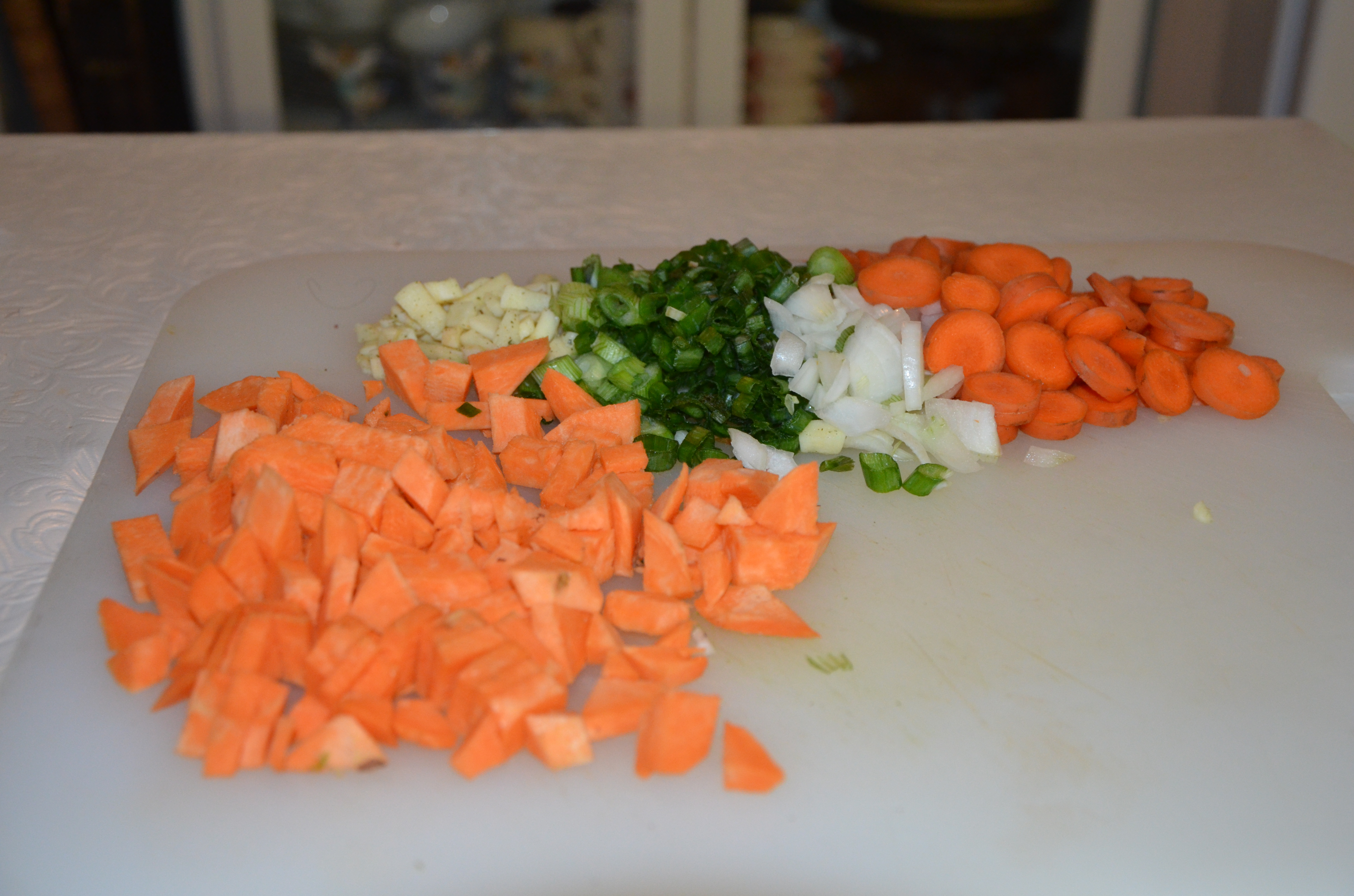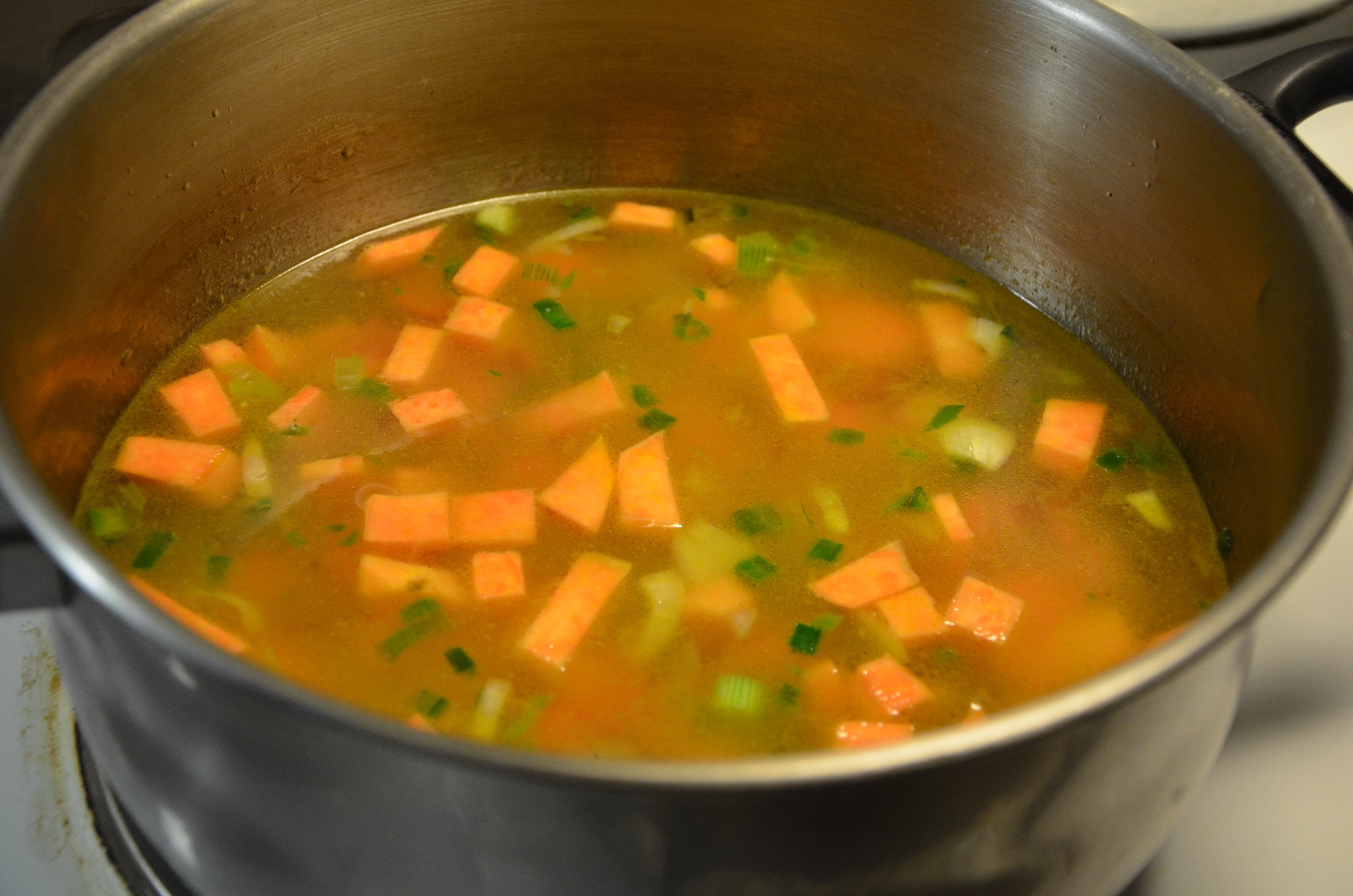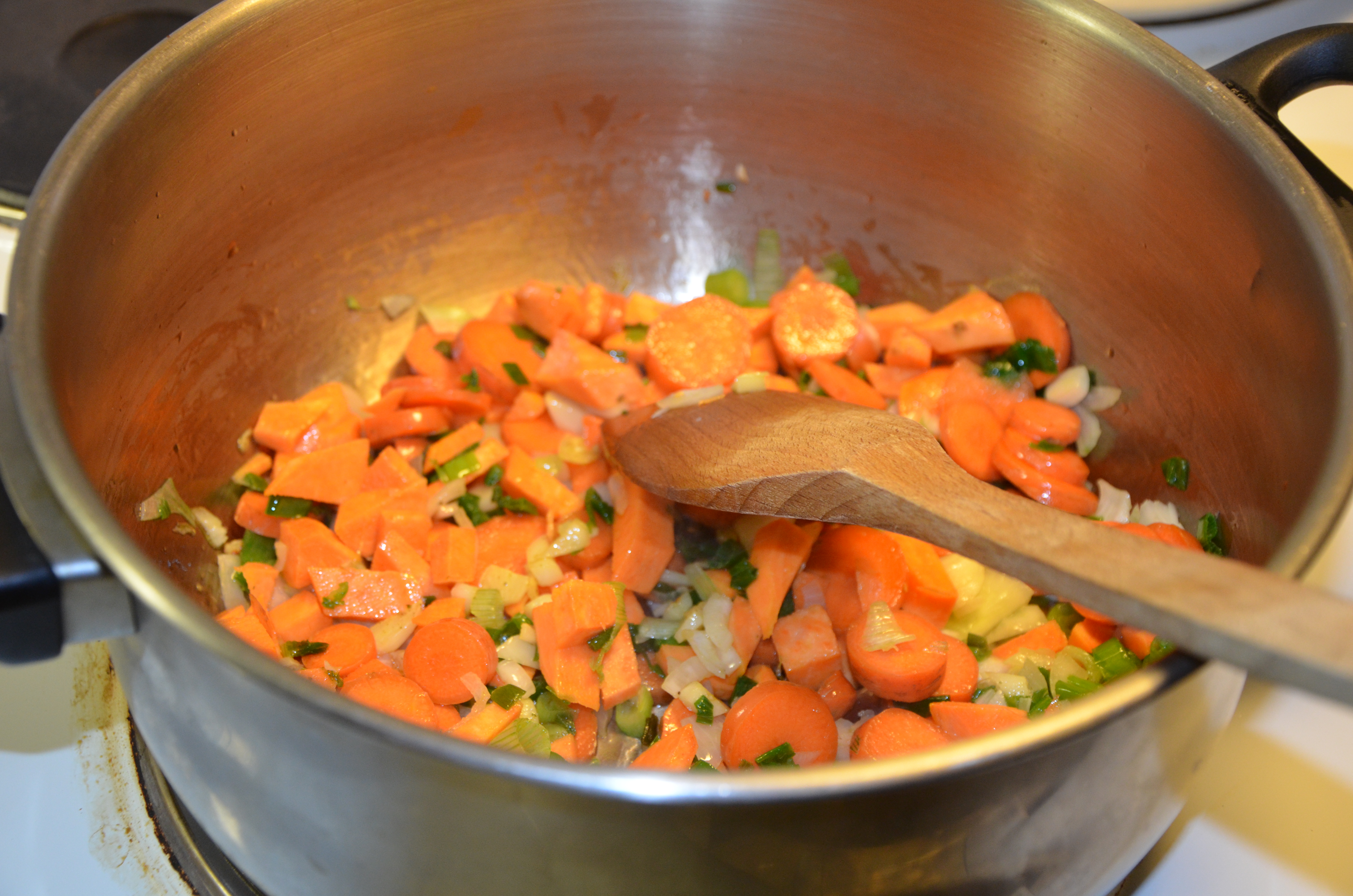 Meanwhile, roughly chop the onion, garlic, carrot and sweet potatoes. Heat a little olive oil over a medium heat in a large saucepan then add the vegetables. Wok until a bit soft but not colored, add the cumin and cinnamon. Add the stock and cook for 15 minutes.
