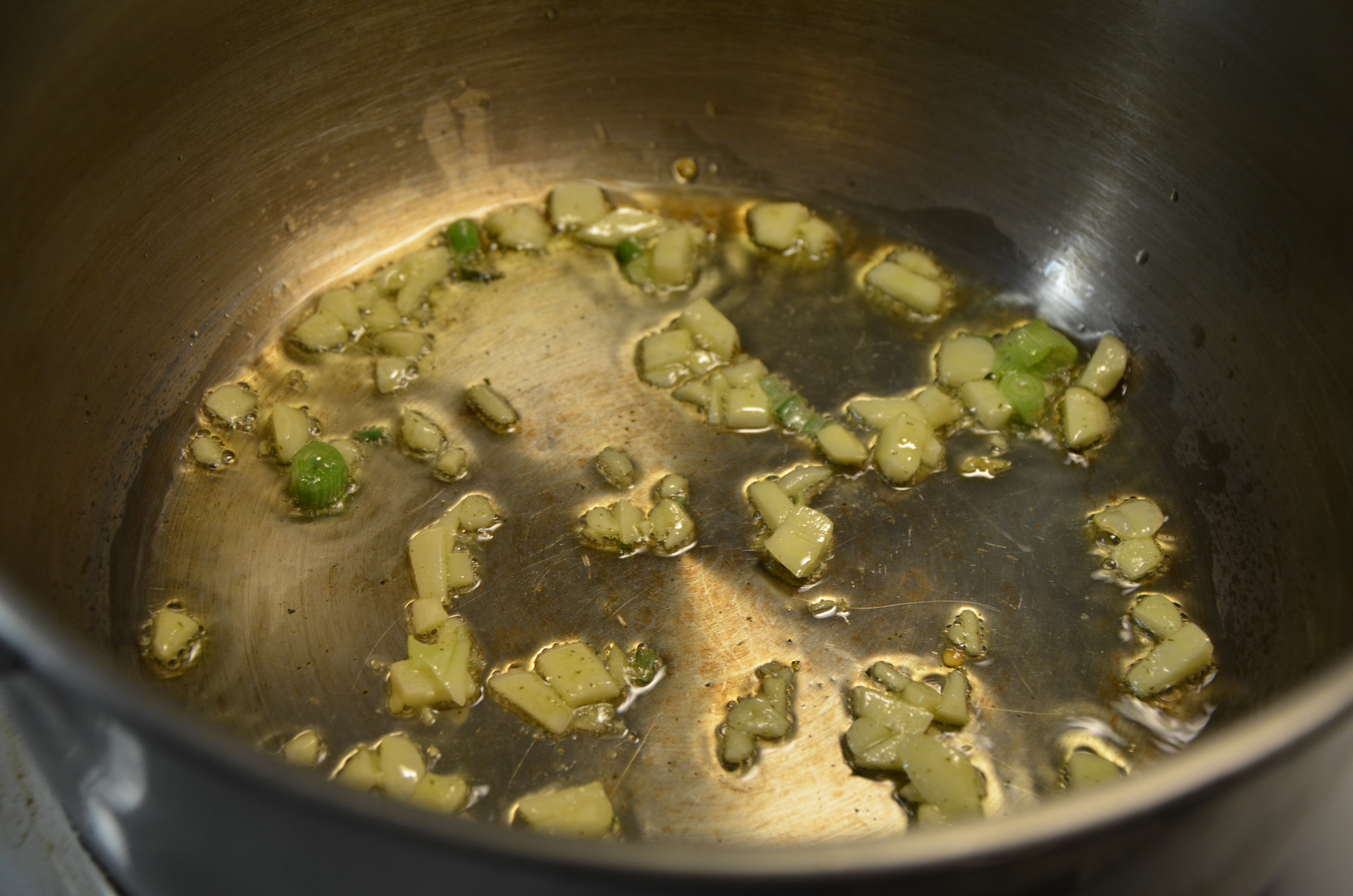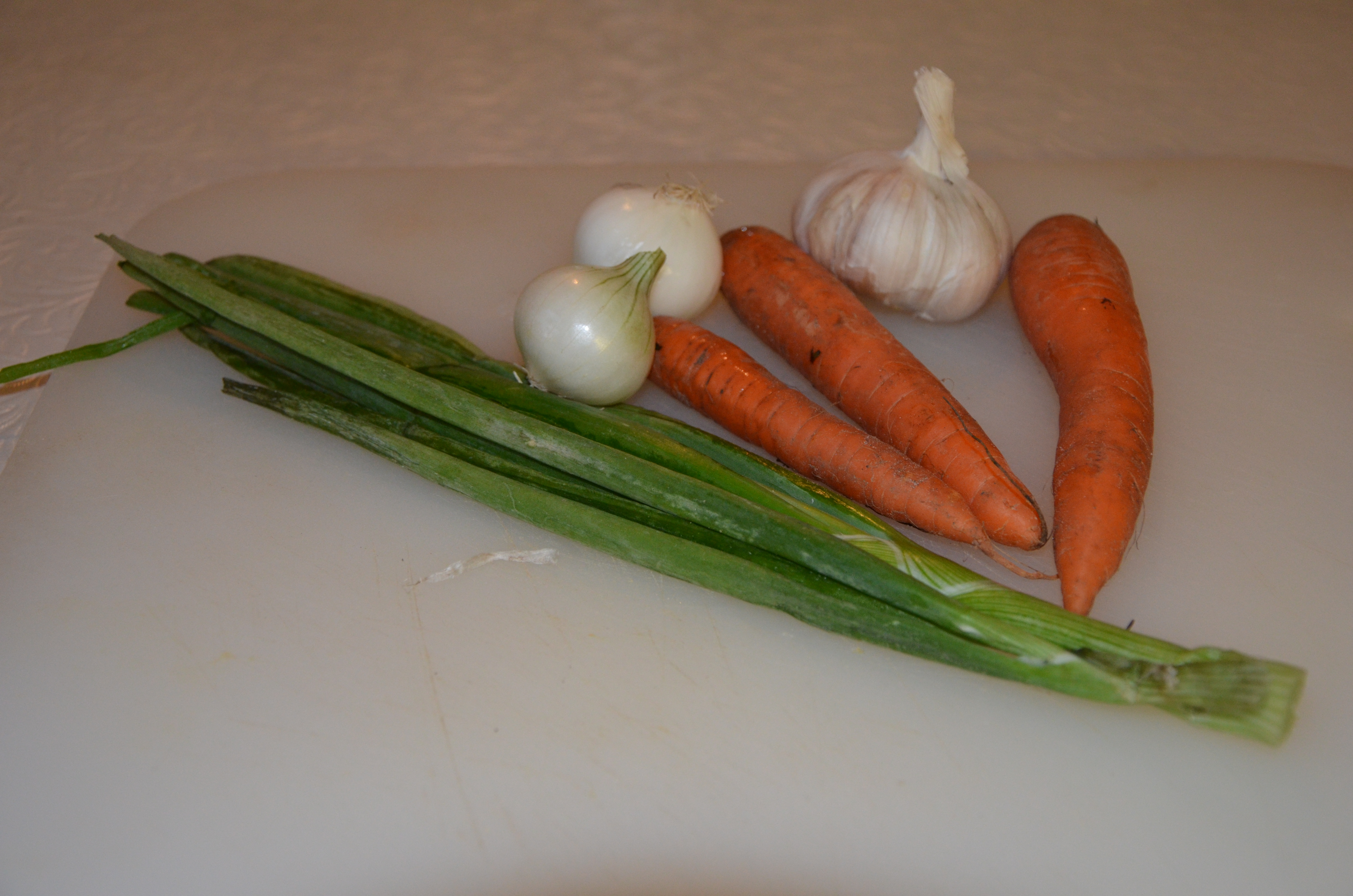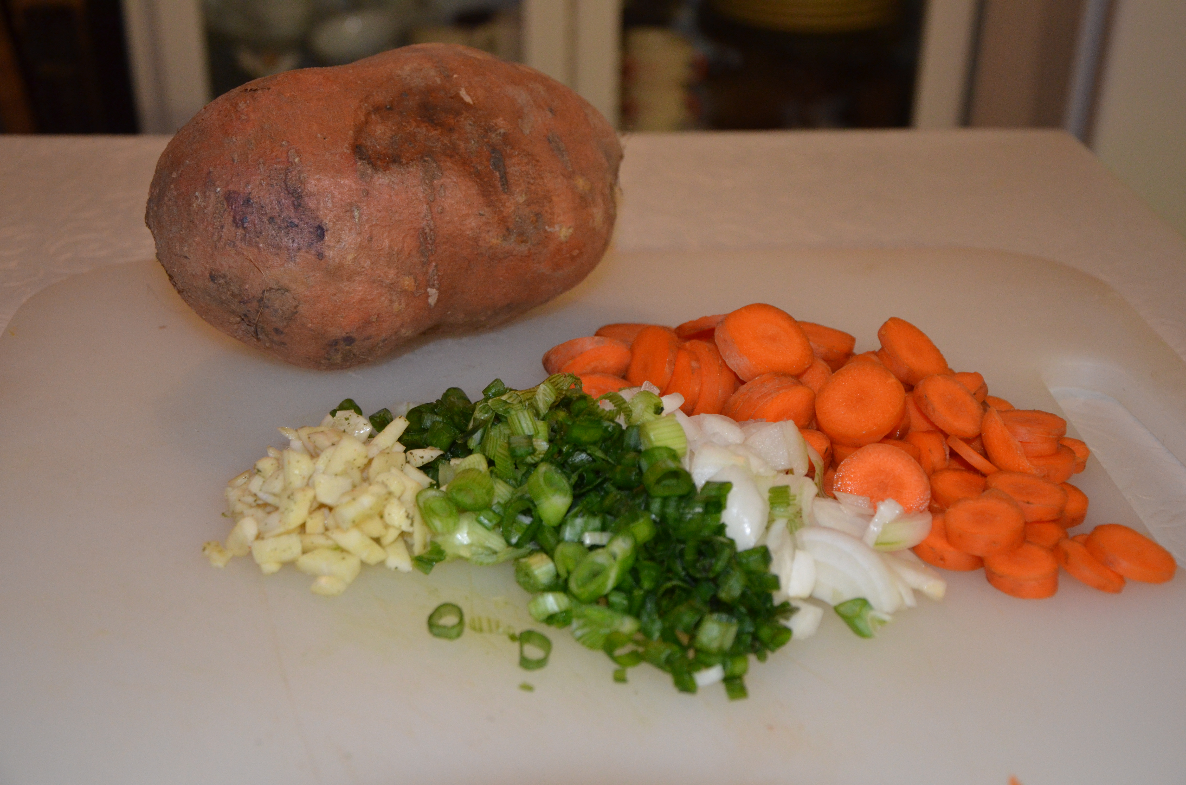 Meanwhile, roughly chop the onion, garlic, carrot and sweet potatoes. Heat a little olive oil over a medium heat in a large saucepan then add the vegetables. Wok until a bit soft but not colored, add the cumin and cinnamon. Add the stock and cook for 15 minutes.