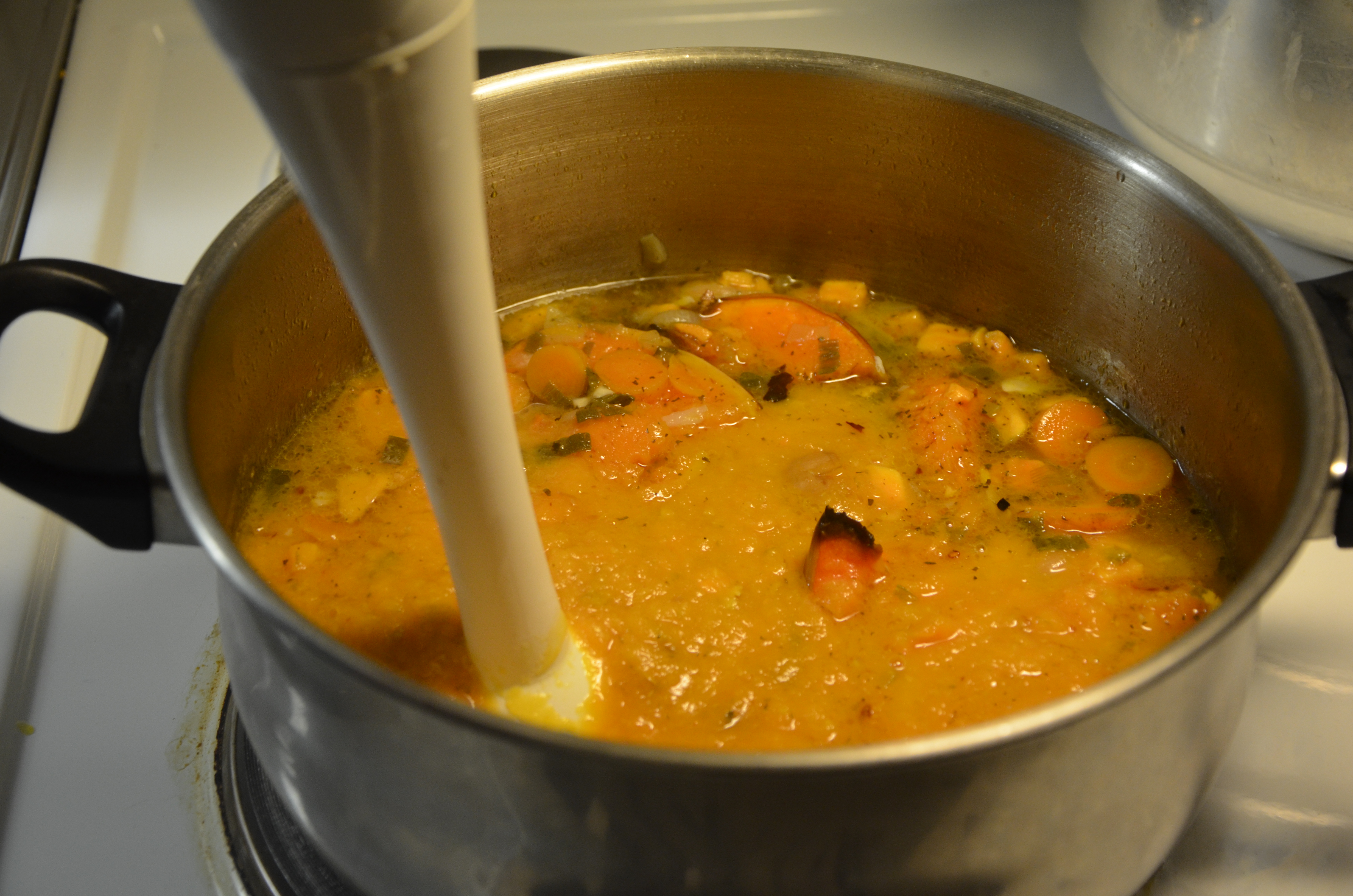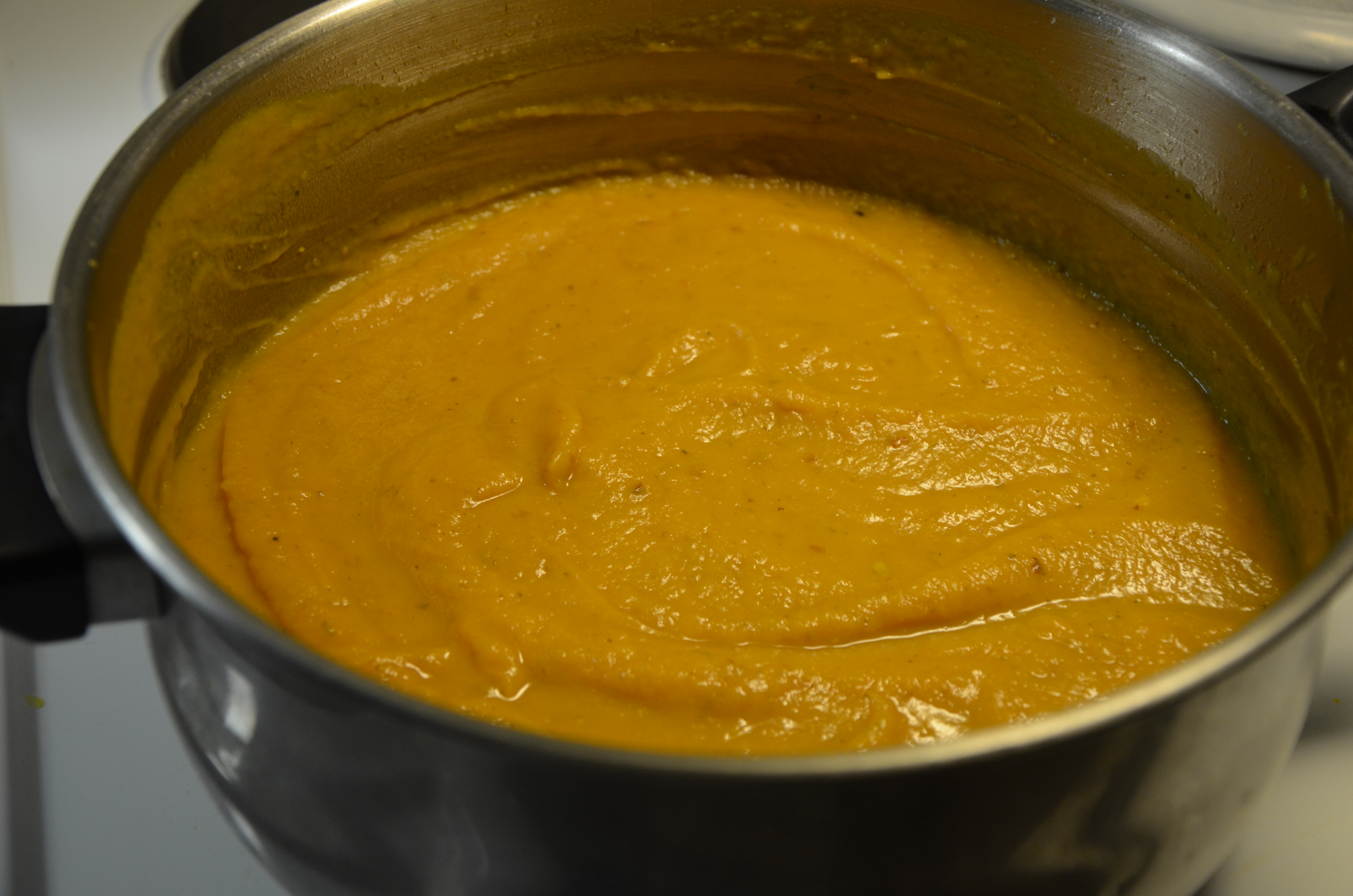 When the pumpkin is ready, add to the pan with the hot stock. Blend with a stick blender, adding a little more water if you like a thinner consistency. If you want more spices add to your liking. If you want the soup really smooth press it through a sift and put it back in the pan an do the final tasting.