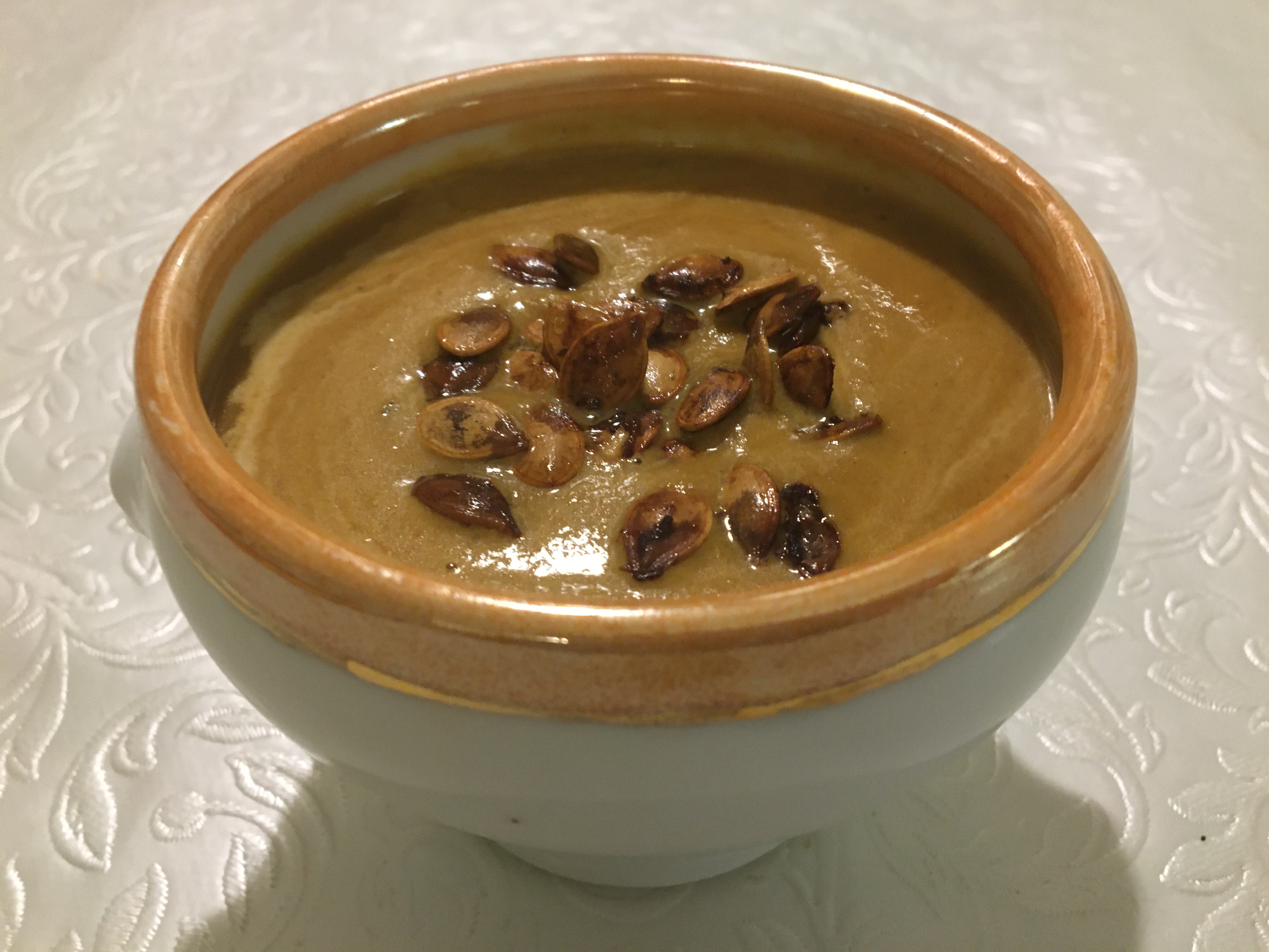 When serving you can mix in a click of natural yogurt and swirl it around a bit. Sprinkle some roasted pumpkin seeds on top.