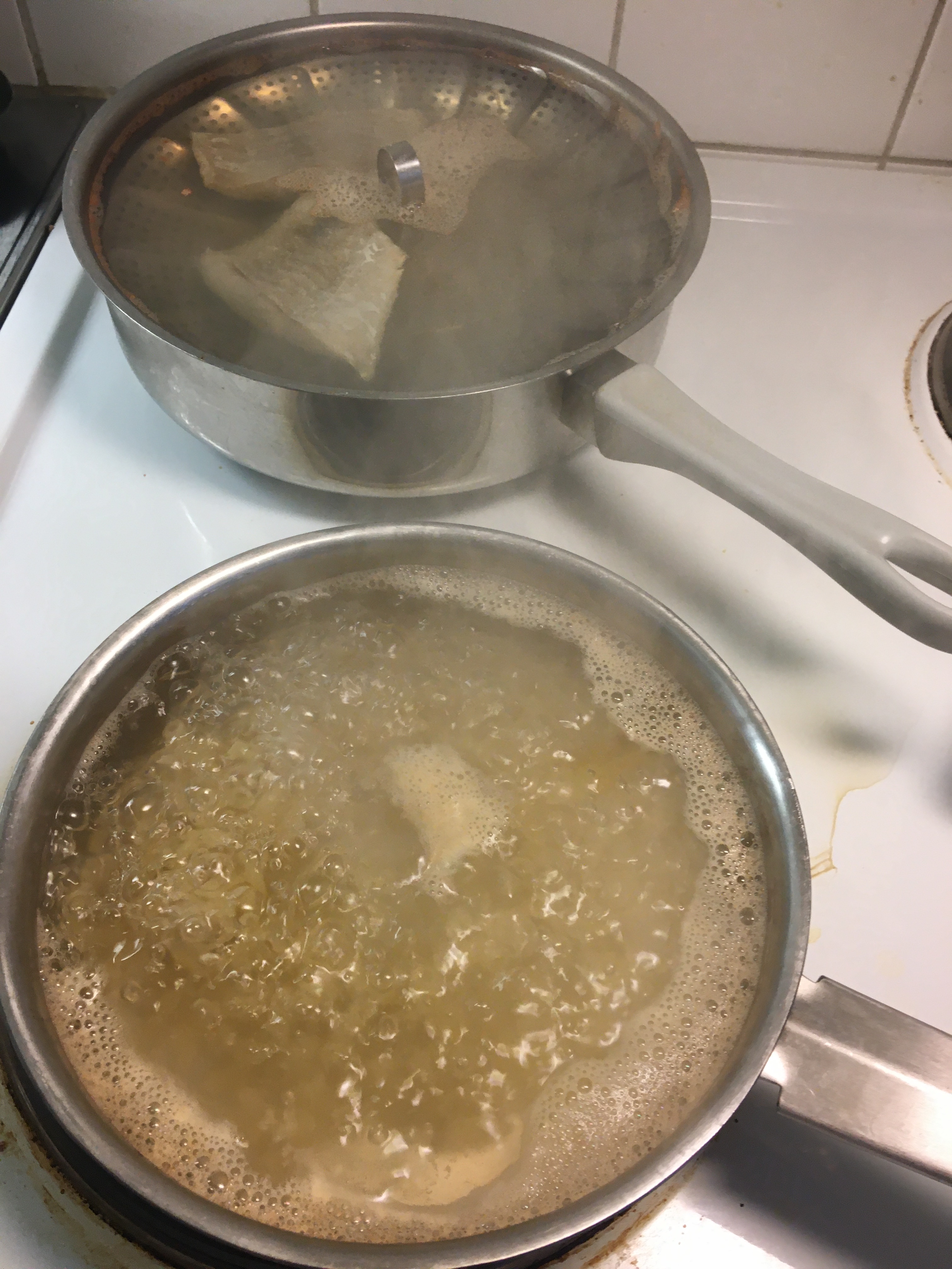 Boil water with a little salt in a pan. Bring to a boil. Reduce heat to simmering and add the fishfilés to simmer. You need to preboil the fish if you use raw fish. Otherwise the moist from the fish would ruin the caserole. If you use already boiled fish you can skip this step.