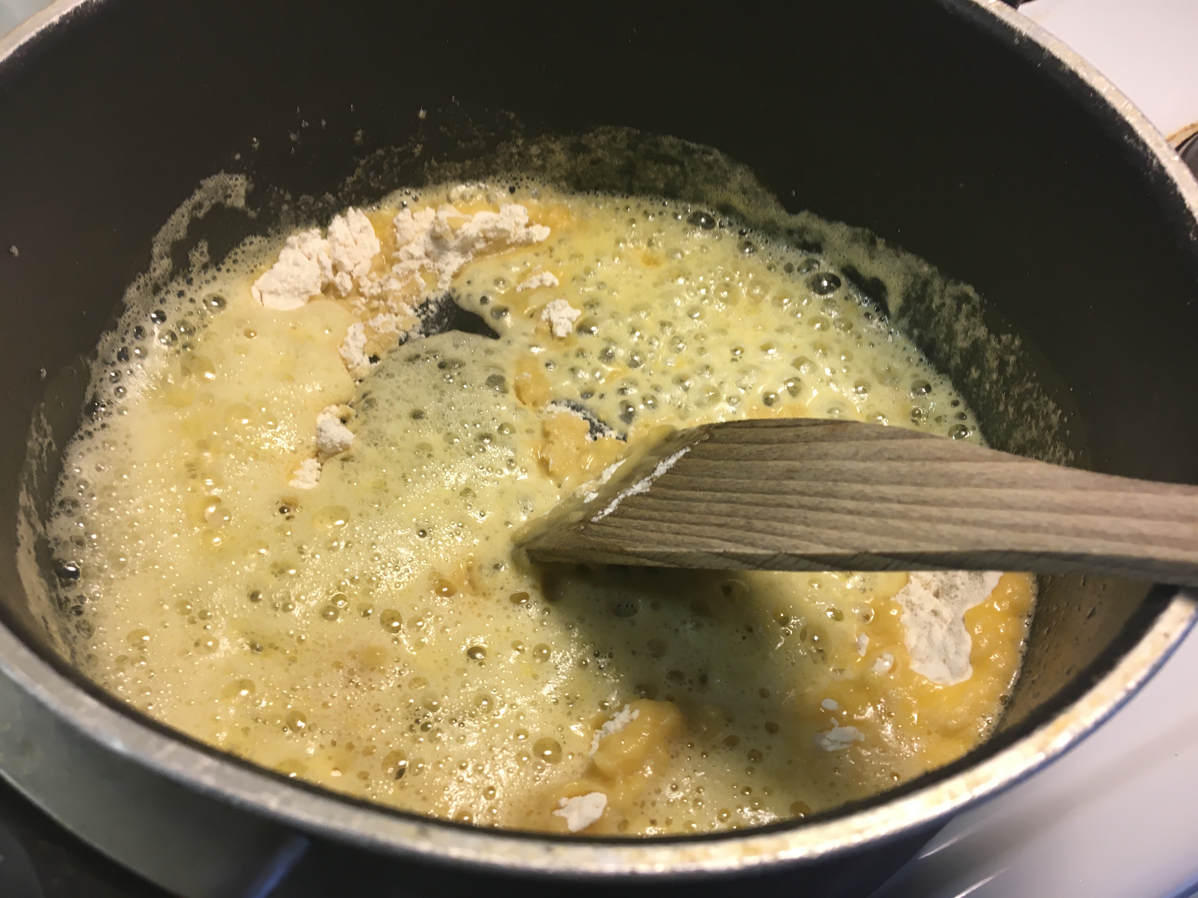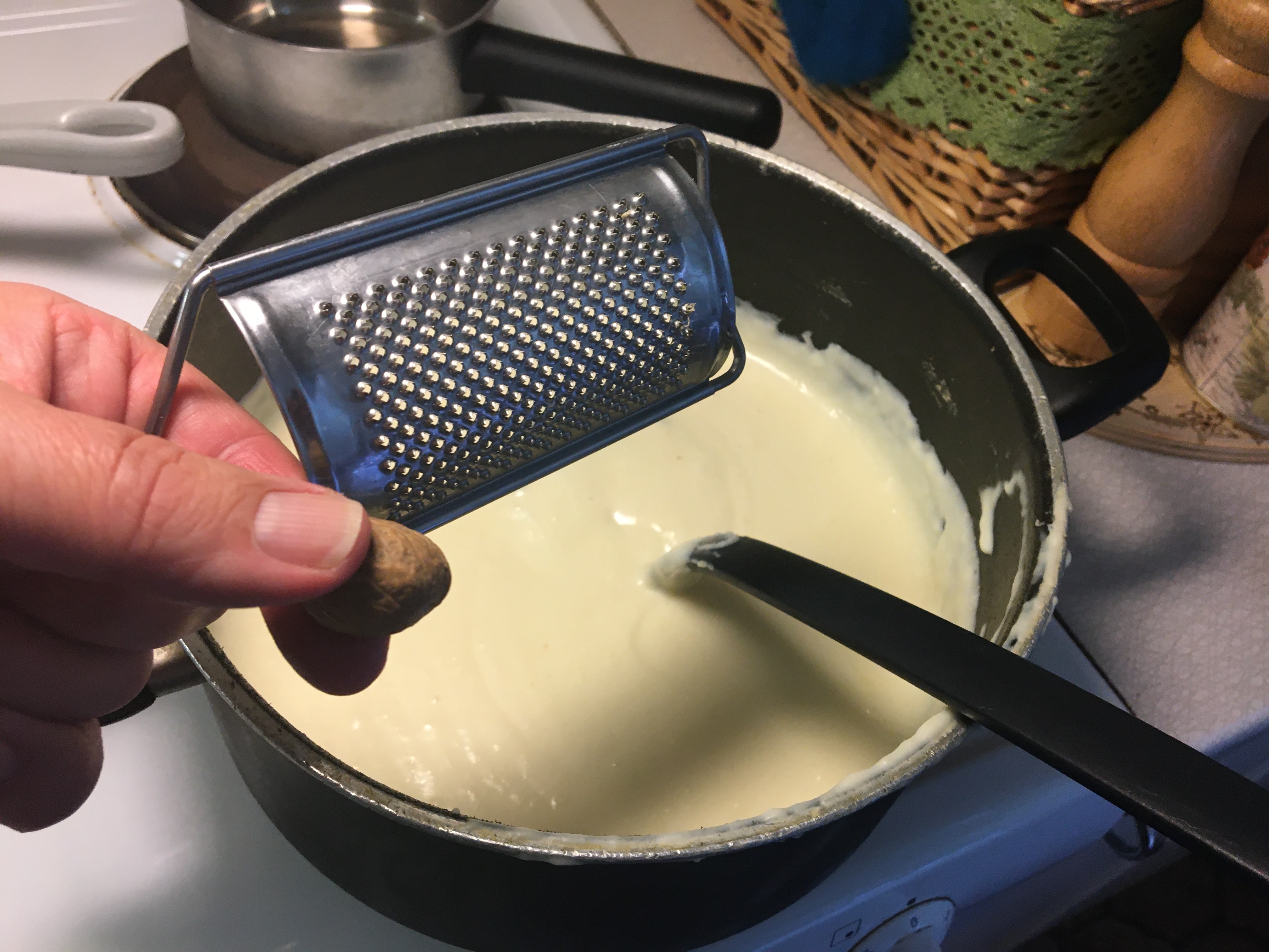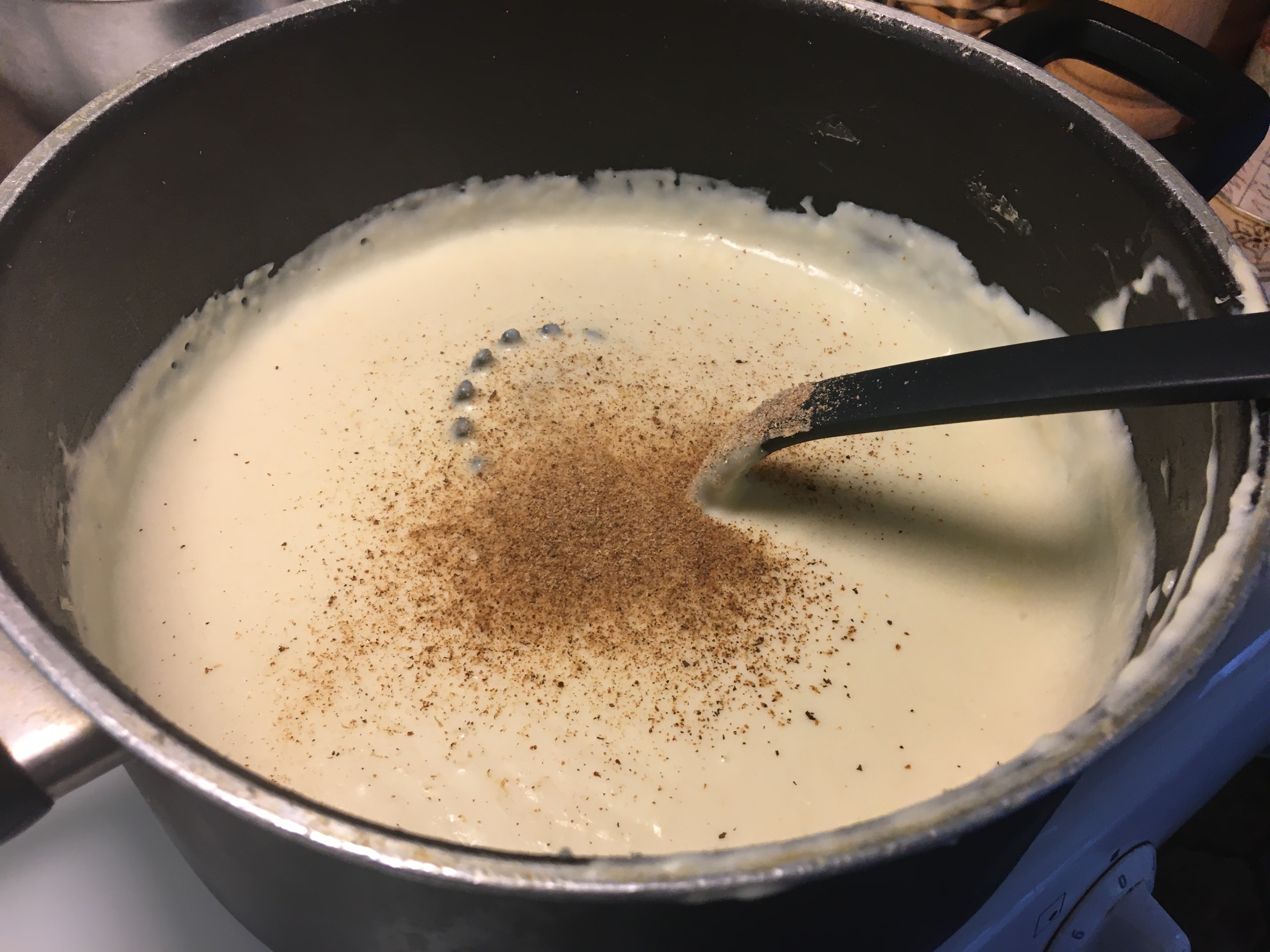 Make the Bechamelsauce. Melt butter in a saucepan and add the flour. Whisk and start adding a little of the milk at a time. To avoid getting lumps you add a little milk and whisk until your sauce start to bubble a little again and you have whisked out all the lumps. Than add more milk repeat procedure. Whisk so you mix to a smooth consistency and thickness until all milk is in and you have no lumps.