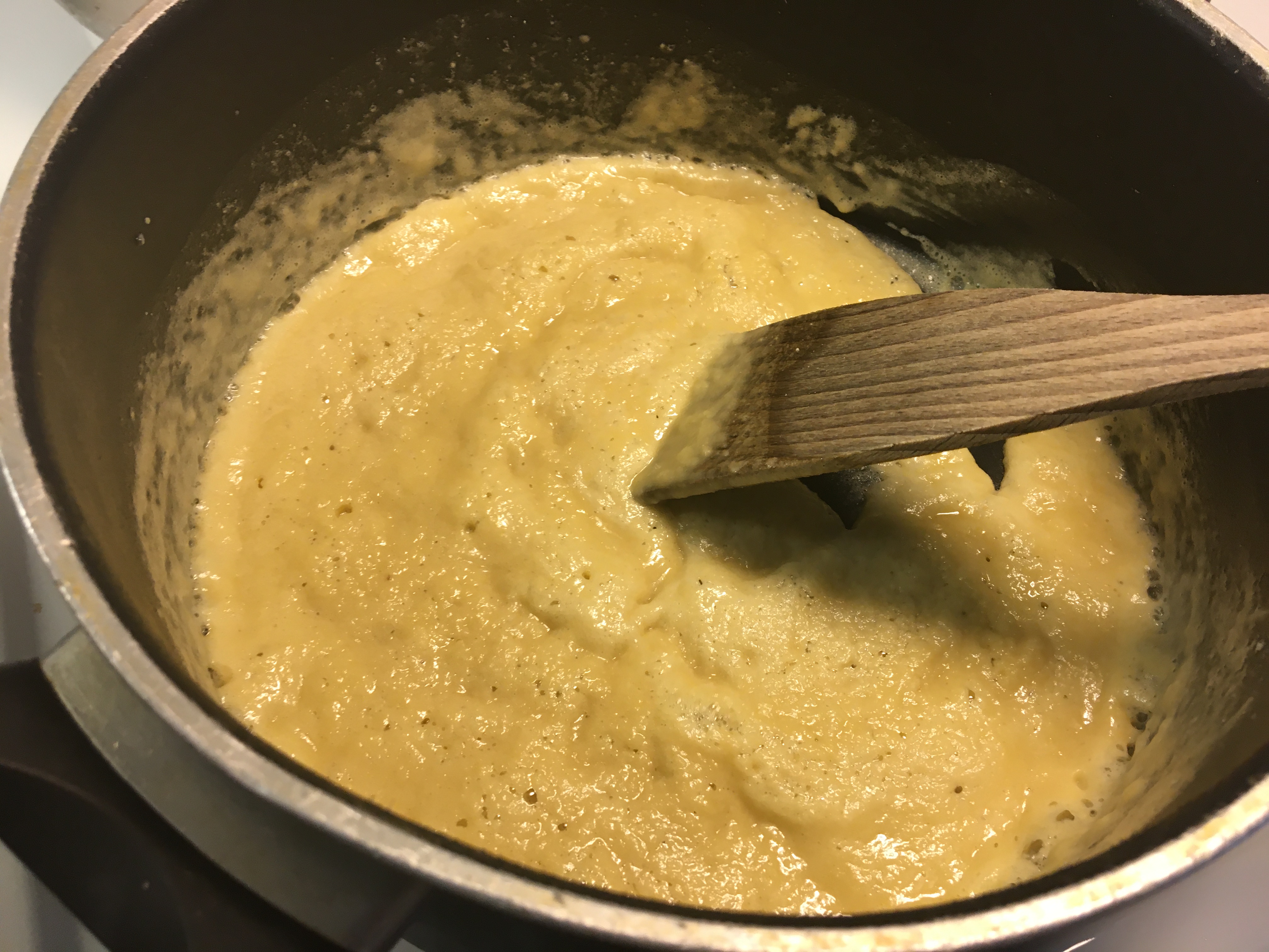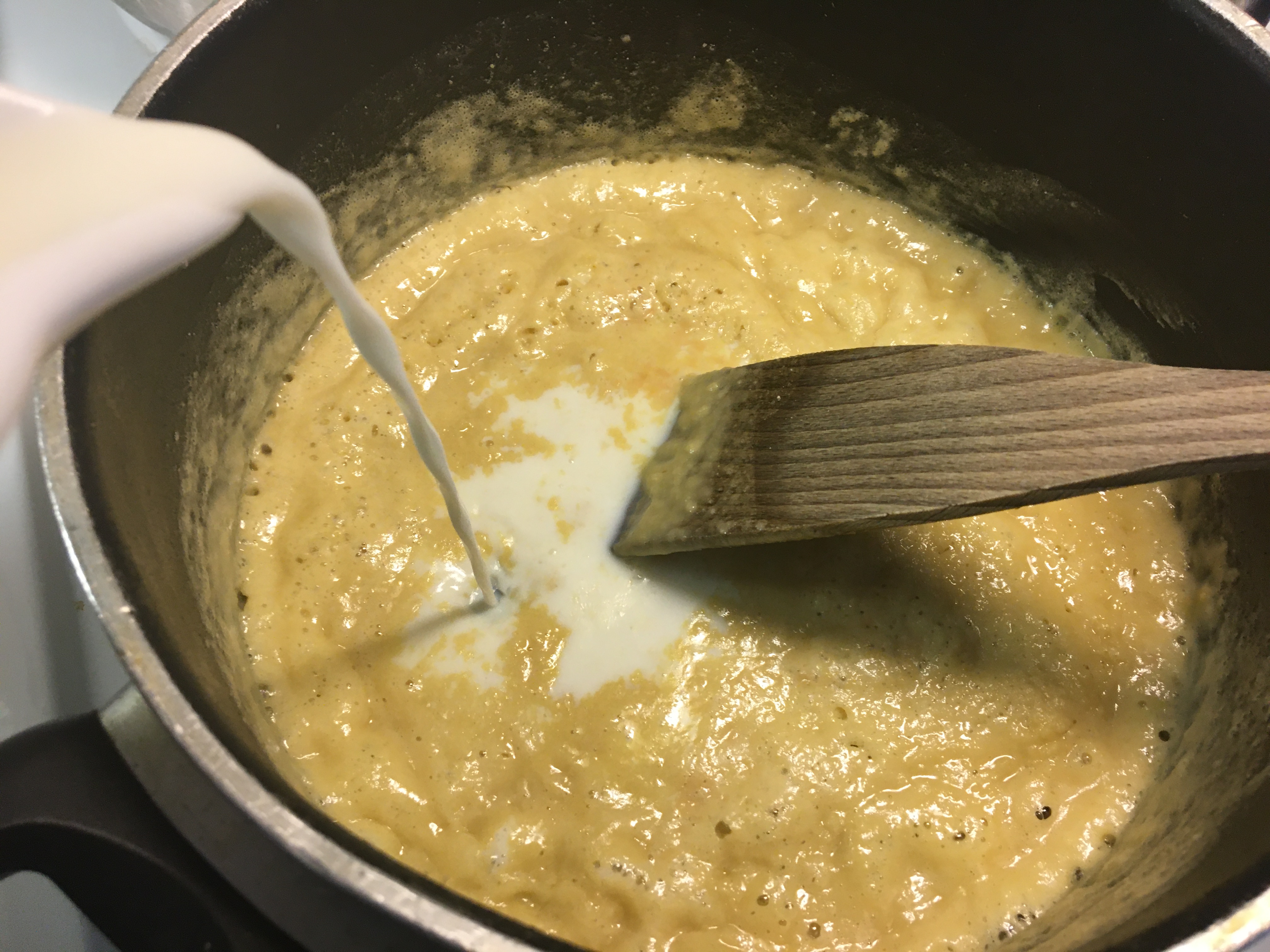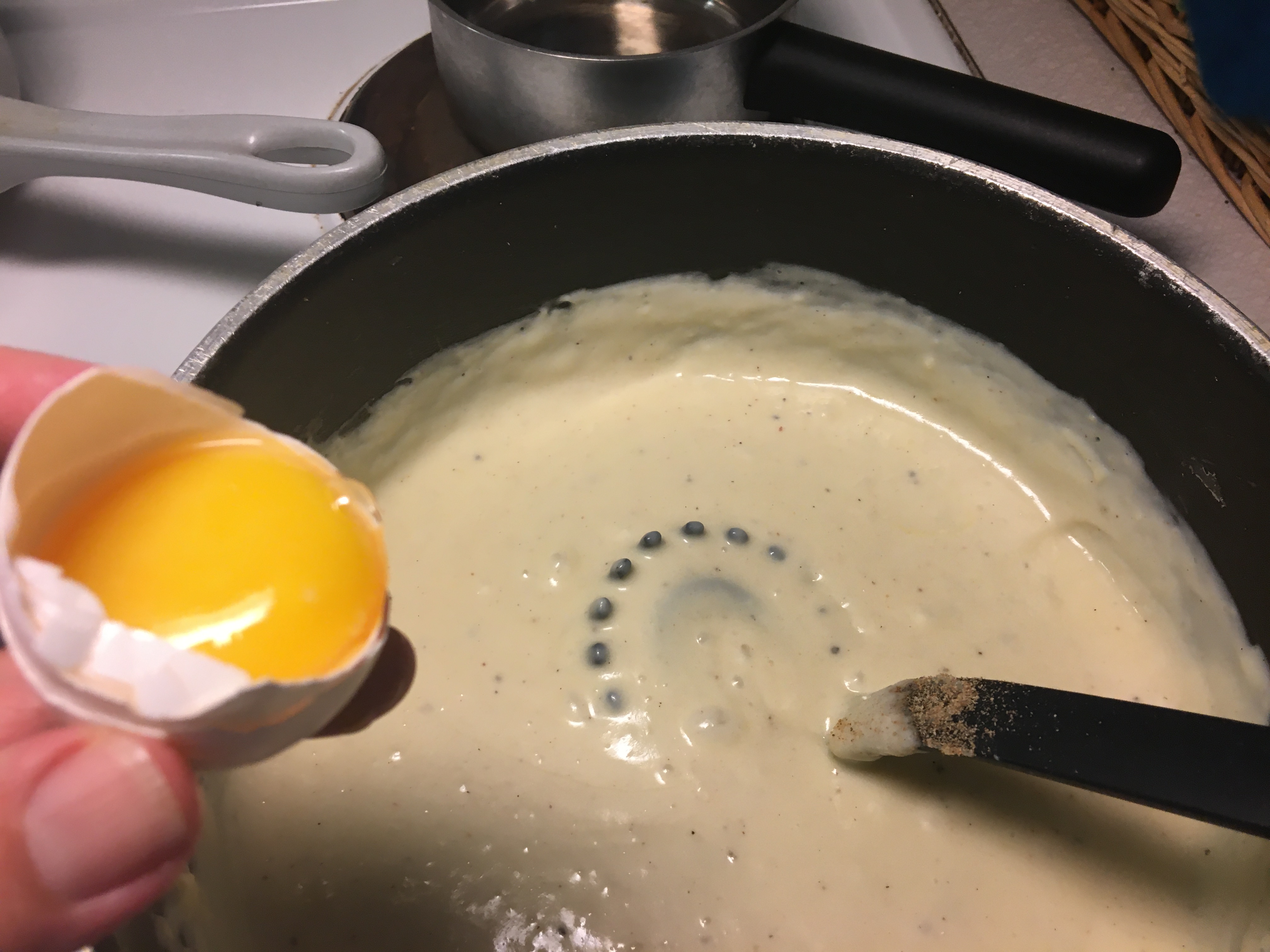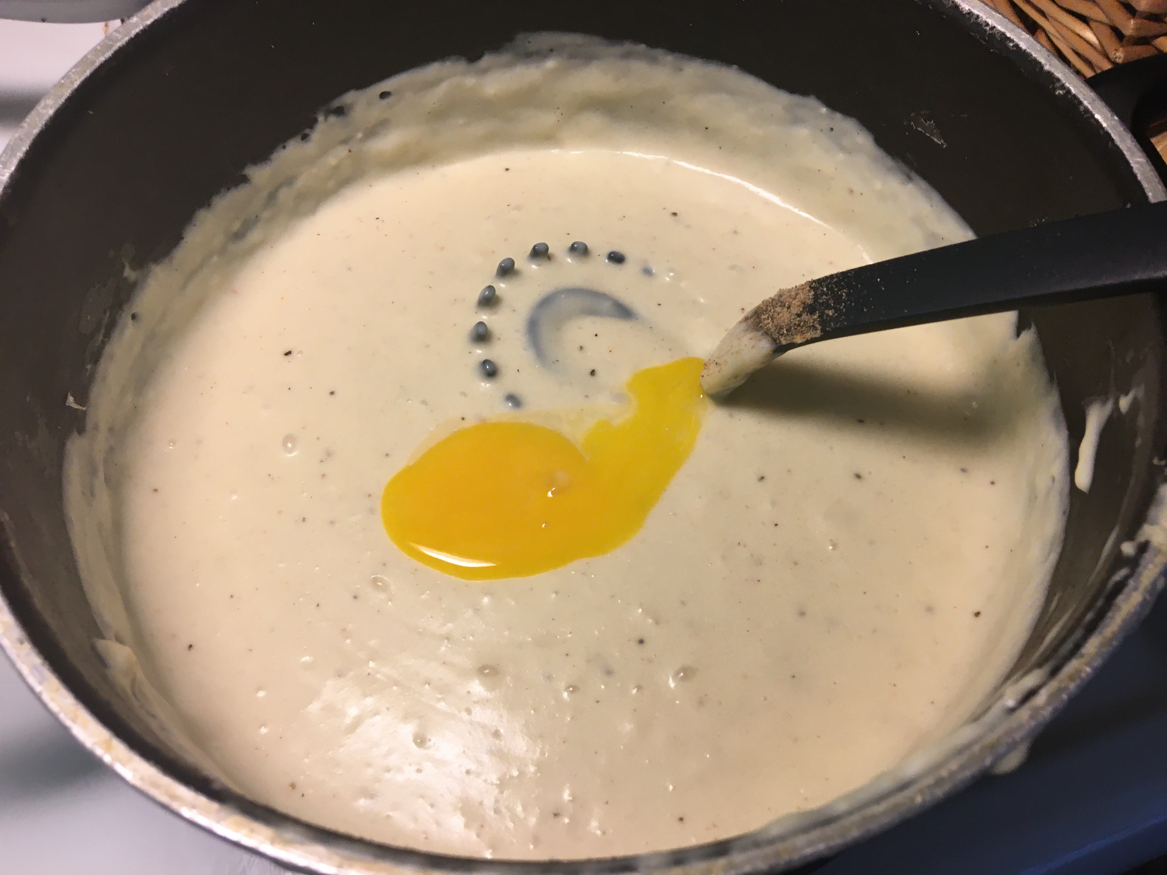 Separate the eggs and add one egg yolk at a time into the sauce. Whisk because you don´t want boiled egg yolks in the sauce.