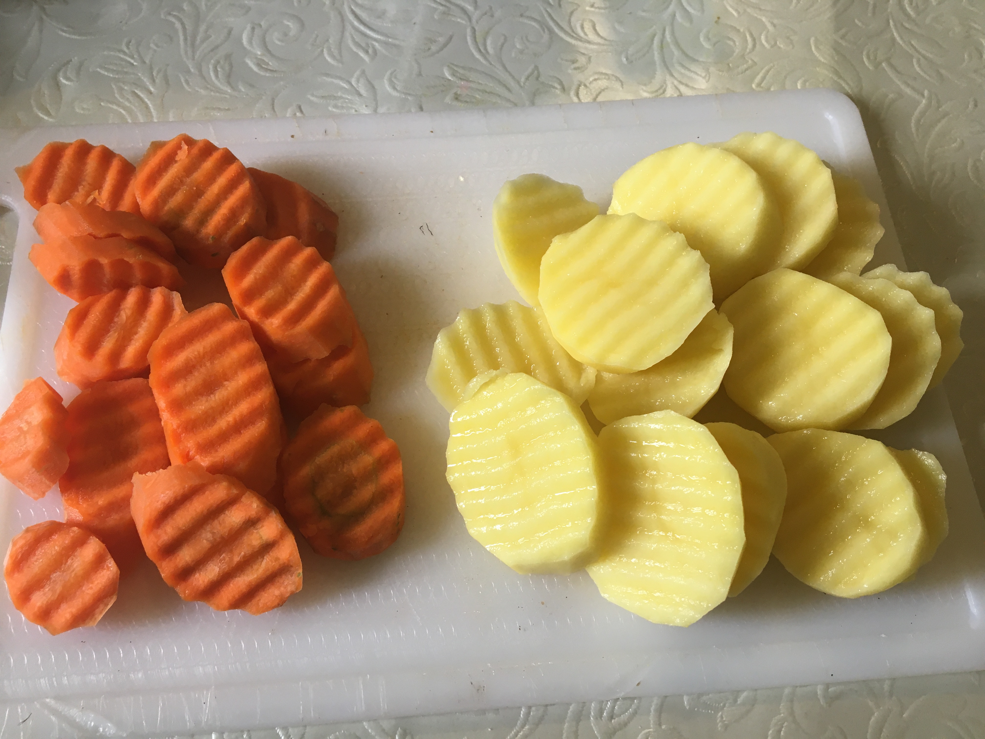 Cut the vegetables in smaller bites before serving, or even before you boil them like I have done here. They will boil quicker. Just boil in water with a little salt.