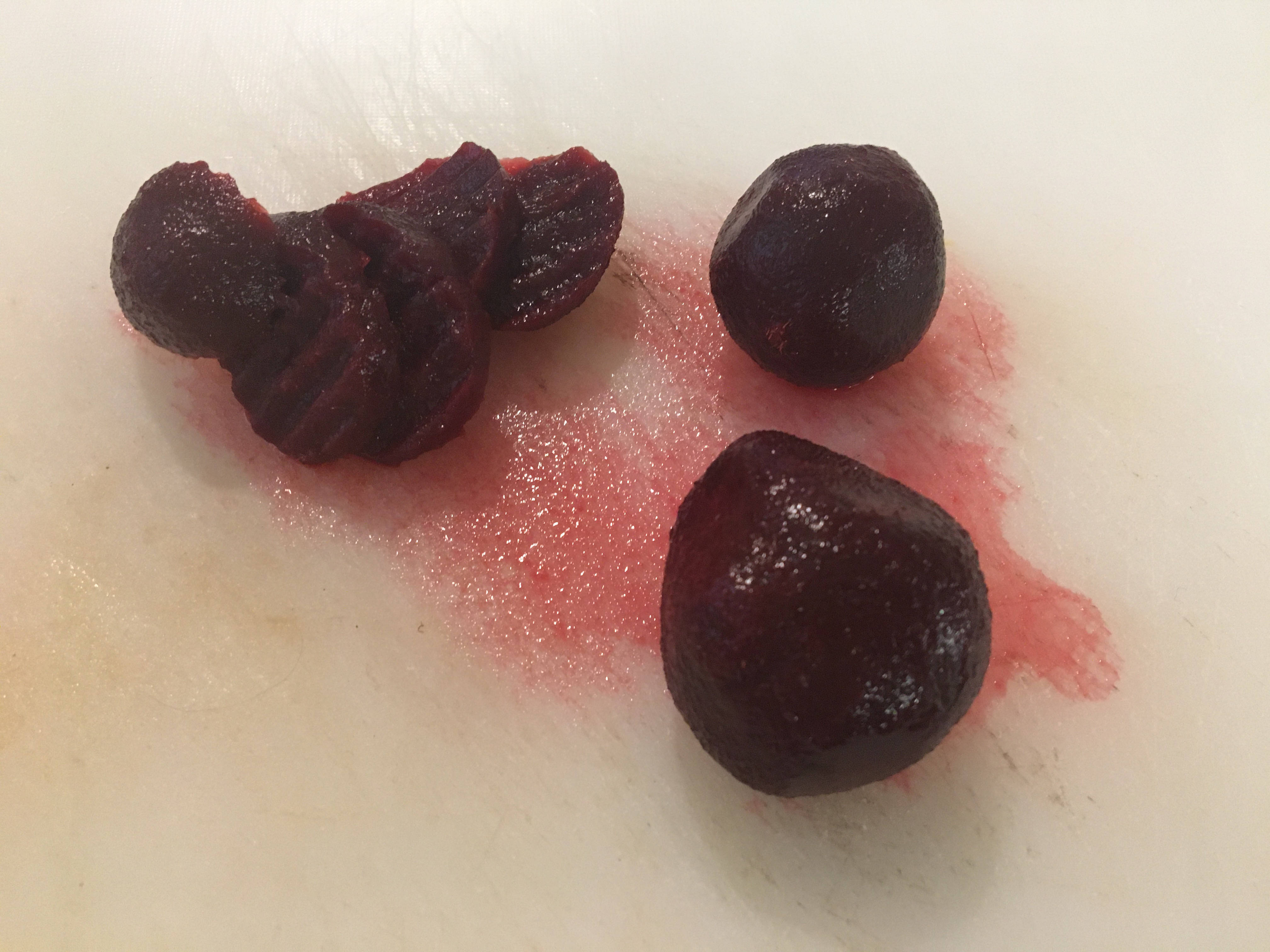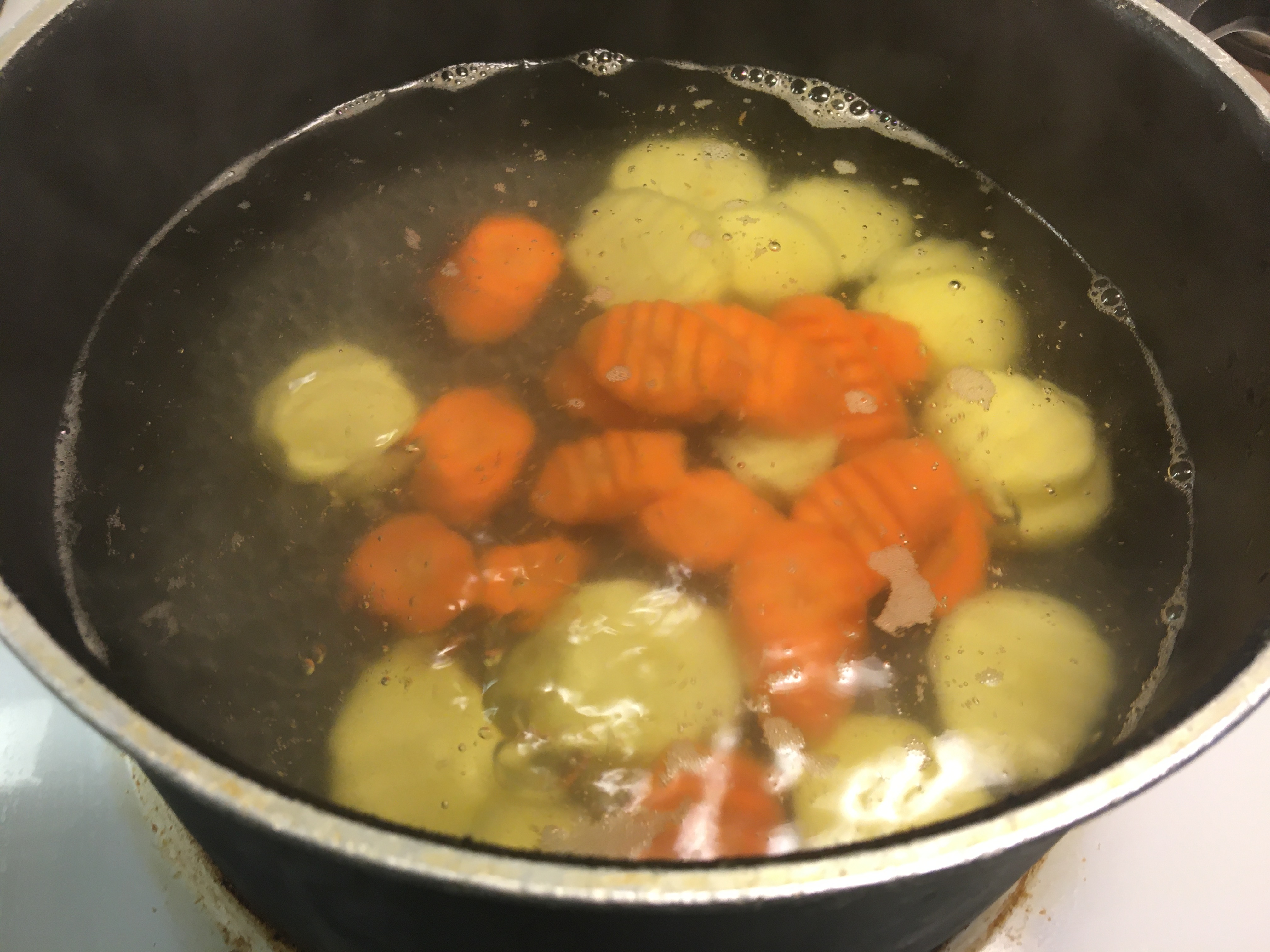 Boil the potatoes, carrots and beetroots (if fresh beetroots)
