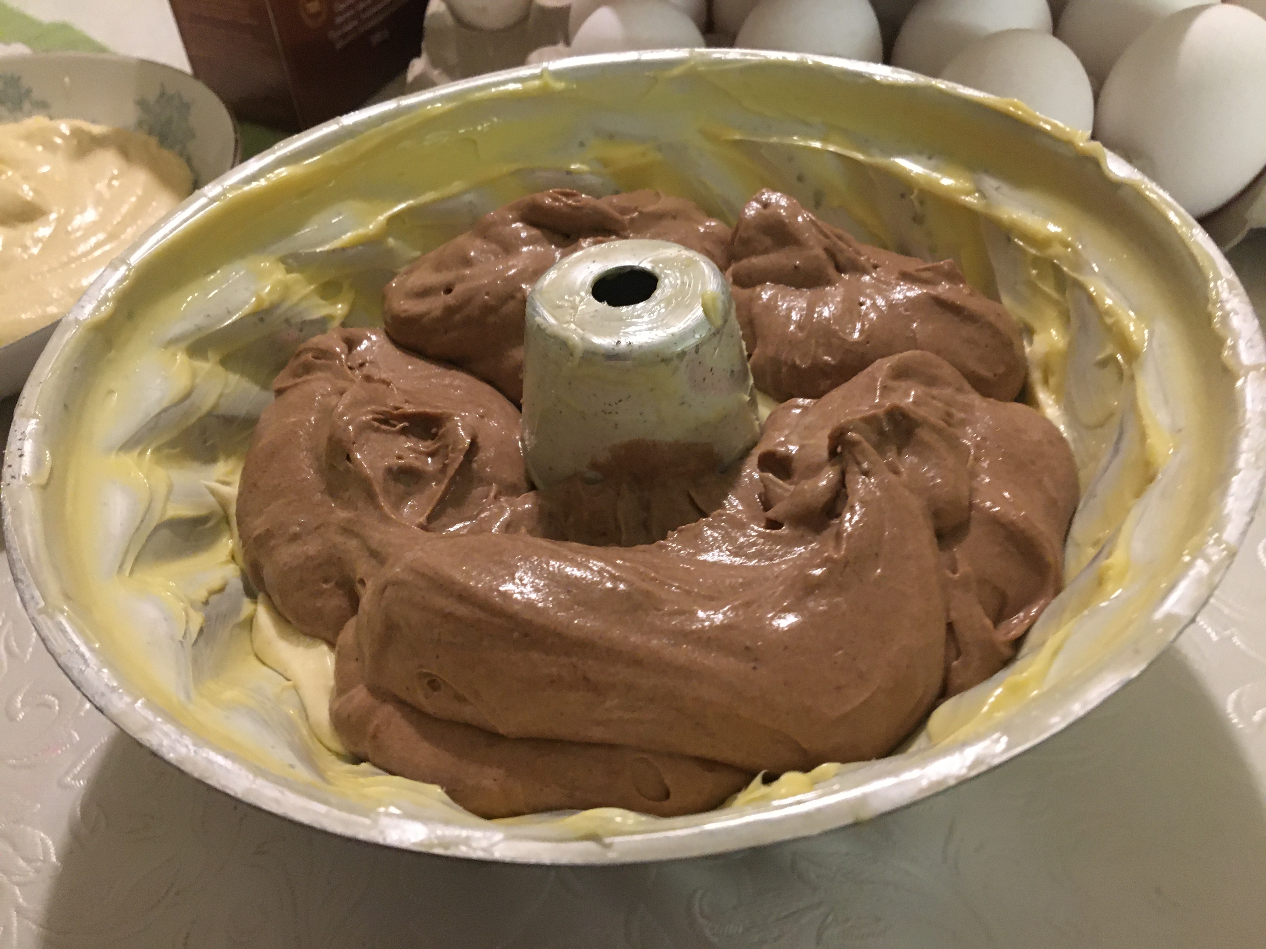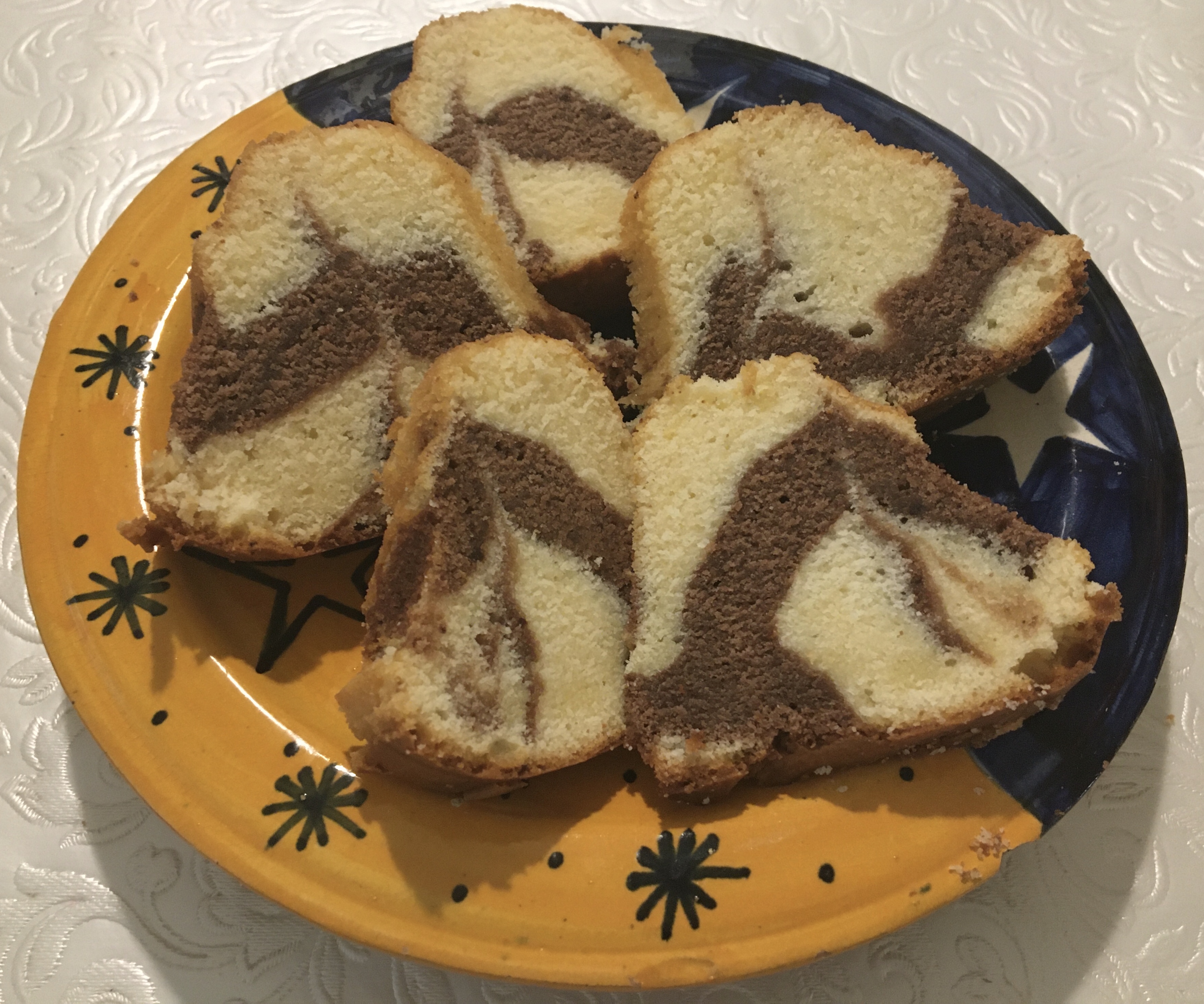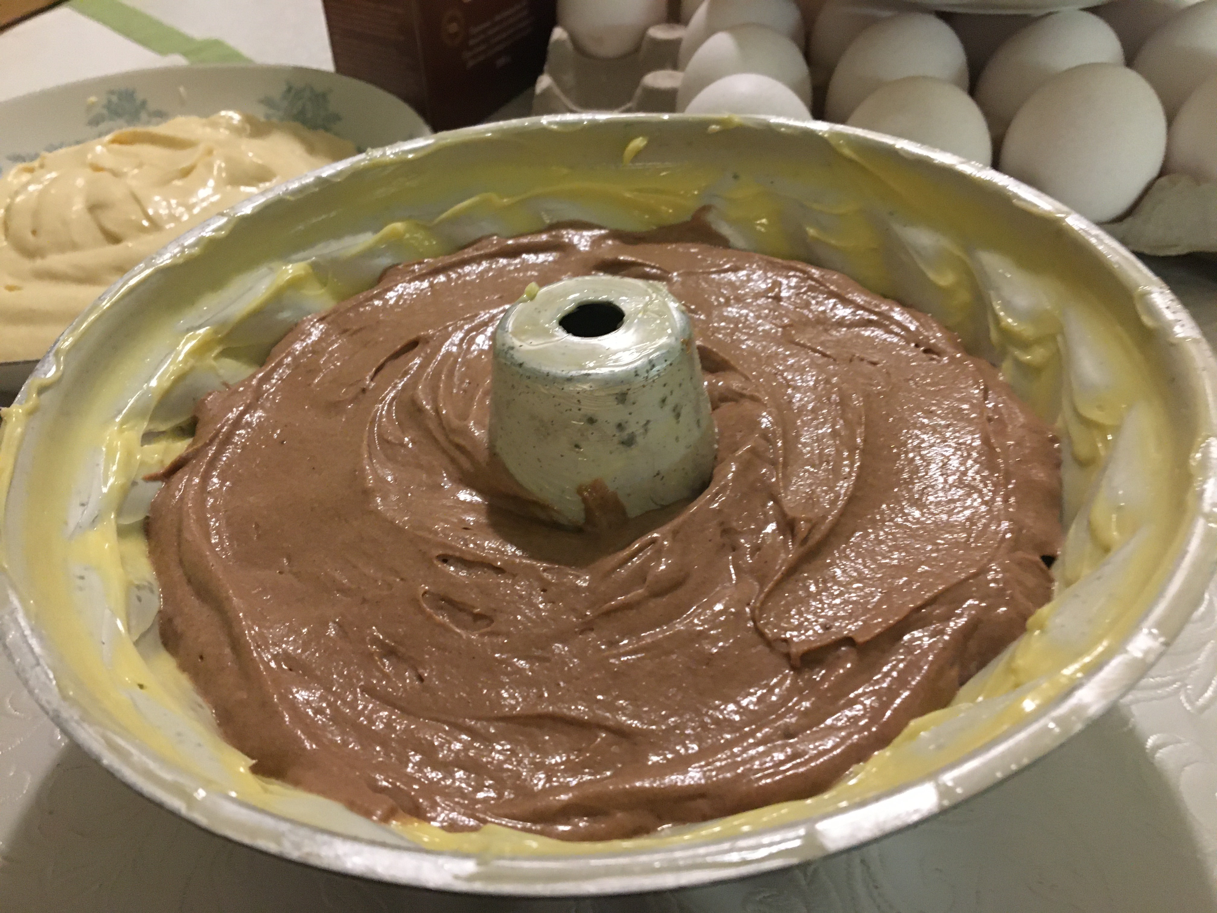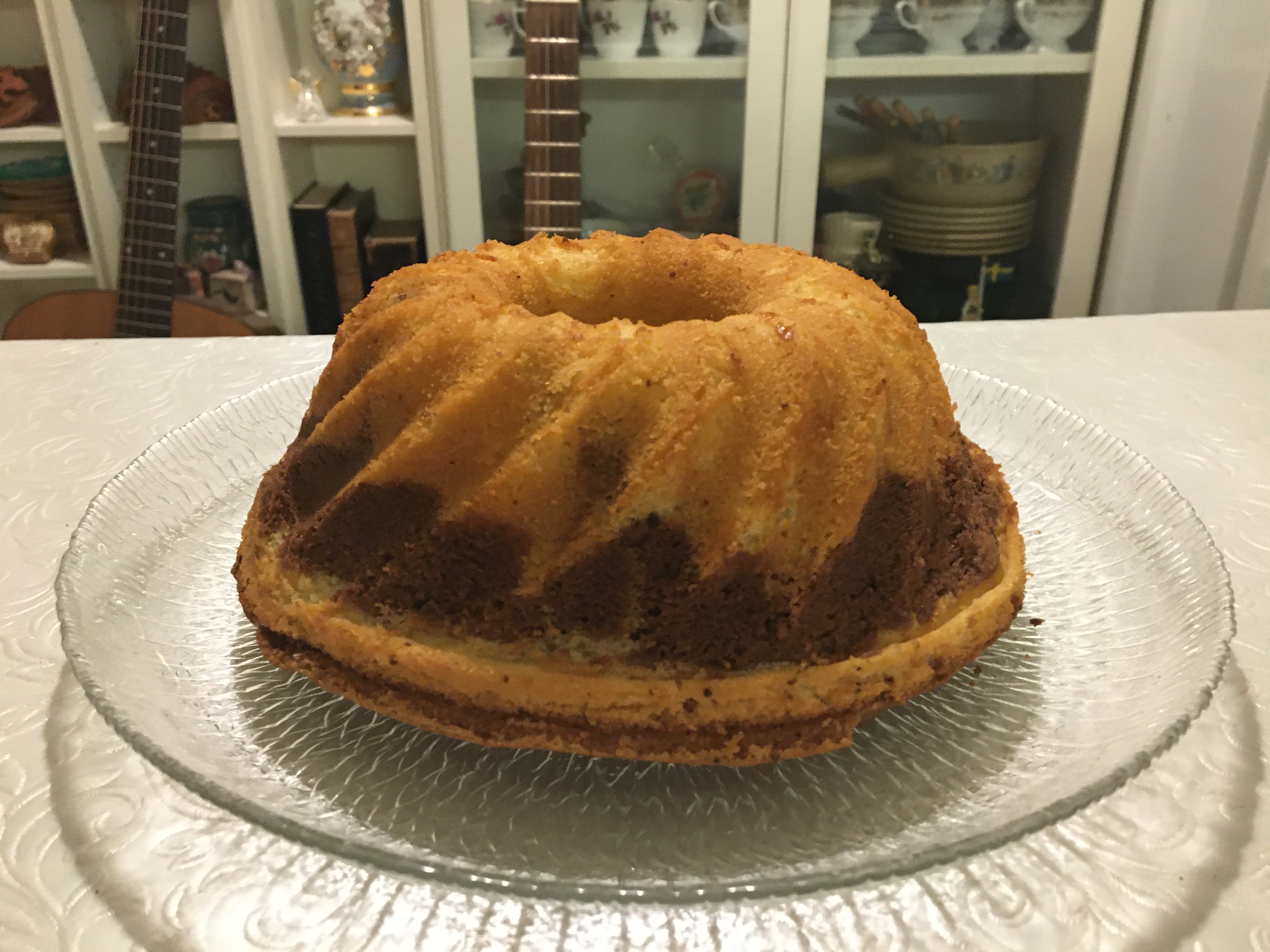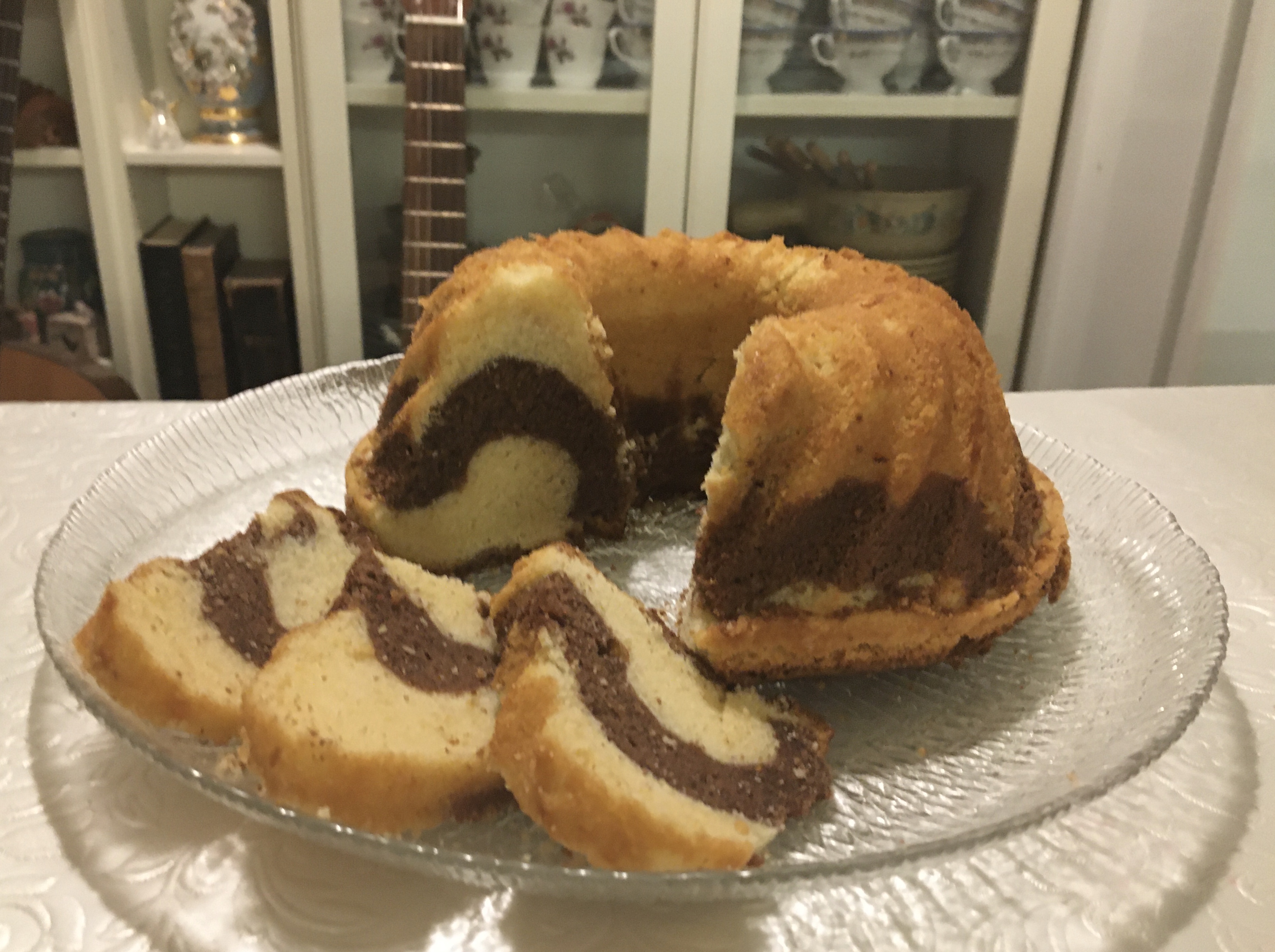 My mother used to make Marble Cake. I thought it was very impressive when I grew up, how she could make the pattern inside the cake. I cannot remember I have made this since I moved from Norway actually when I was young. So I wondered if it is still being made. As I searched for it I found it is made but referred to as “An Old Fashioned Formkake”. Formkake is a Norwegian term for a lot of coffee cakes that you bake in a pan and than cut in smaller pieces. So this is one out of many. Anyways the marble is what is special with this one. Growing up my mother used to cut it and serve it like it is without any any decorations. I see when I have tried to find people making this cake today that some sprinkle icing sugar or cocoa over. Some make icing and decorates the cake before cutting. Some even poured chocolate sauce on. However I want to make it like my mother used to so I just serve it like it is, just the cake. Last night I recreated my mothers Marmorkake.