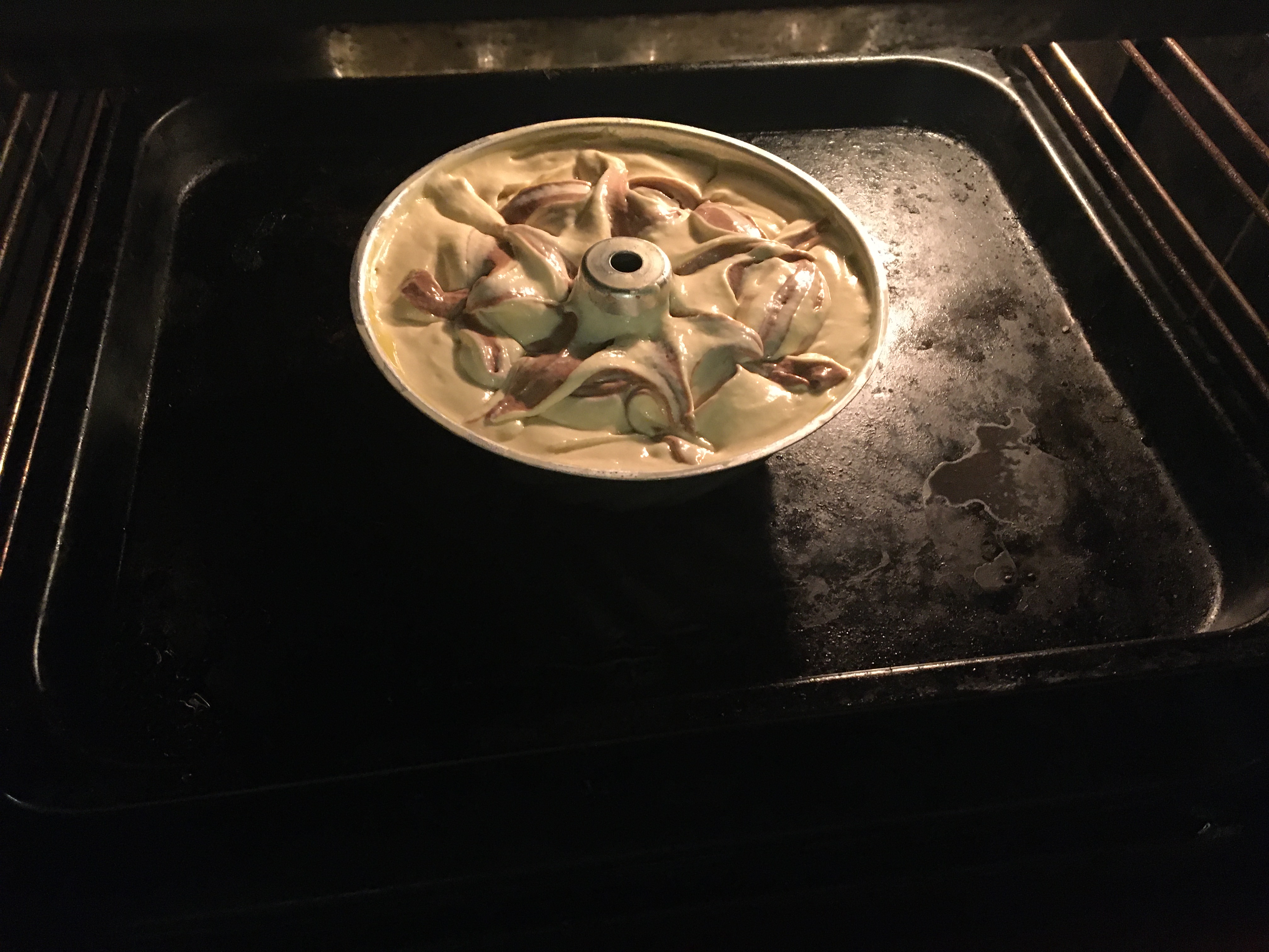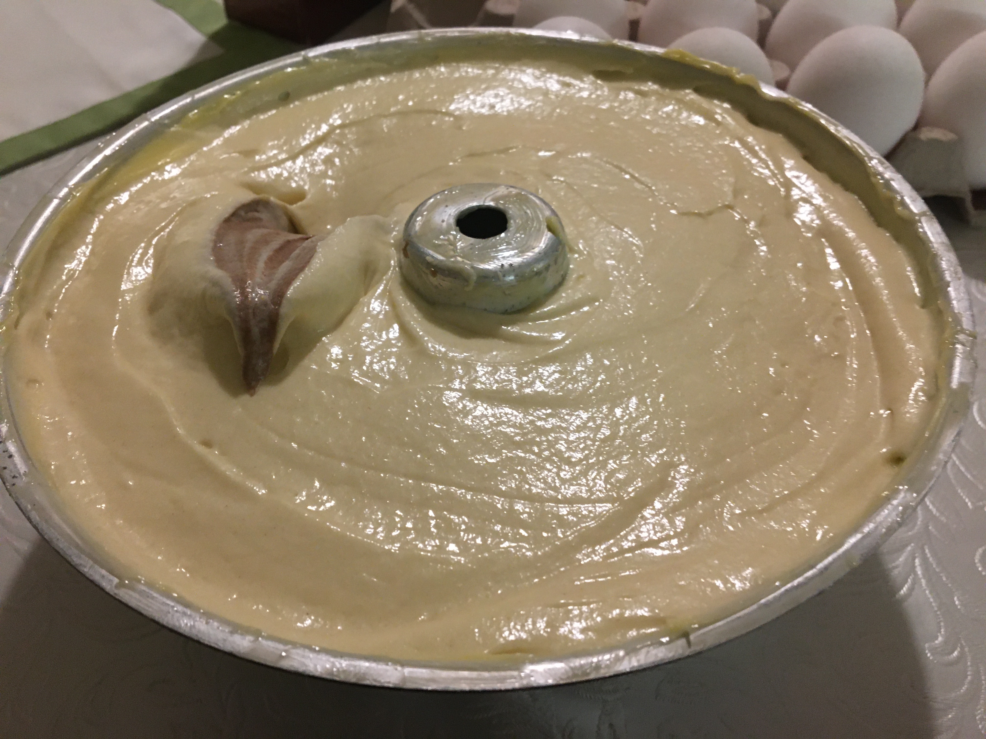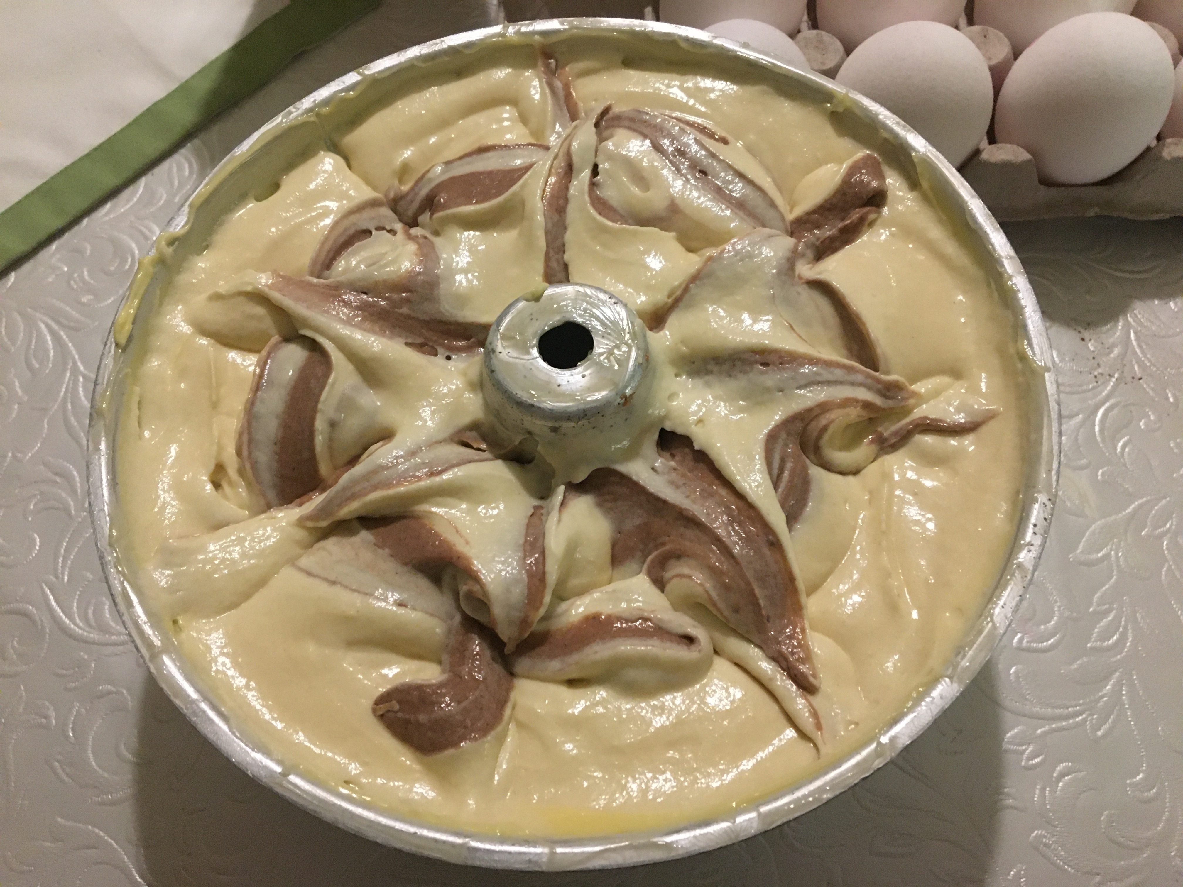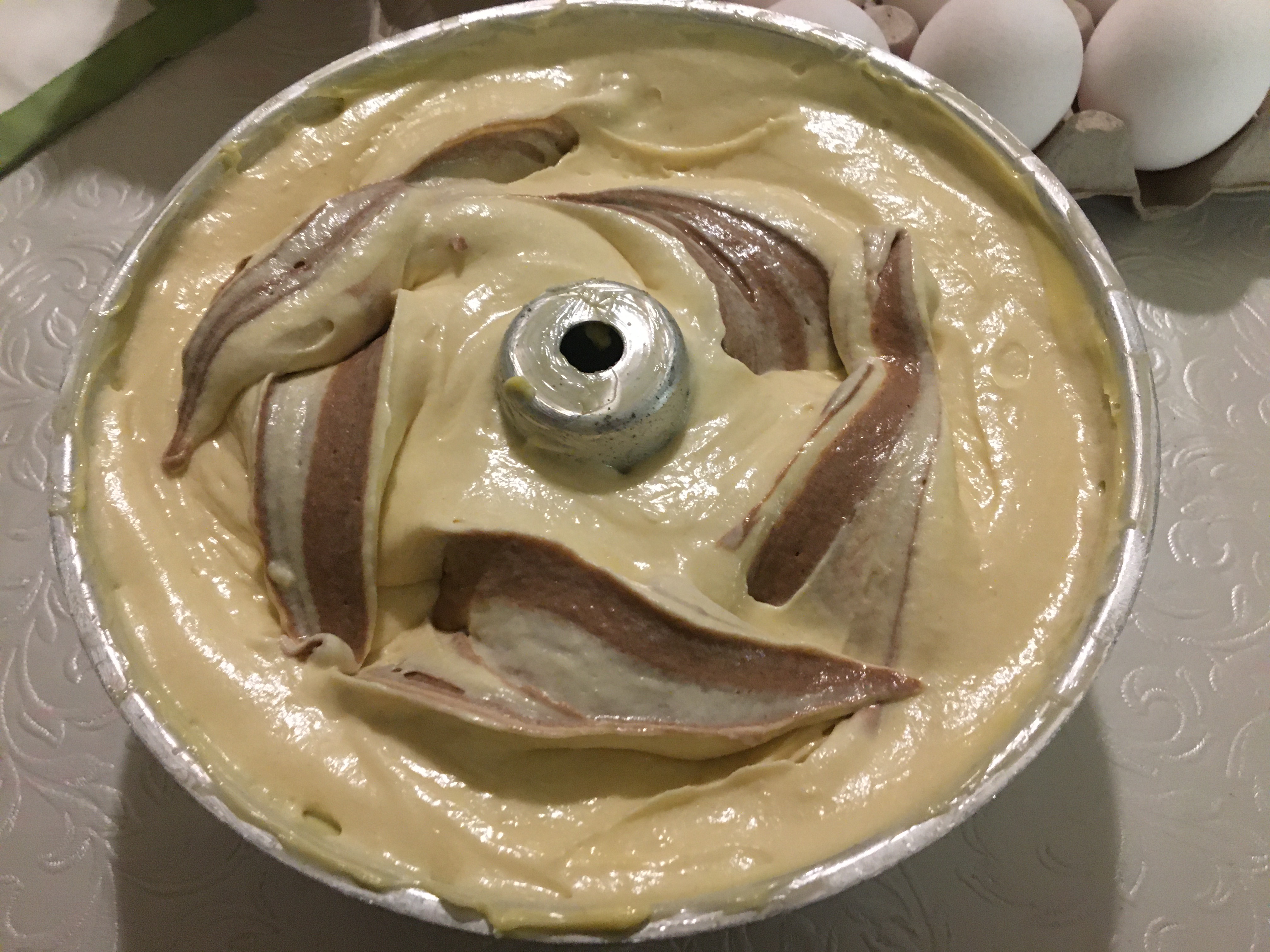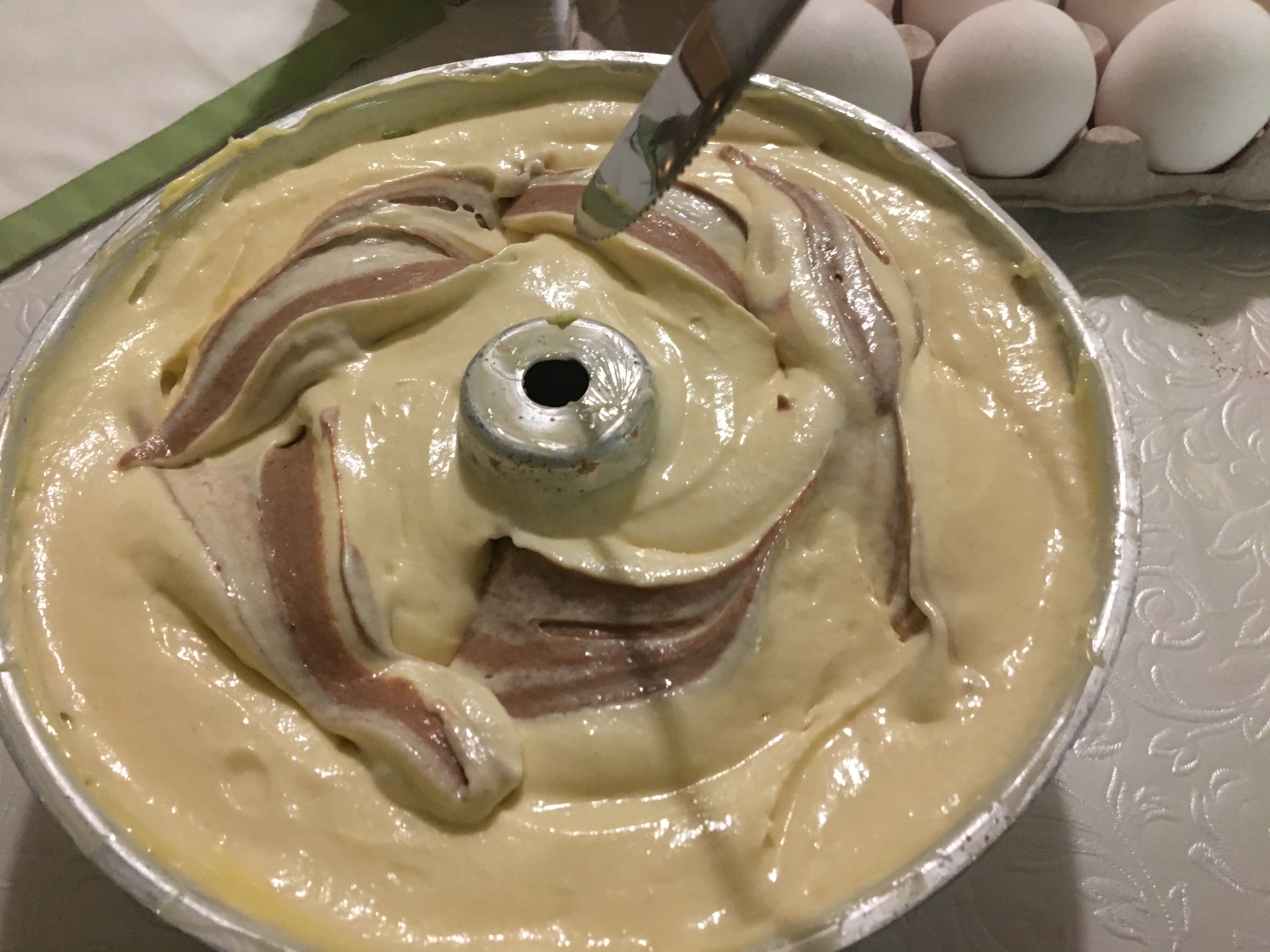 To make the marble you take a spatula or a spoon or a knife or a stick of some kind and stick it down in the mixture and make swirls, from down to up and maybe also sideways. Do it in a pattern over the whole pan but not too much. You will only be able to see the pattern after baking and cutting the cake. And no cake will be like the other.