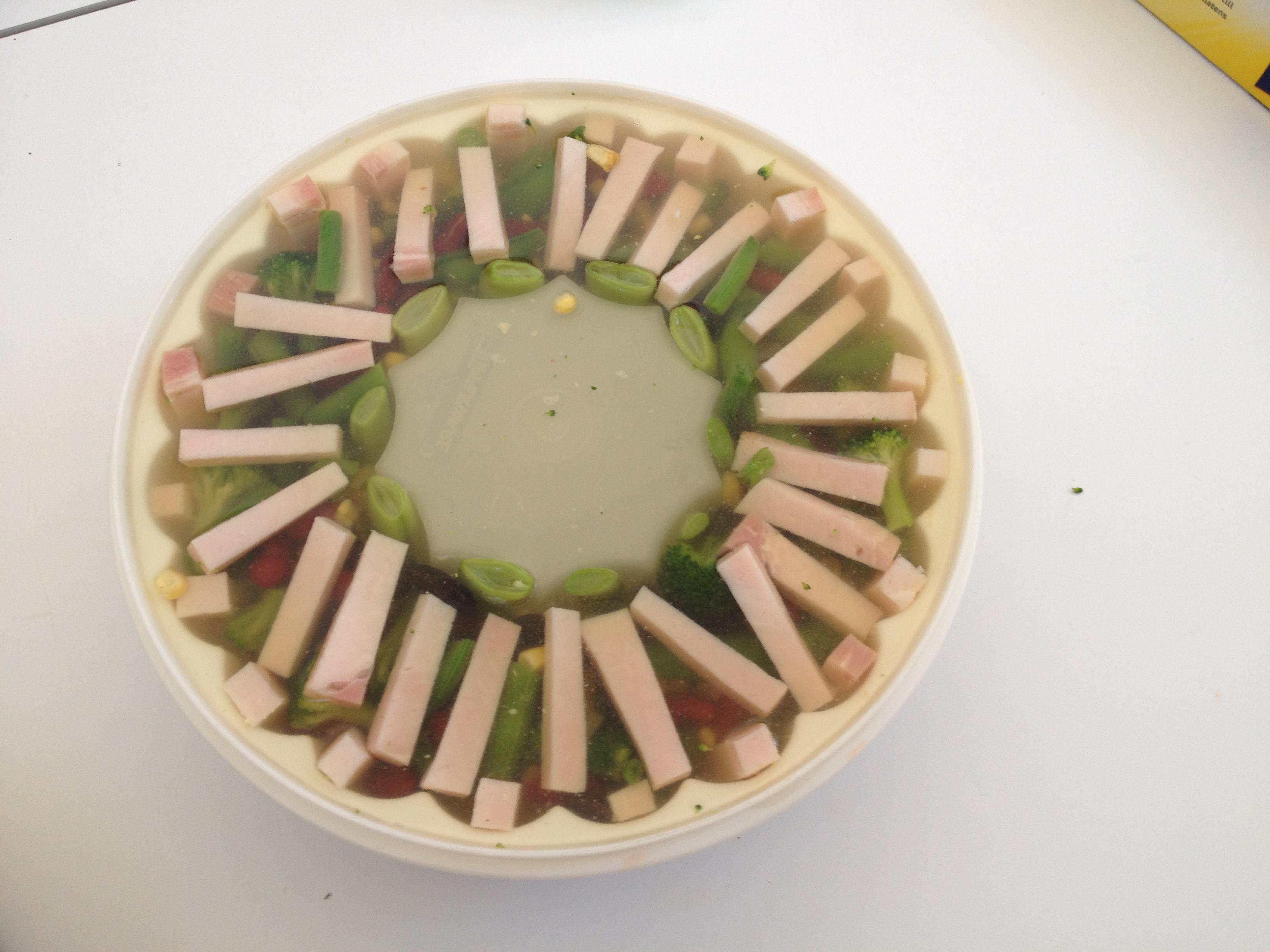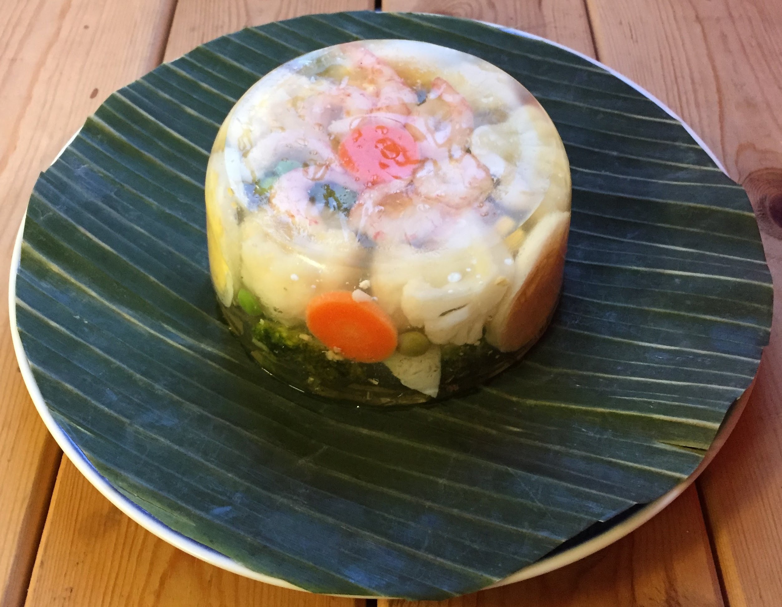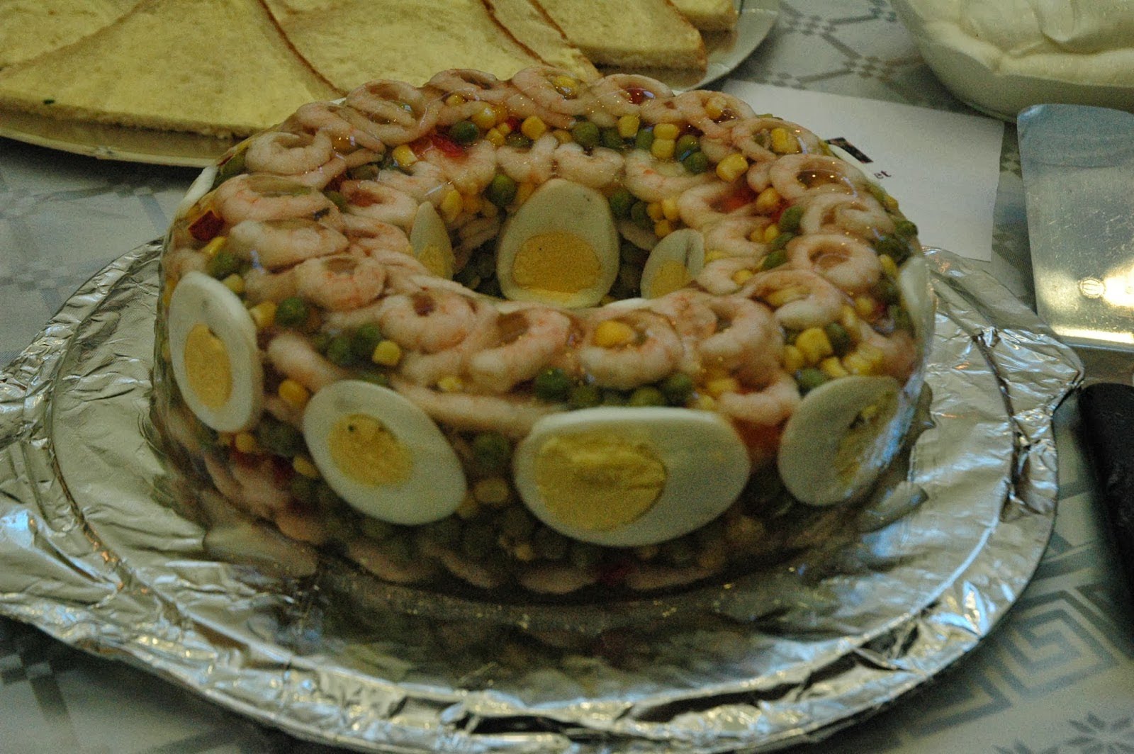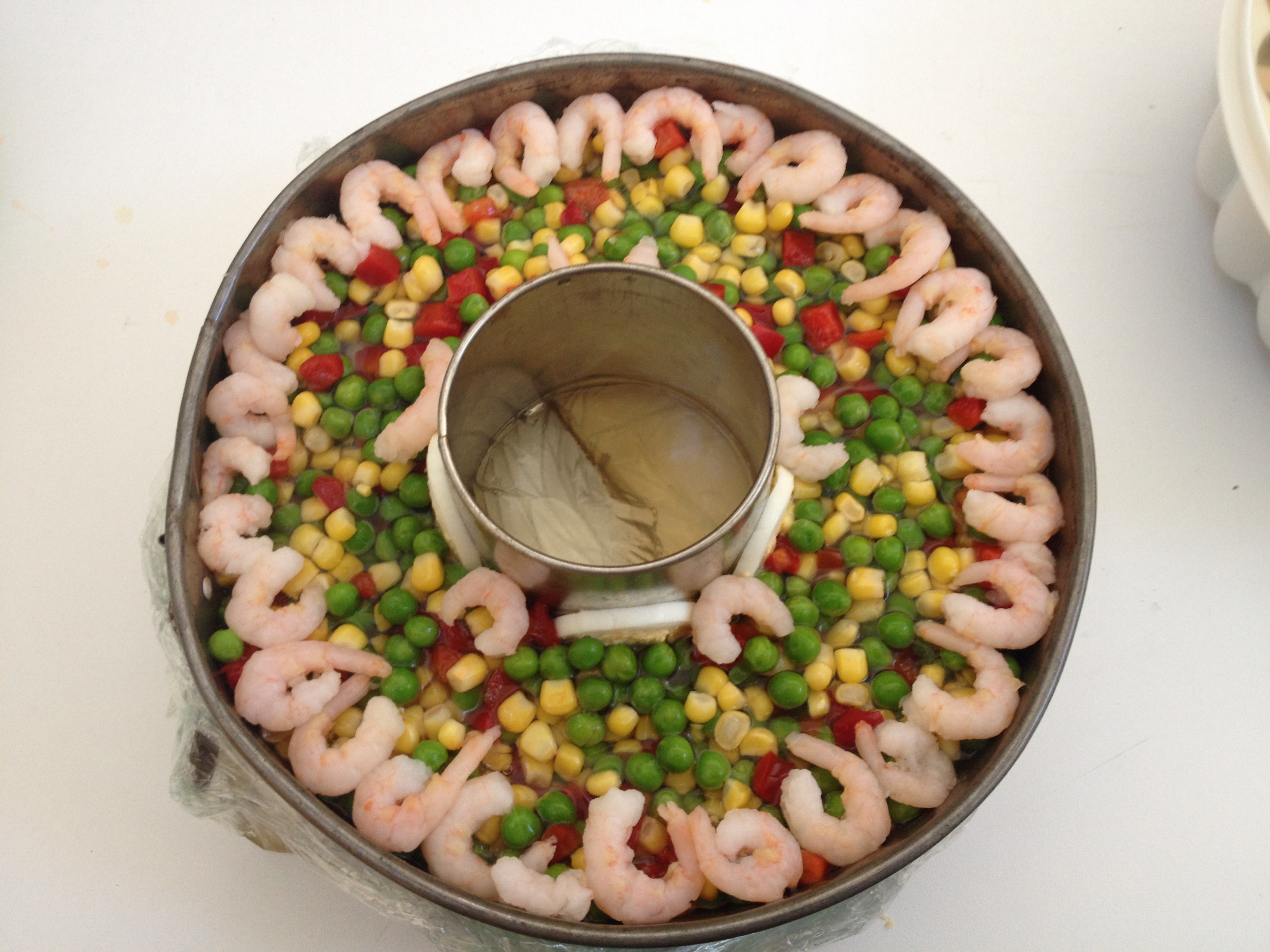 Pour a little of the gelatin in the mold and let it cool and get stiff. Add a layer of shrimps or ham or eggs. Make a nice pattern according to your liking. Pour more gelatin to just cover your pattern. Leave it to harden like a jelly. Then add another layer with for instance vegetables and pour more gelatin and wait until it hardens. Continue like this with adding layers and making a nice pattern until the mold is filled.