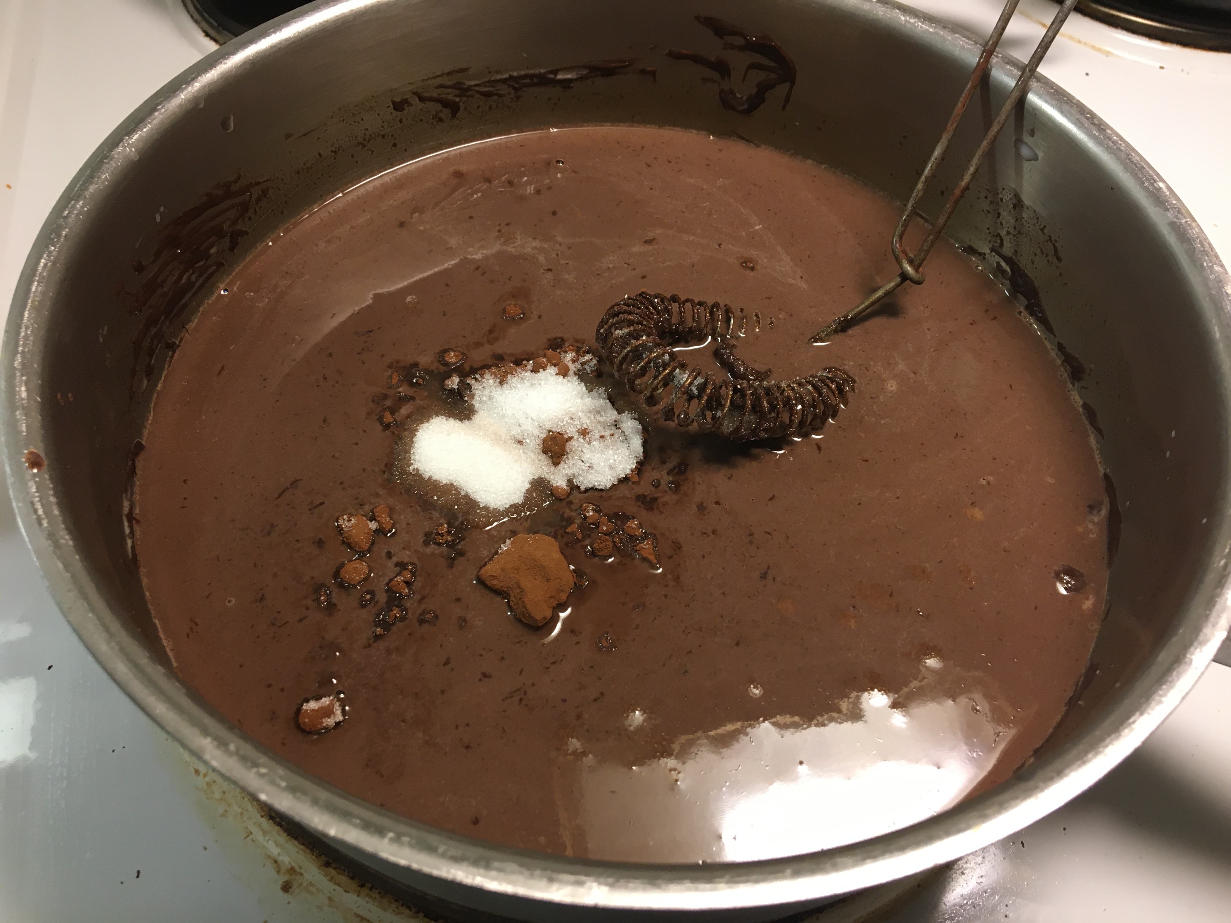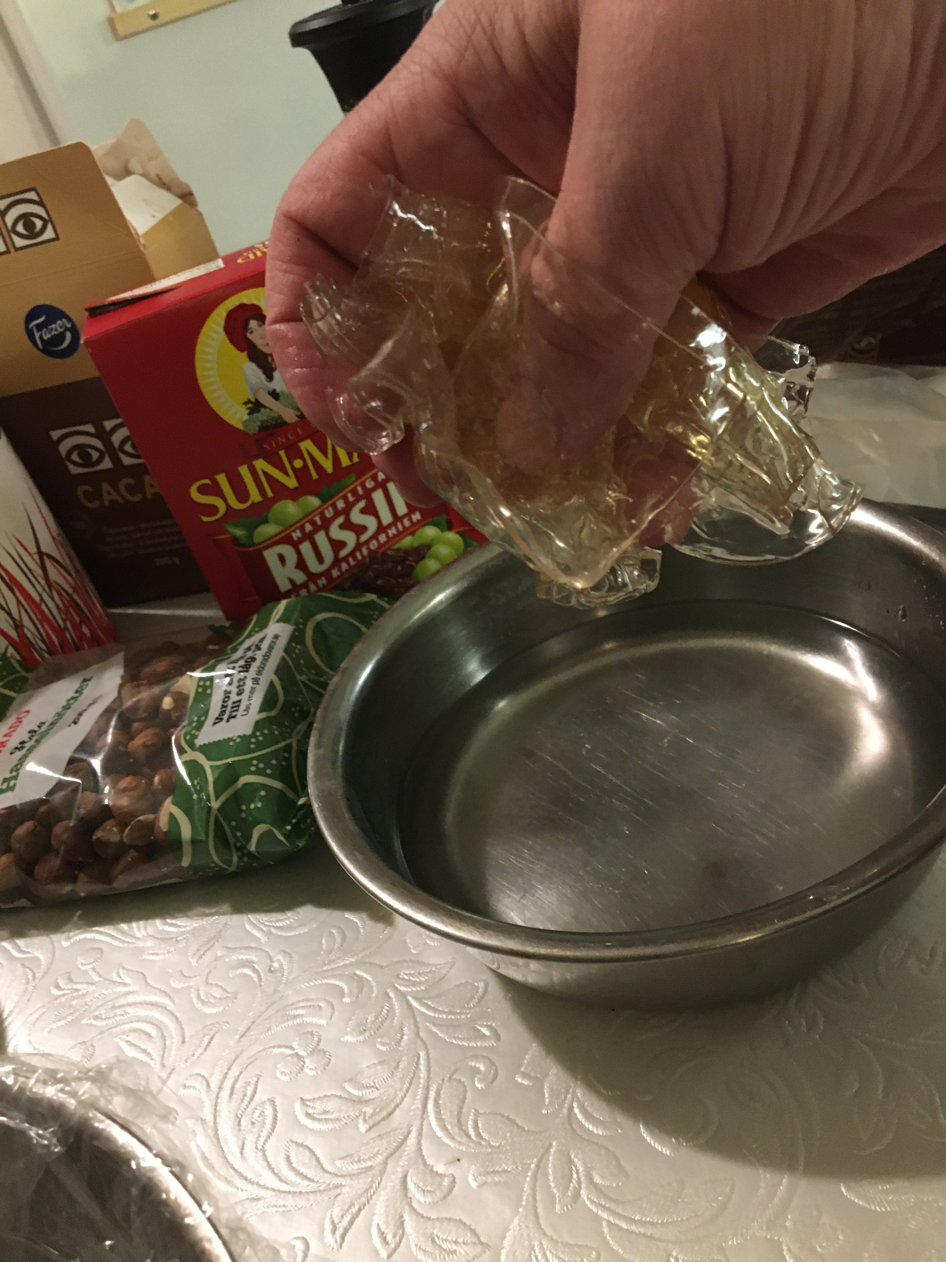 Soften the five gelatin sheets in a bit of cold water (you can get these at the grocery store, located in the baking isle) then squeeze out the water from the sheets, place in the pot and let it dissolve in the hot chocolate/milk mixture (the mixture must not boil).