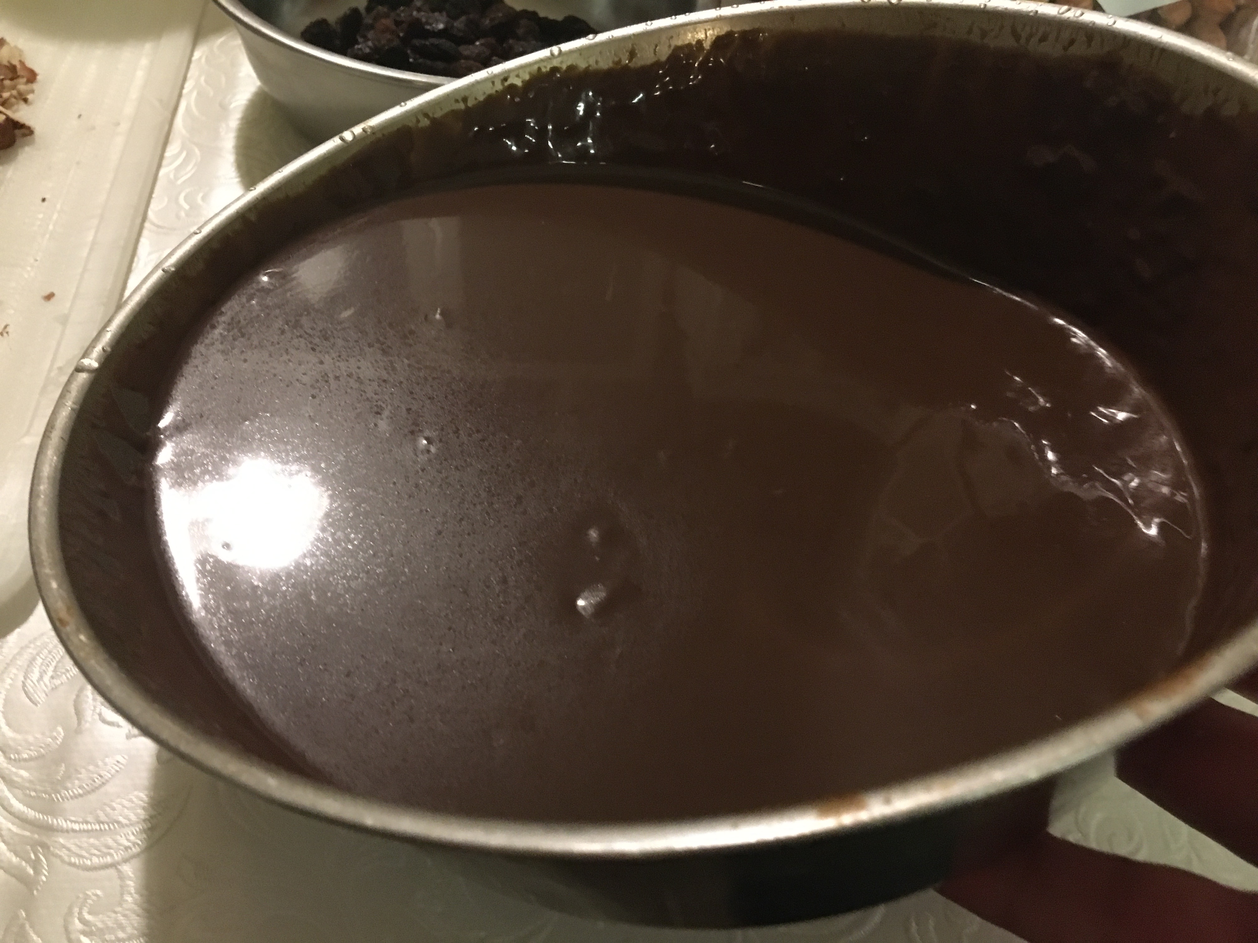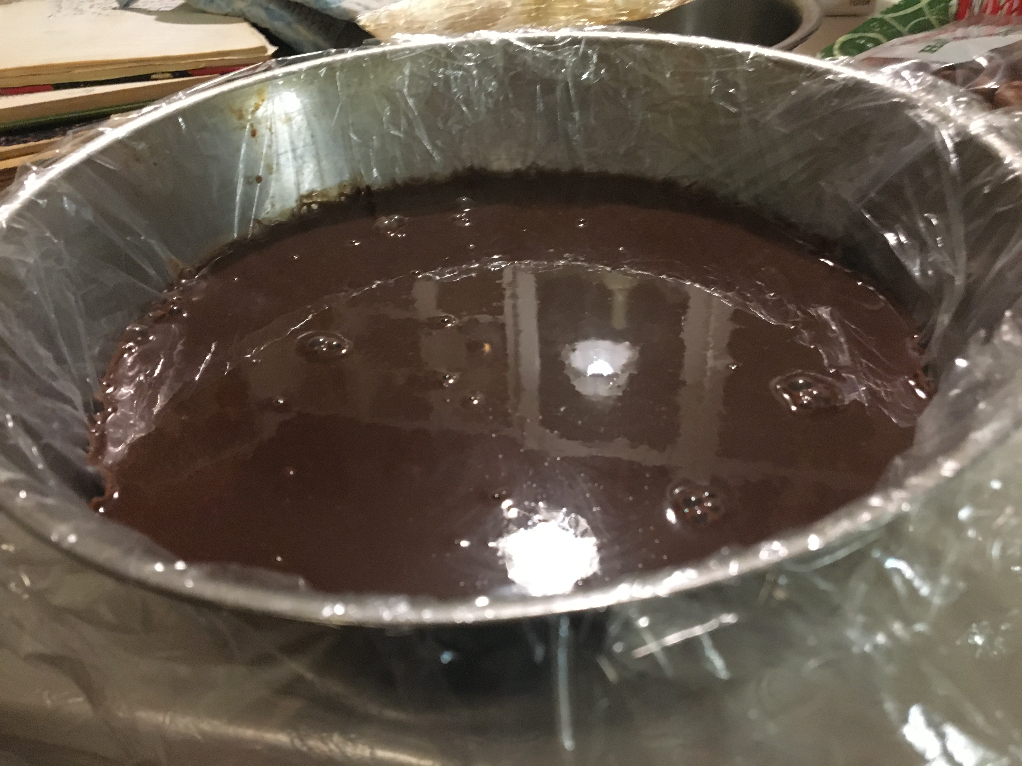 Pour the chocolate into the cake pan and place it in the fridge. Once it starts to stiffen up, swirl the pan to get the sides of the cake pan coated with the chocolate as well. This takes some patience to do to get it perfect.