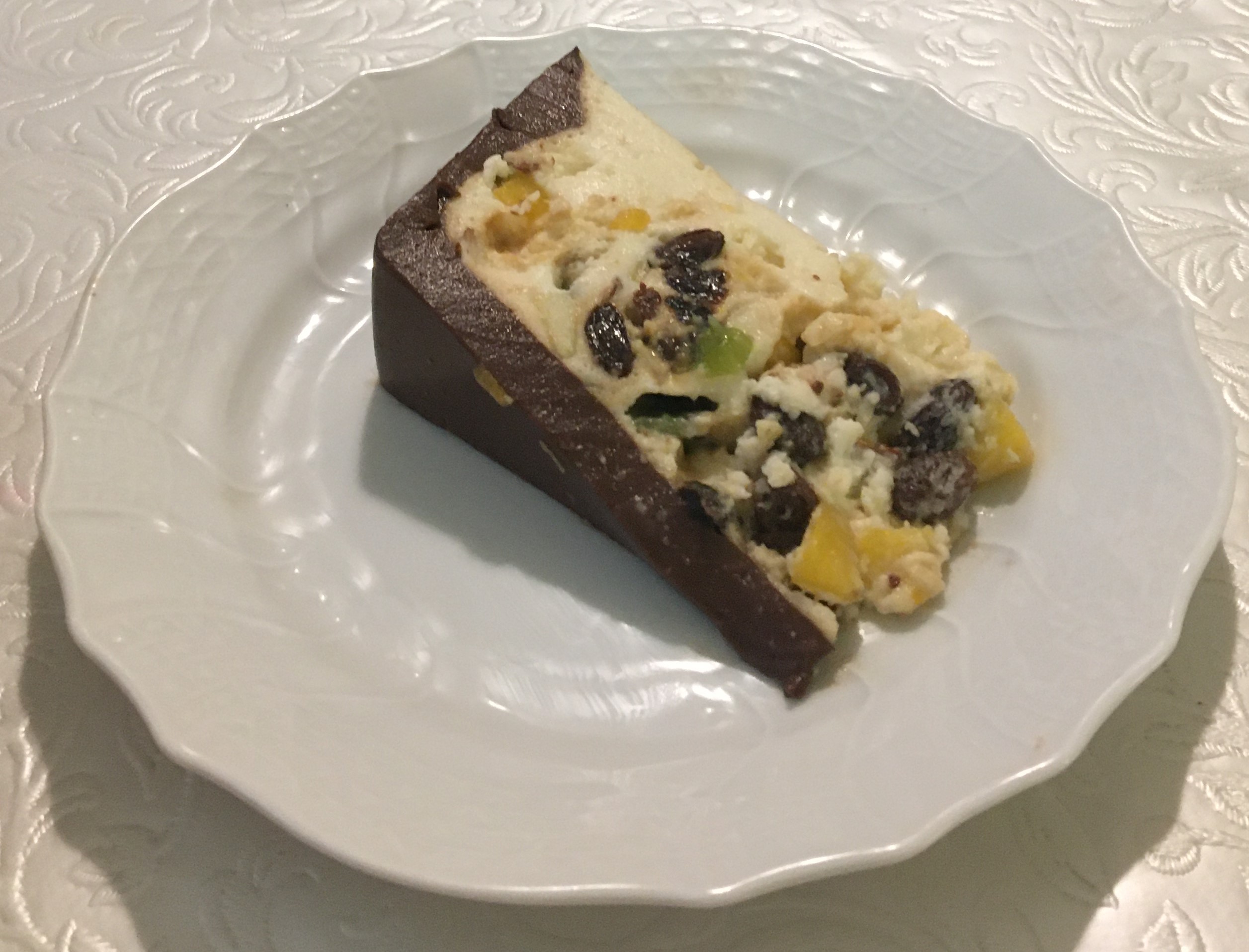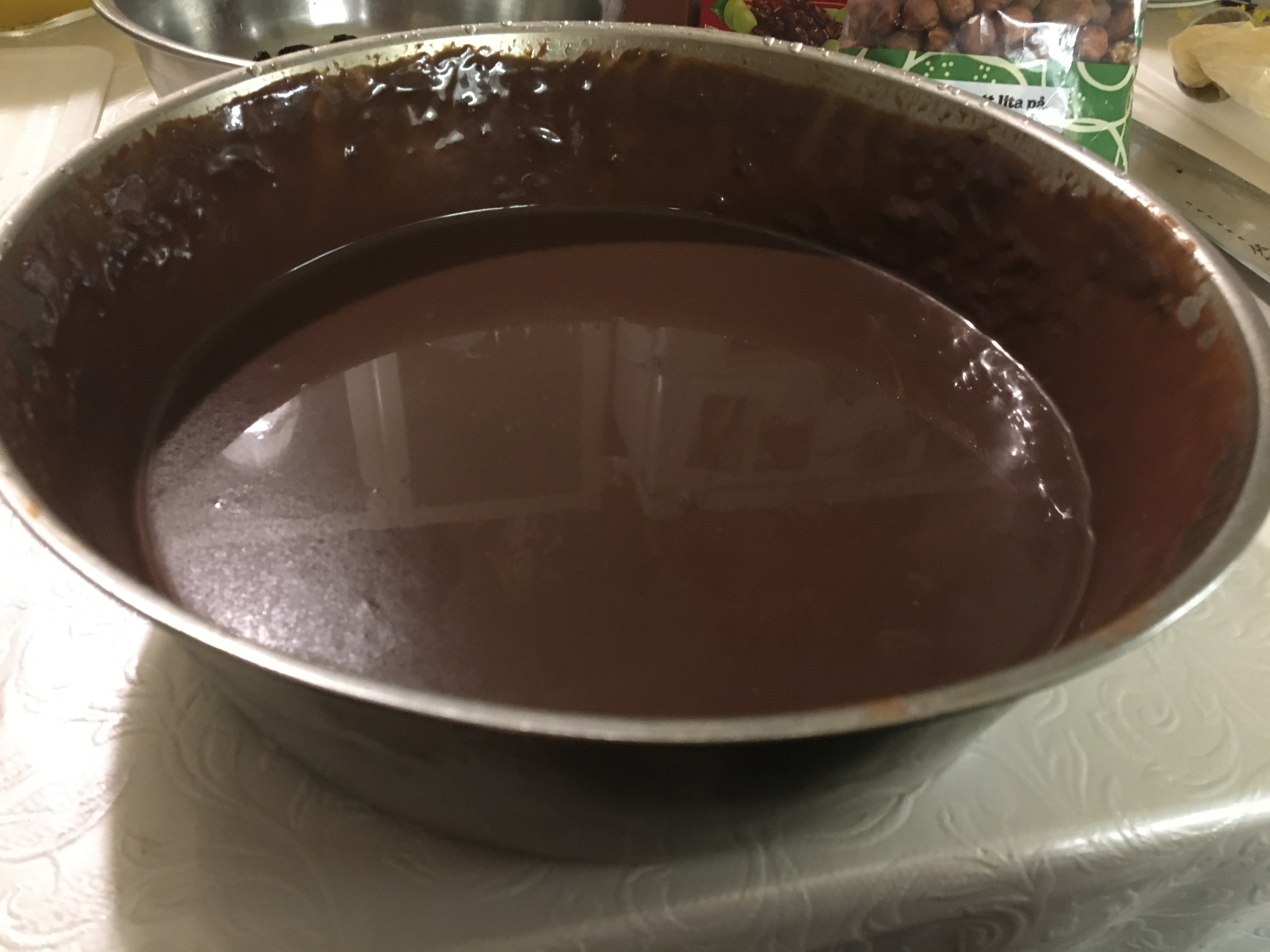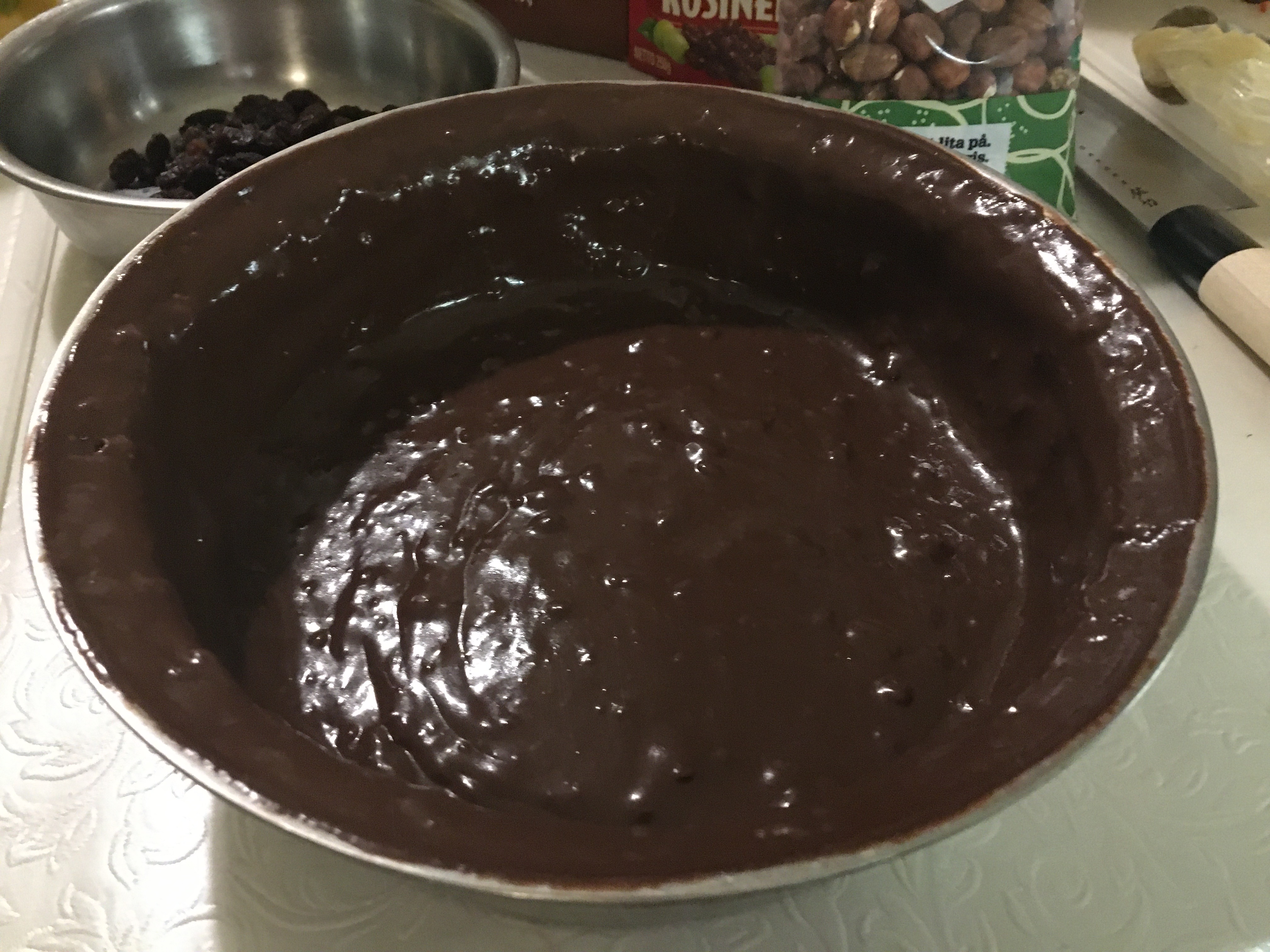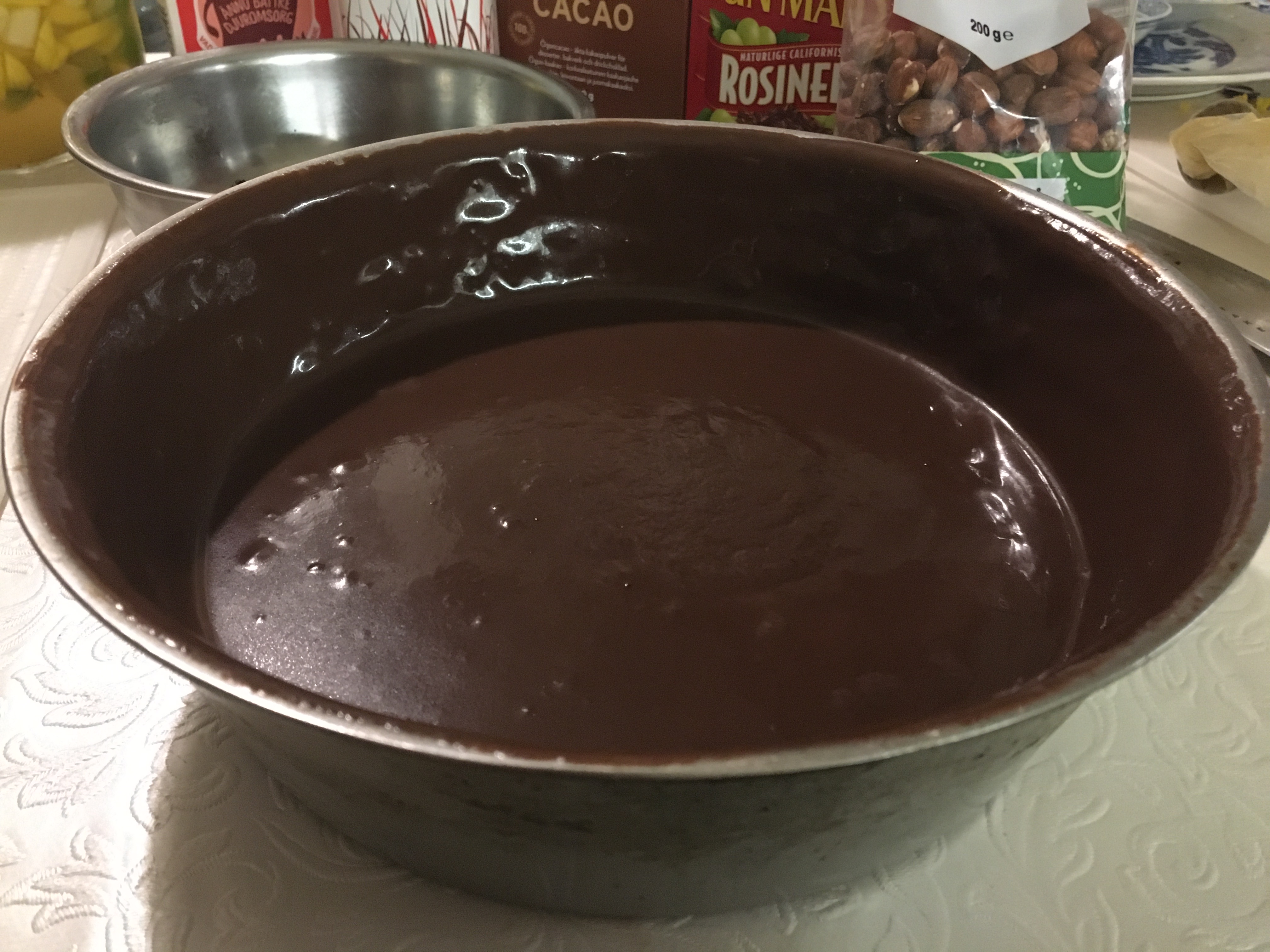 Norways “Mørk Hemmelighet “ which translates into “Dark Secret” is a wonderful mousse cake covered in an outer layer of chocolate pudding, it has bits of tropical fruits, nuts and raisins inside, a perfect match with the chocolate. It is incredibly light and not too sweet. I think it’s a unique dessert but I never saw anyone else than my mother make it. Was it too much work? I have made it sometimes over the years. Yesterday I decided to recreate it in memory of my mother.