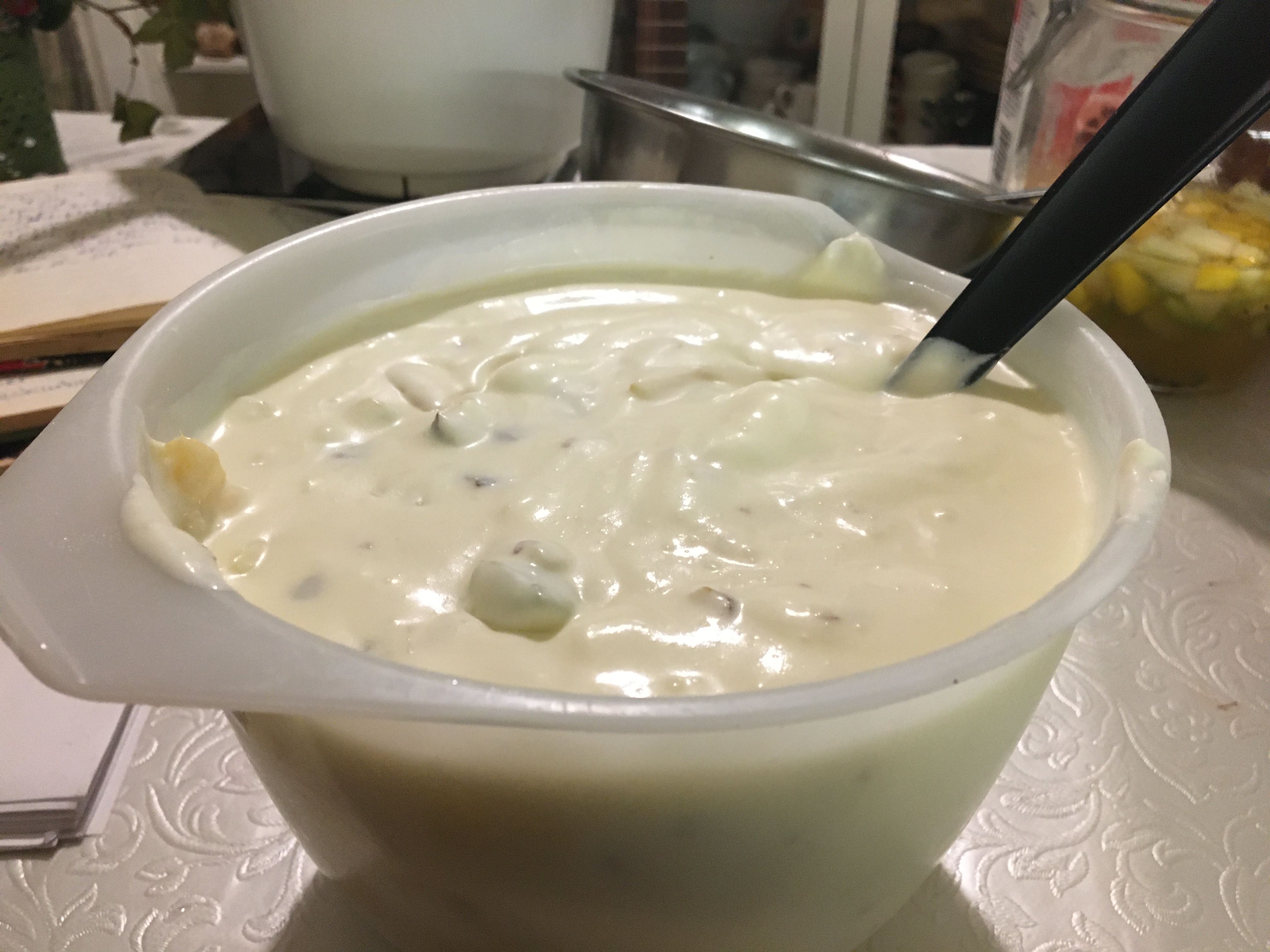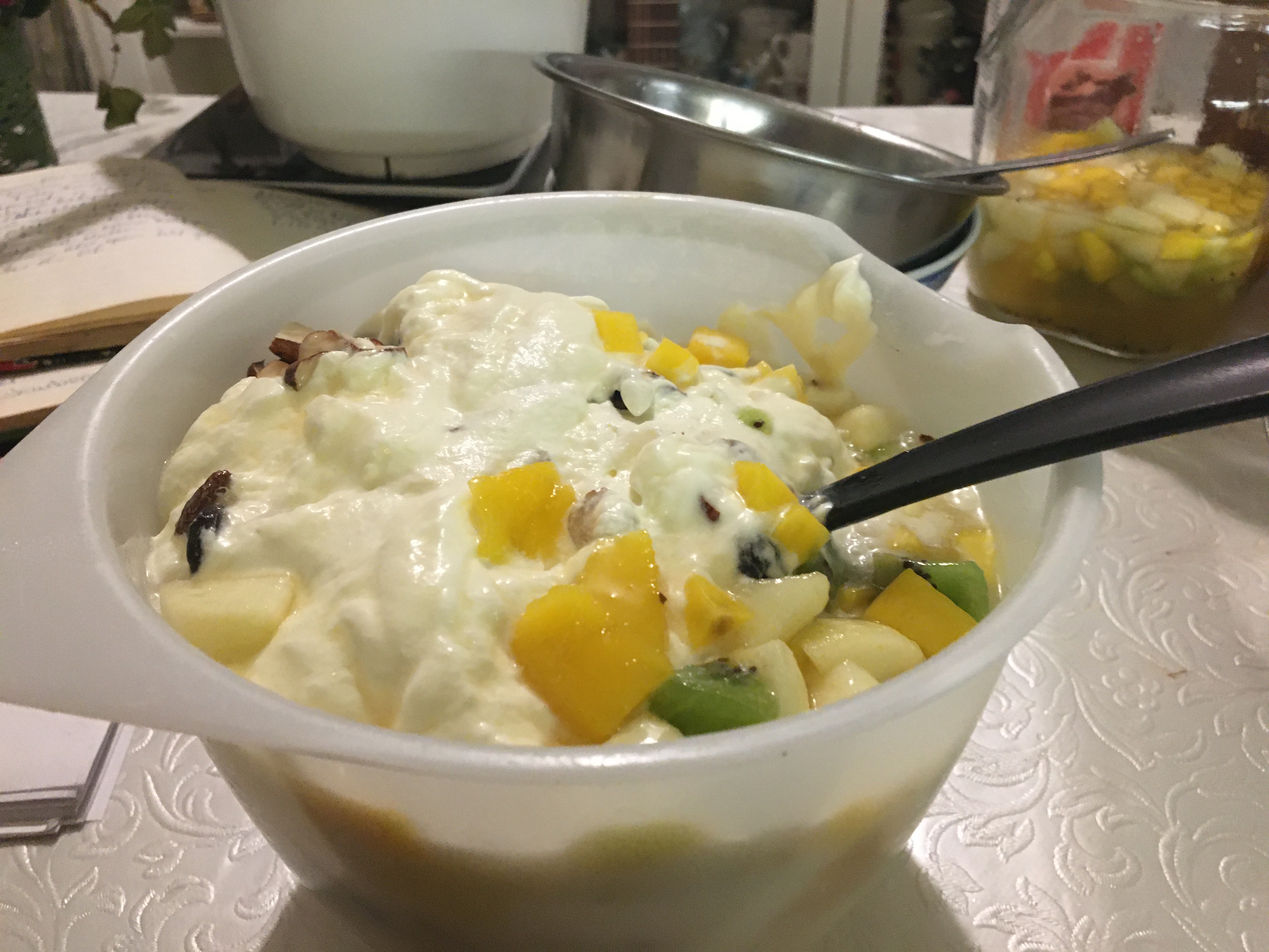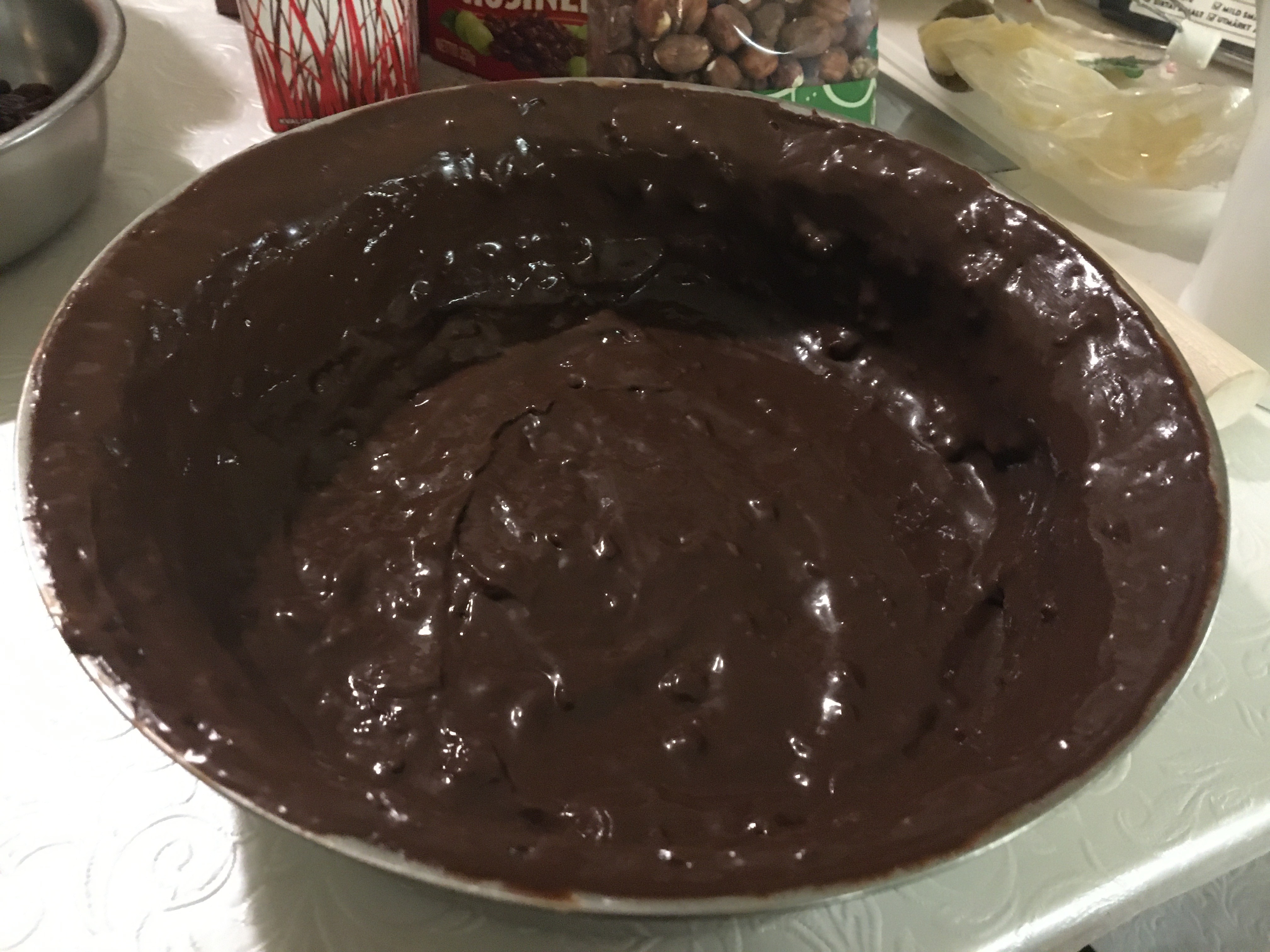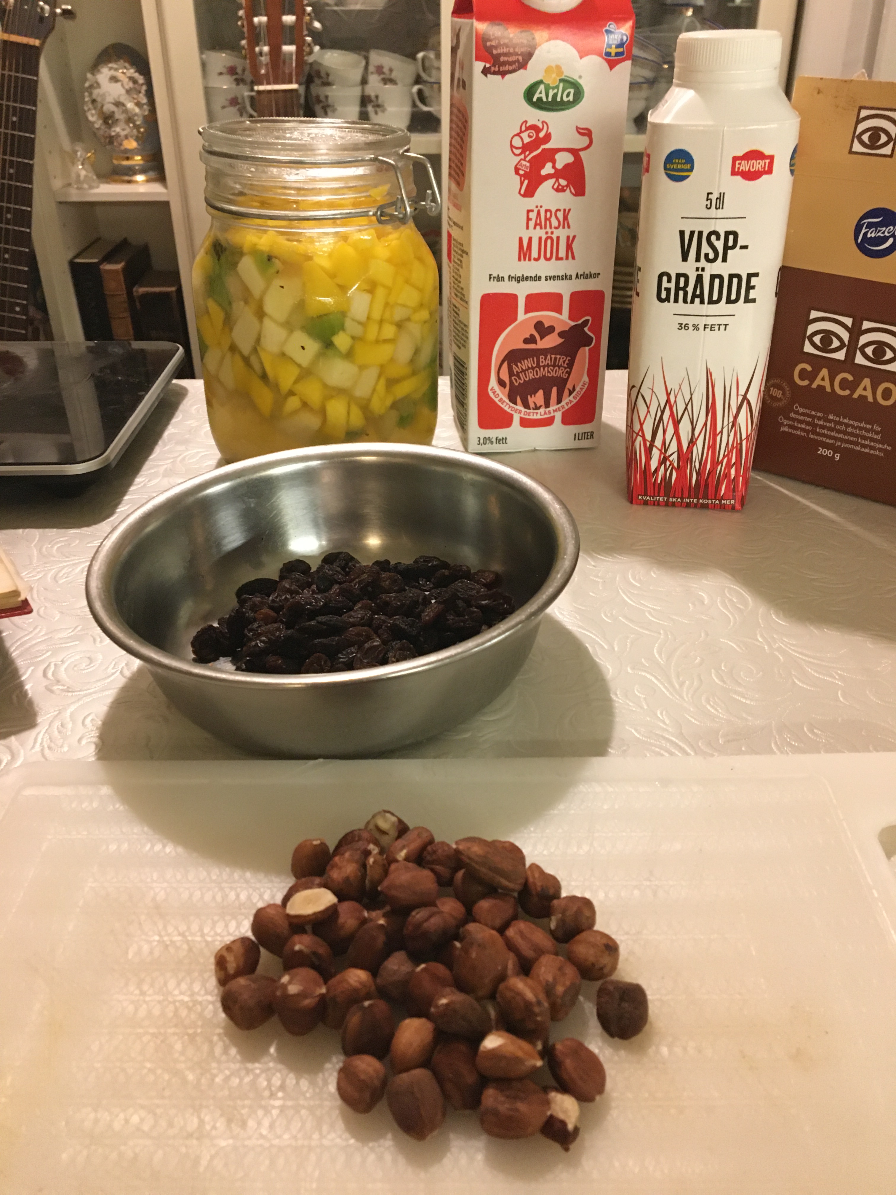 Norways “Mørk Hemmelighet “ which translates into “Dark Secret” is a wonderful mousse cake covered in an outer layer of chocolate pudding, it has bits of tropical fruits, nuts and raisins inside, a perfect match with the chocolate. It is incredibly light and not too sweet. I think it’s a unique dessert but I never saw anyone else than my mother make it. Was it too much work? I have made it sometimes over the years. Yesterday I decided to recreate it in memory of my mother.