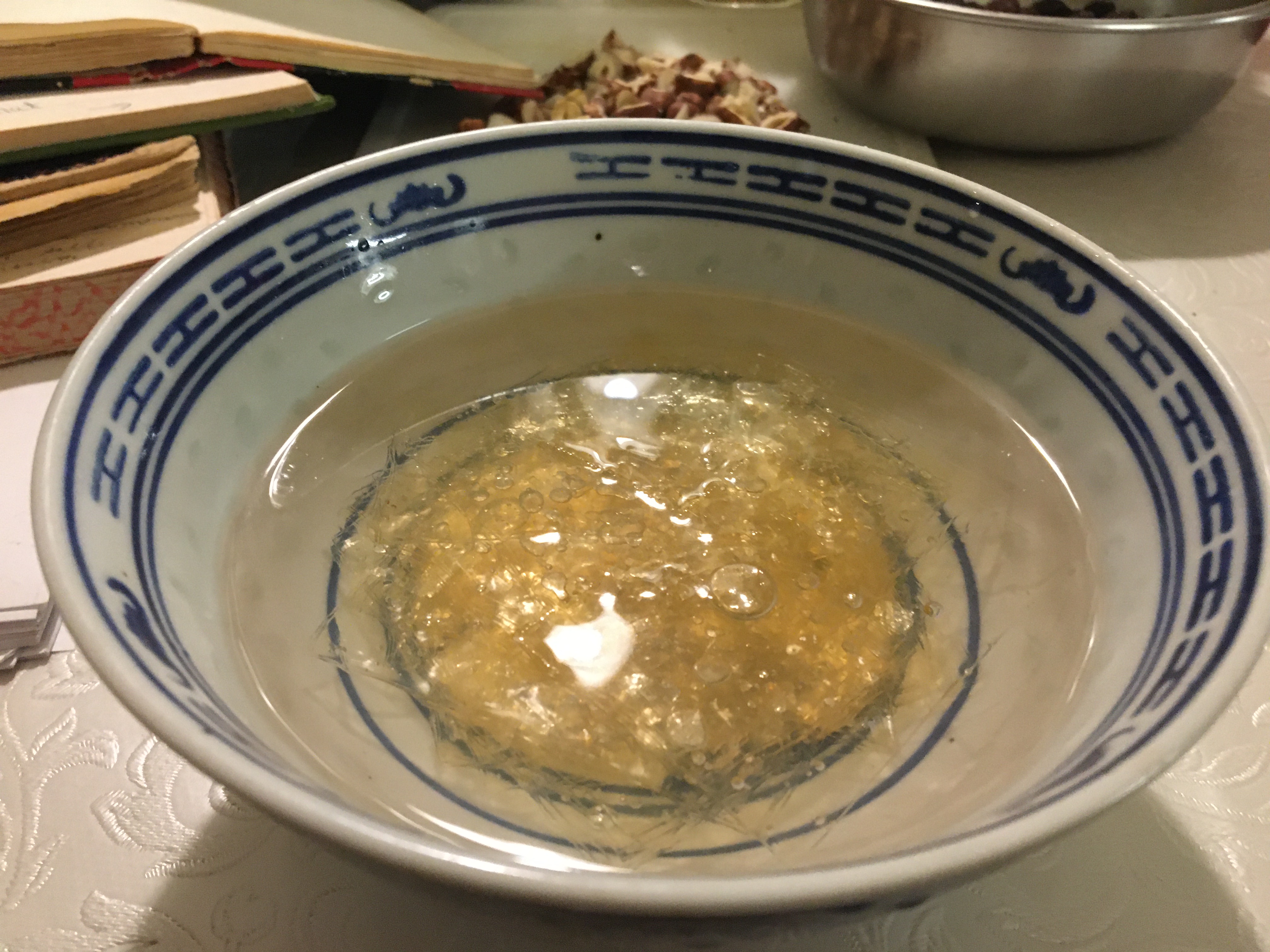 Place the 10 sheets of gelatin in a little bit of cold water and soak for about 15 min. Bring the reserved liquid from the tropical fruit can to a boil, remove from heat, squeeze out water from the gelatin sheets and add into the liquid, stir to combine. Let it cool to room temperature (Should still be liquid form).
