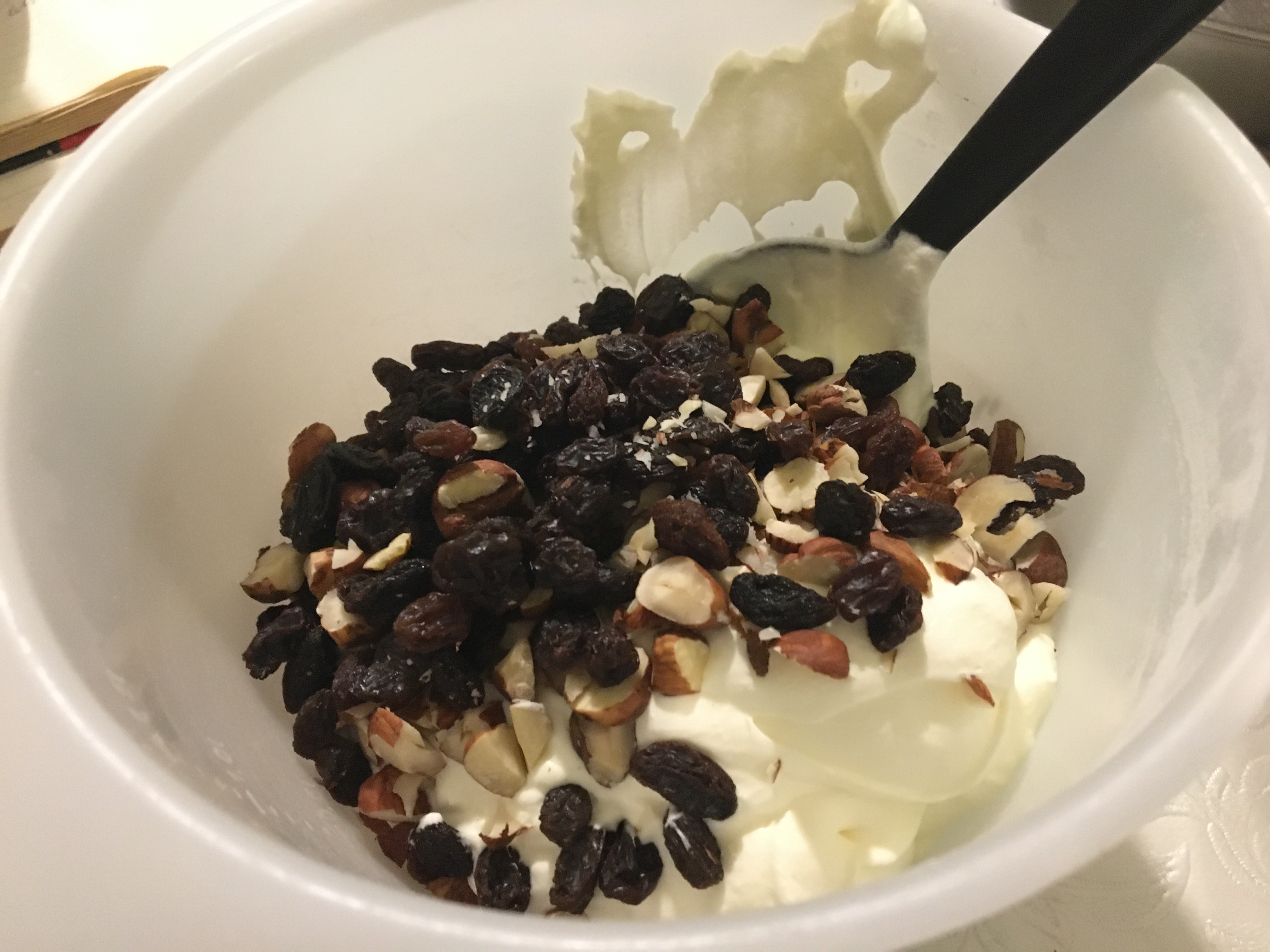 Add the gelatin liquid, the chopped nuts, the raisins and fruits to the whipped cream and combine carefully.