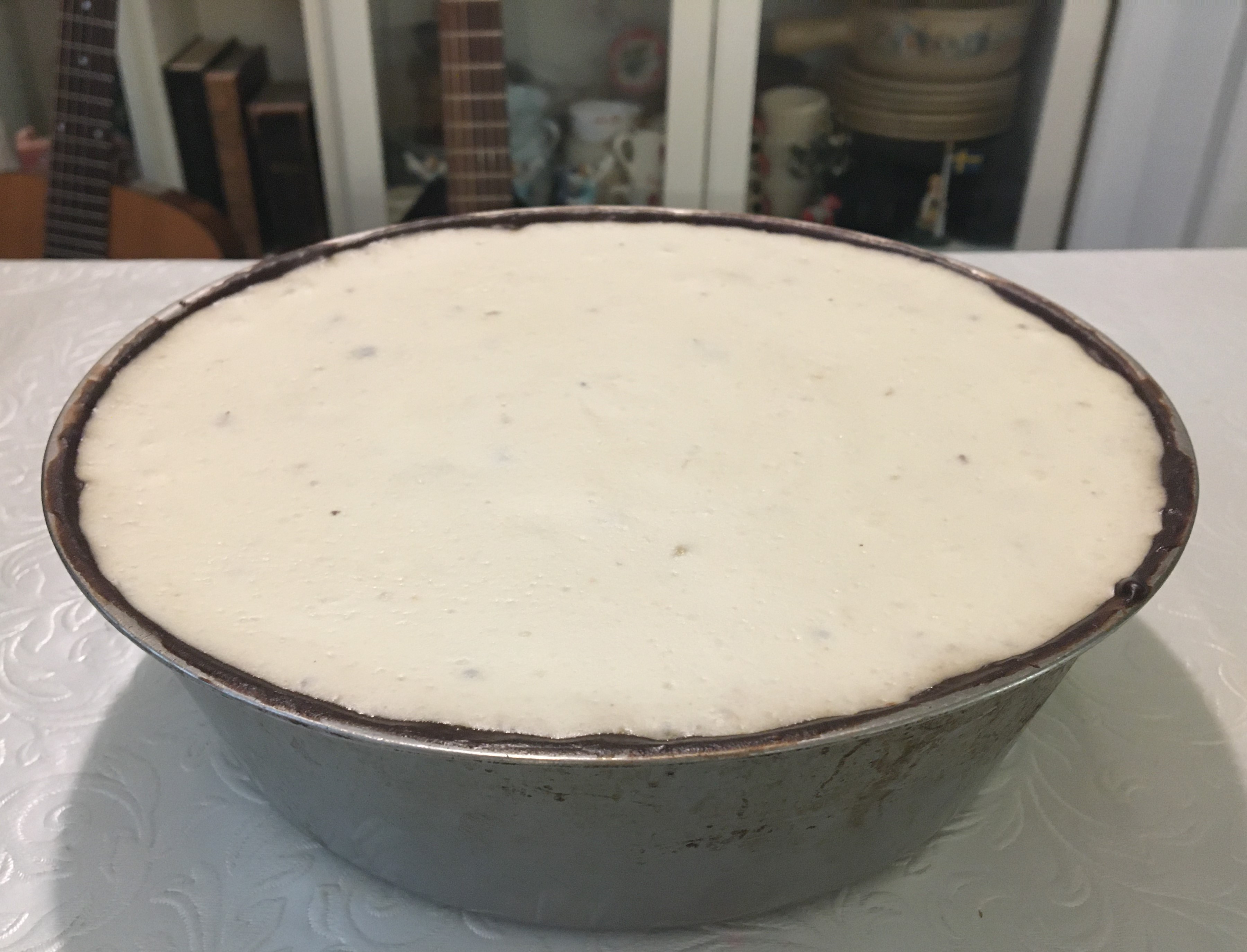 Pour the filling into the pan with the chocolate layer to fill it completely.