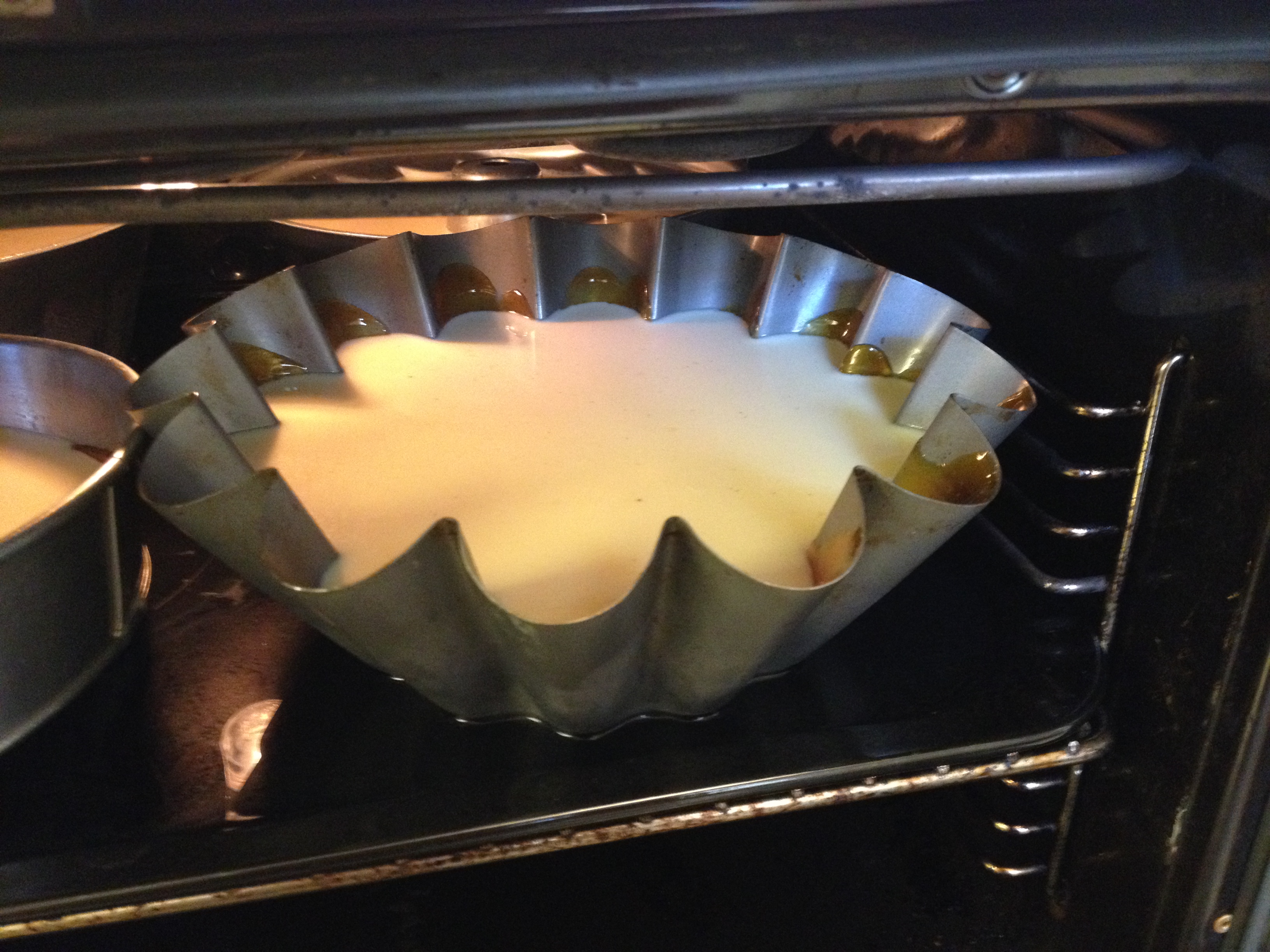 Gently stir in lightly beaten eggs. Strain the mixture while pouring it into the mold. Place a larger oven pan in the oven so you can pour boiling water in the larger pan, about 3/4 full.