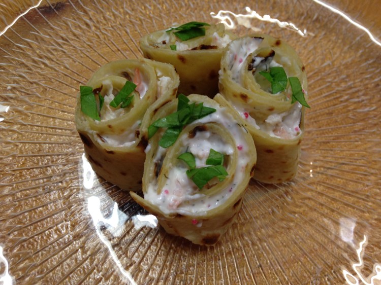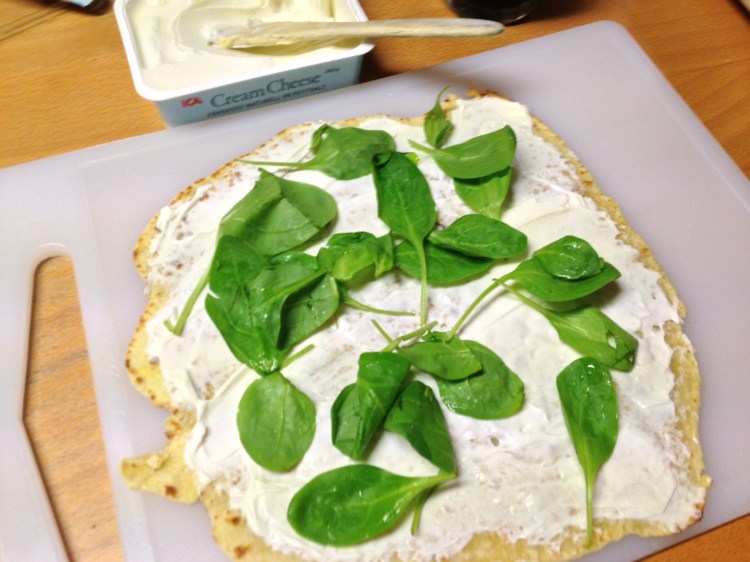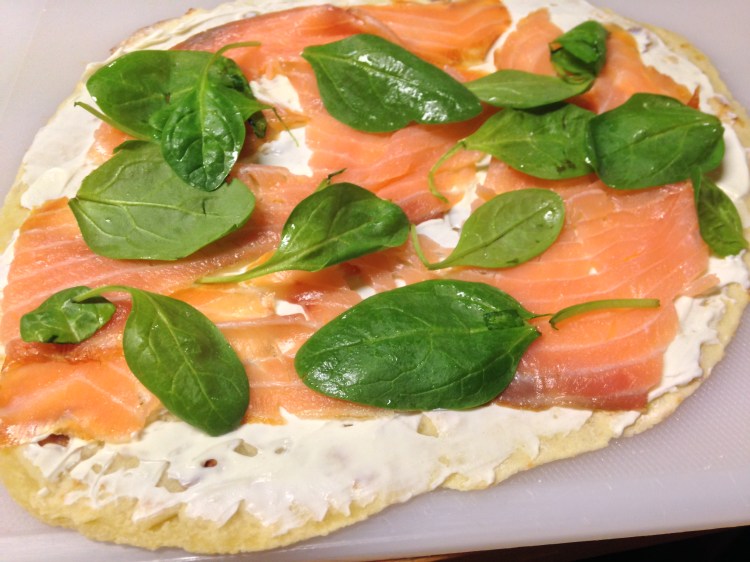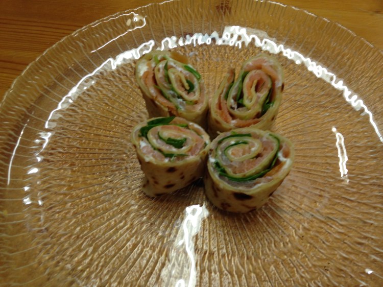 Make tapas with cream cheese, salmon, some green, cut and serve
