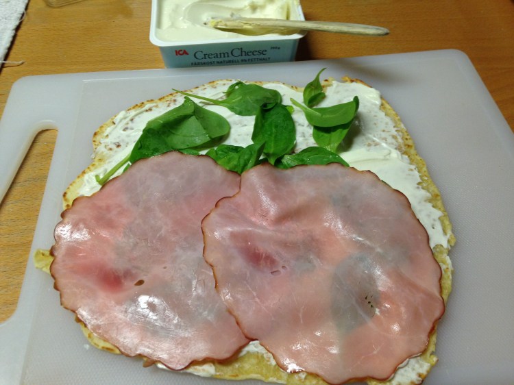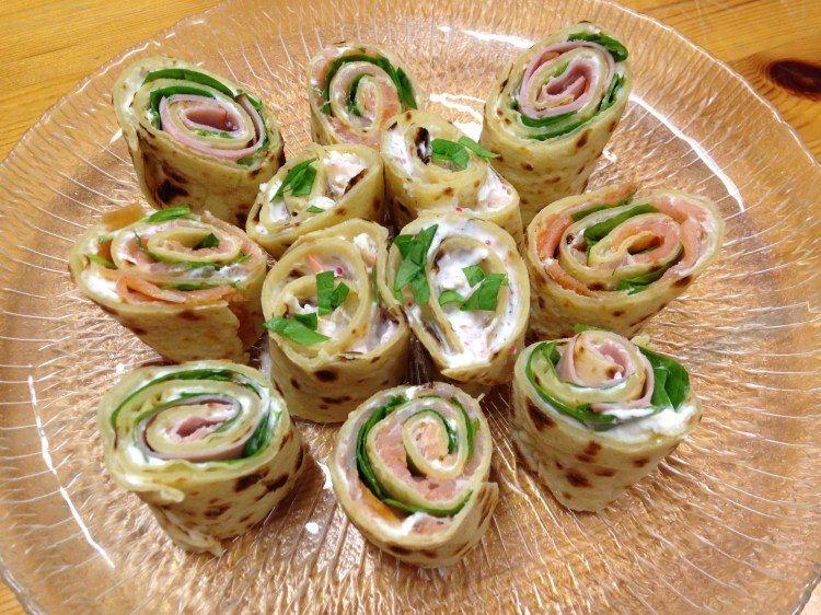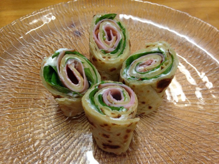 Make tapas with cream cheese, ham and some green, roll, cut and serve