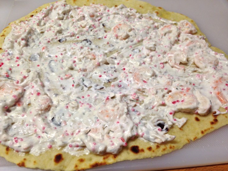 Make tapas with shrimps, mayonnaise, caviar, roll, cut and serve