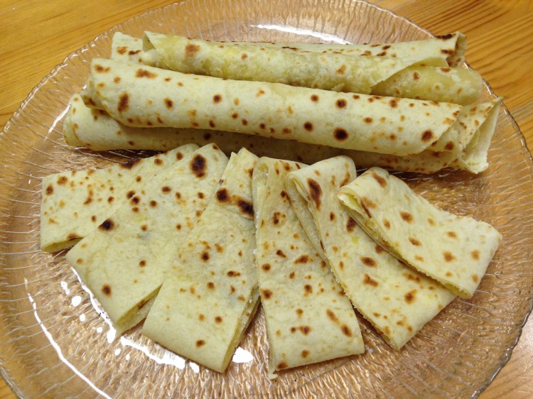 The lefse can also be folded and cut in smaller pieces like squares or rectangles