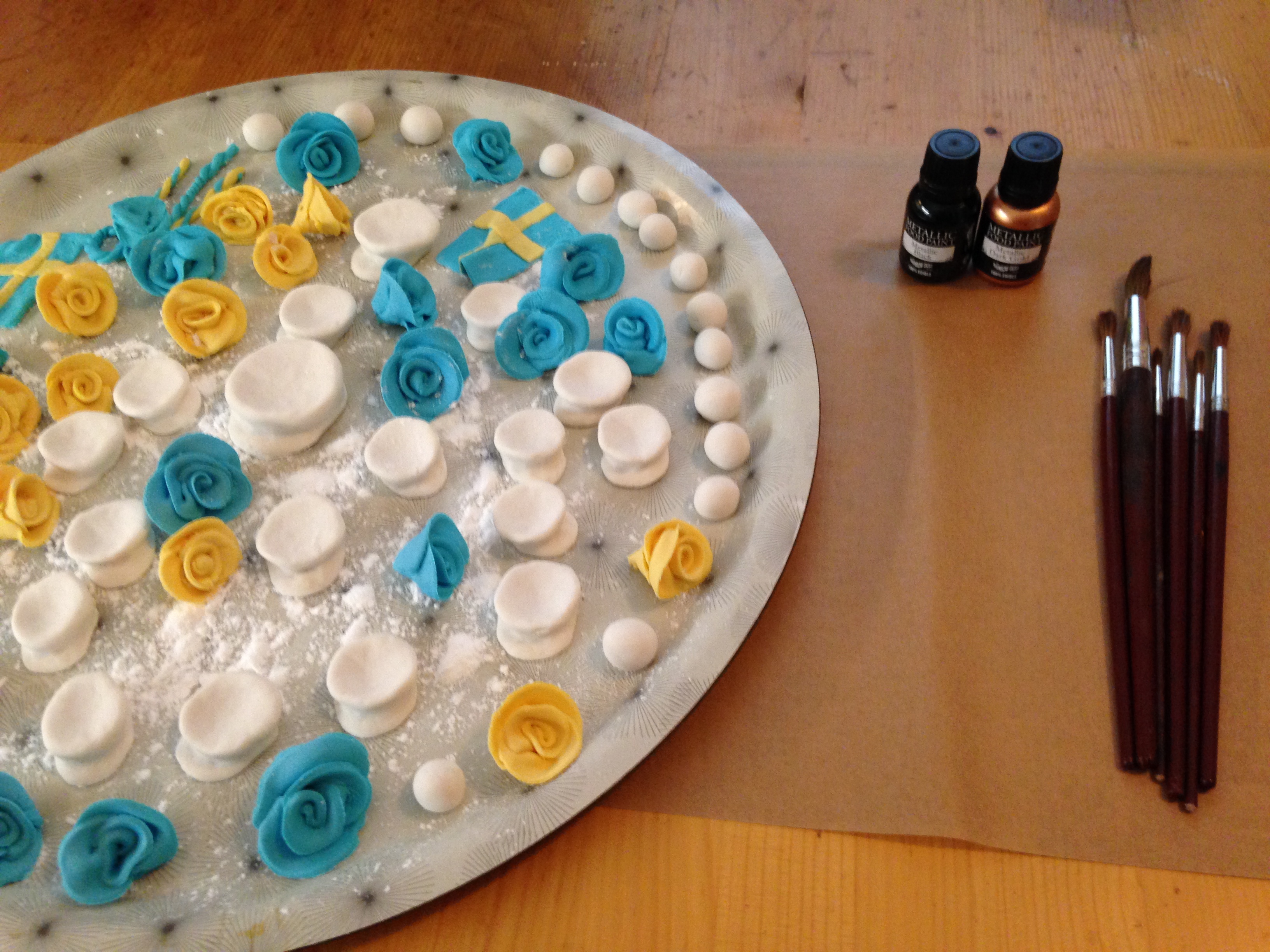 To make flowers and leaves you roll the marzipan to a thin film and cut out the leaves. Flowers can be shaped by cutting half circles with an egg cup for instance and making the roses, adding the halves outside of each other.