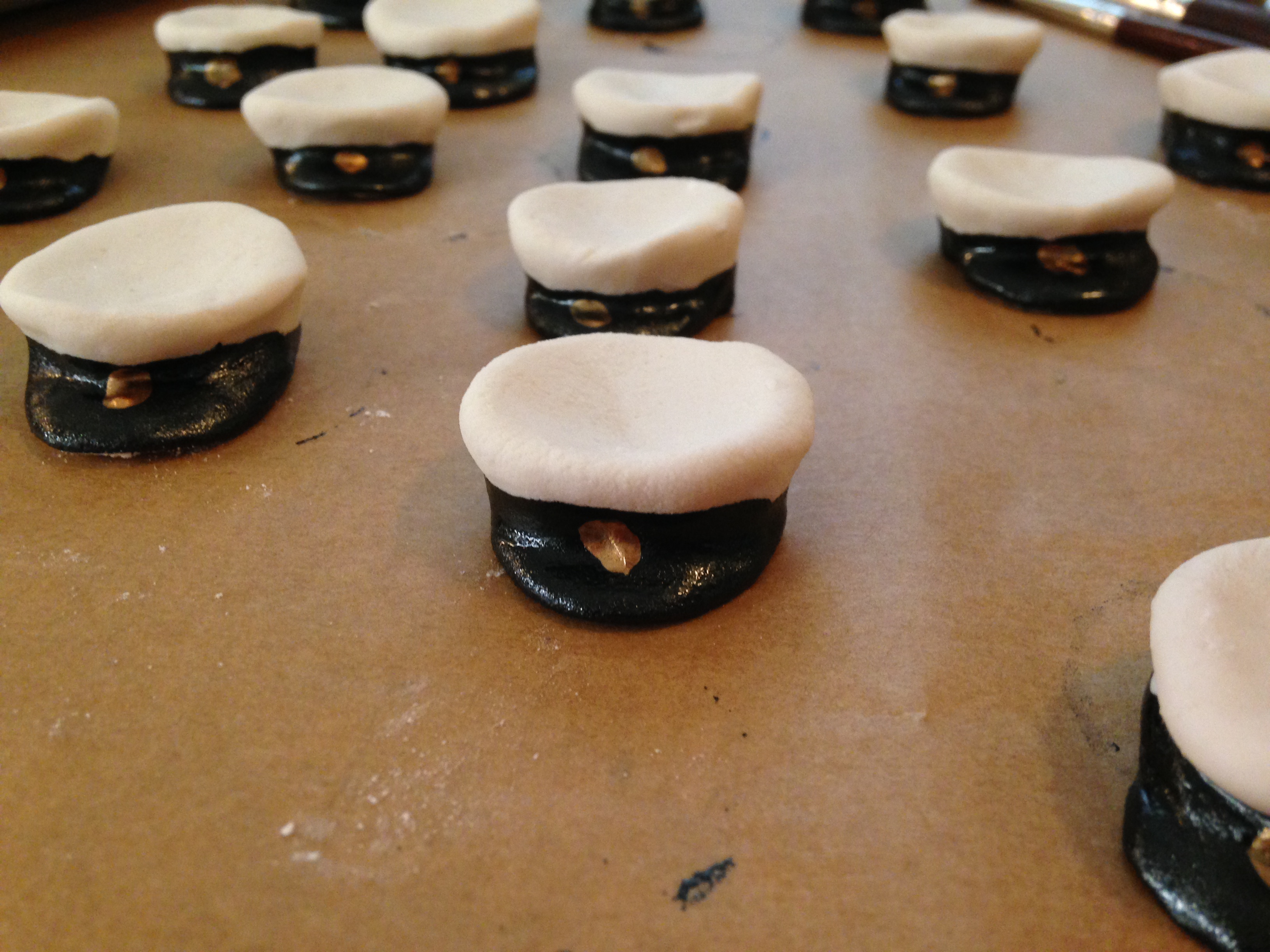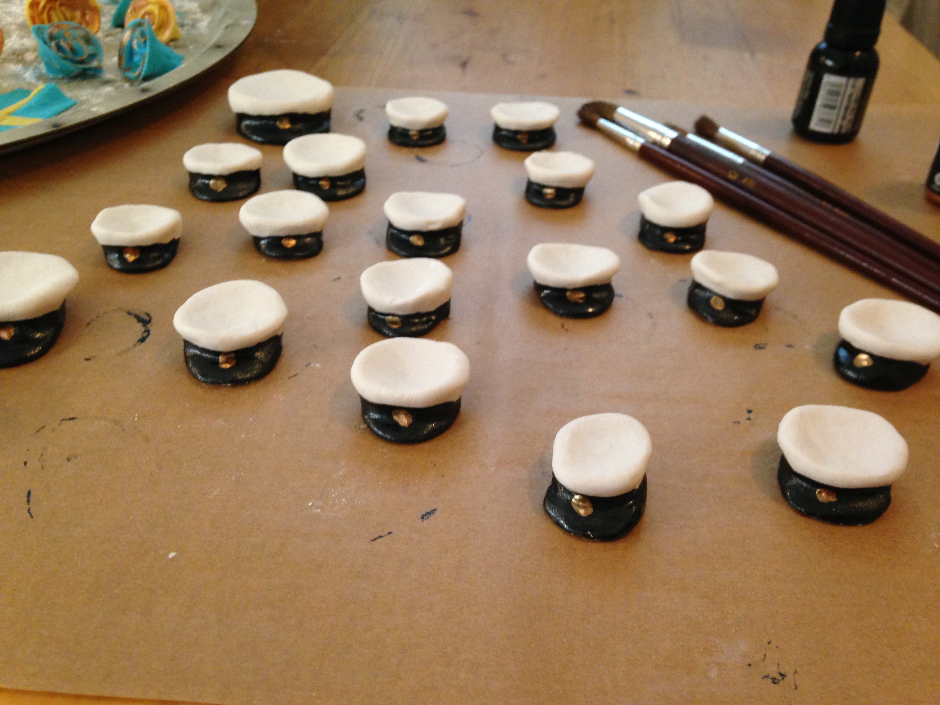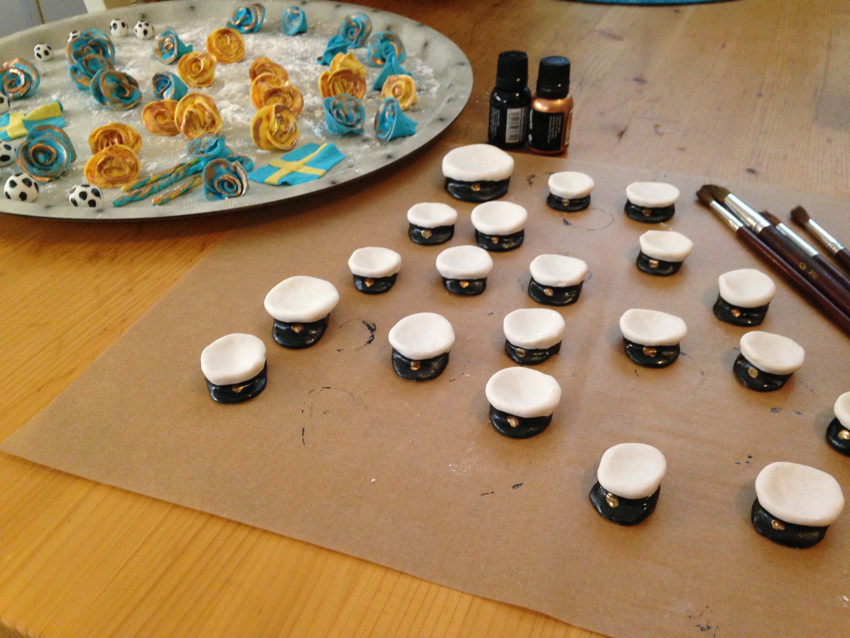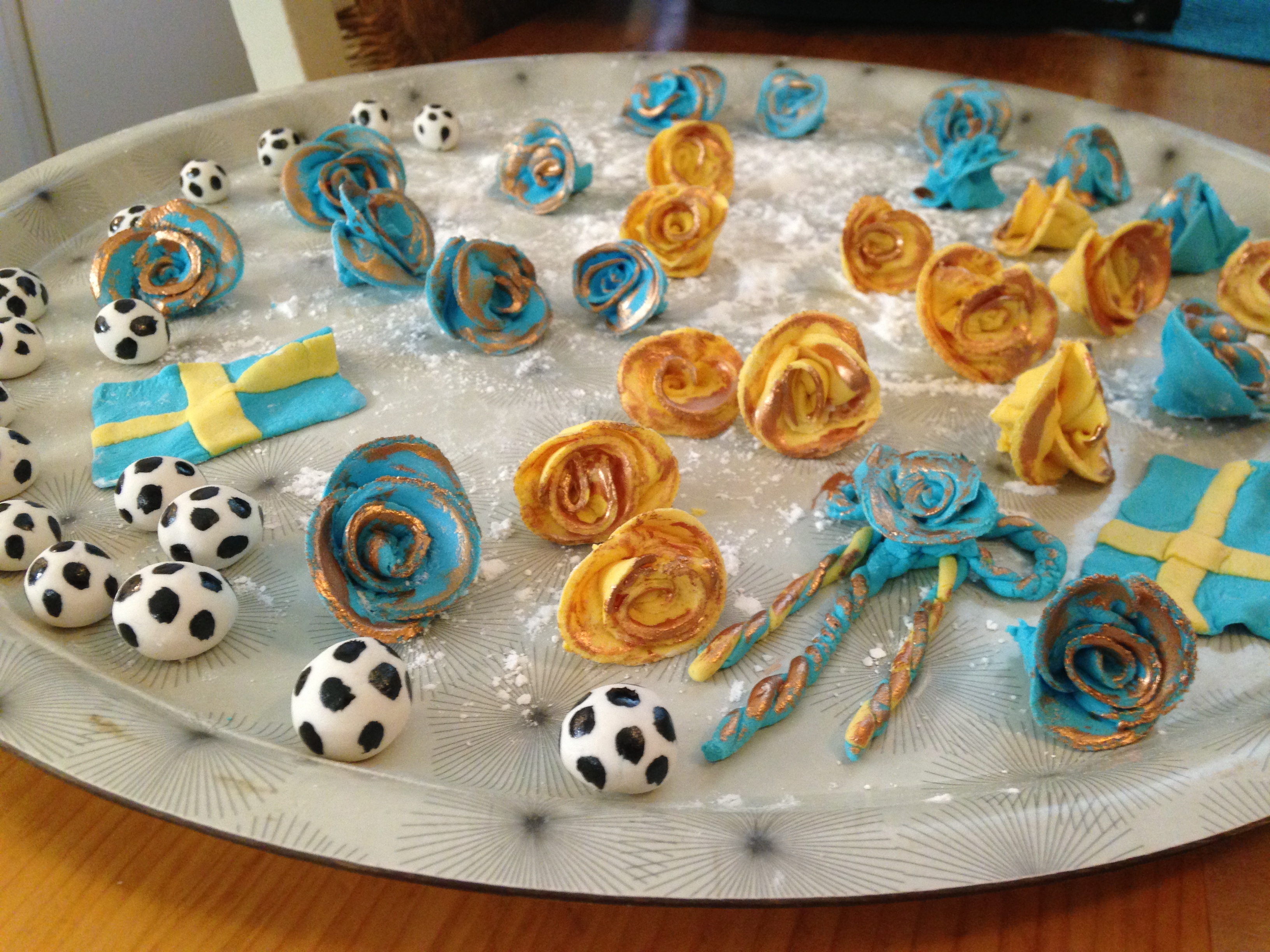 This time I made it for my daughters graduation party. And since she is also a soccerplayer and going to the USA to study at college and play soccer I made a special twist on the cake, just for her. So instead of only flowers I made graduation hats and soccerballs for decoration as well as roses. It is all made in marzipan and colored and painted with eatable colors. The decorations I made and then dried. This in order to be able to glue them to the cake. The glue is melted sugar.