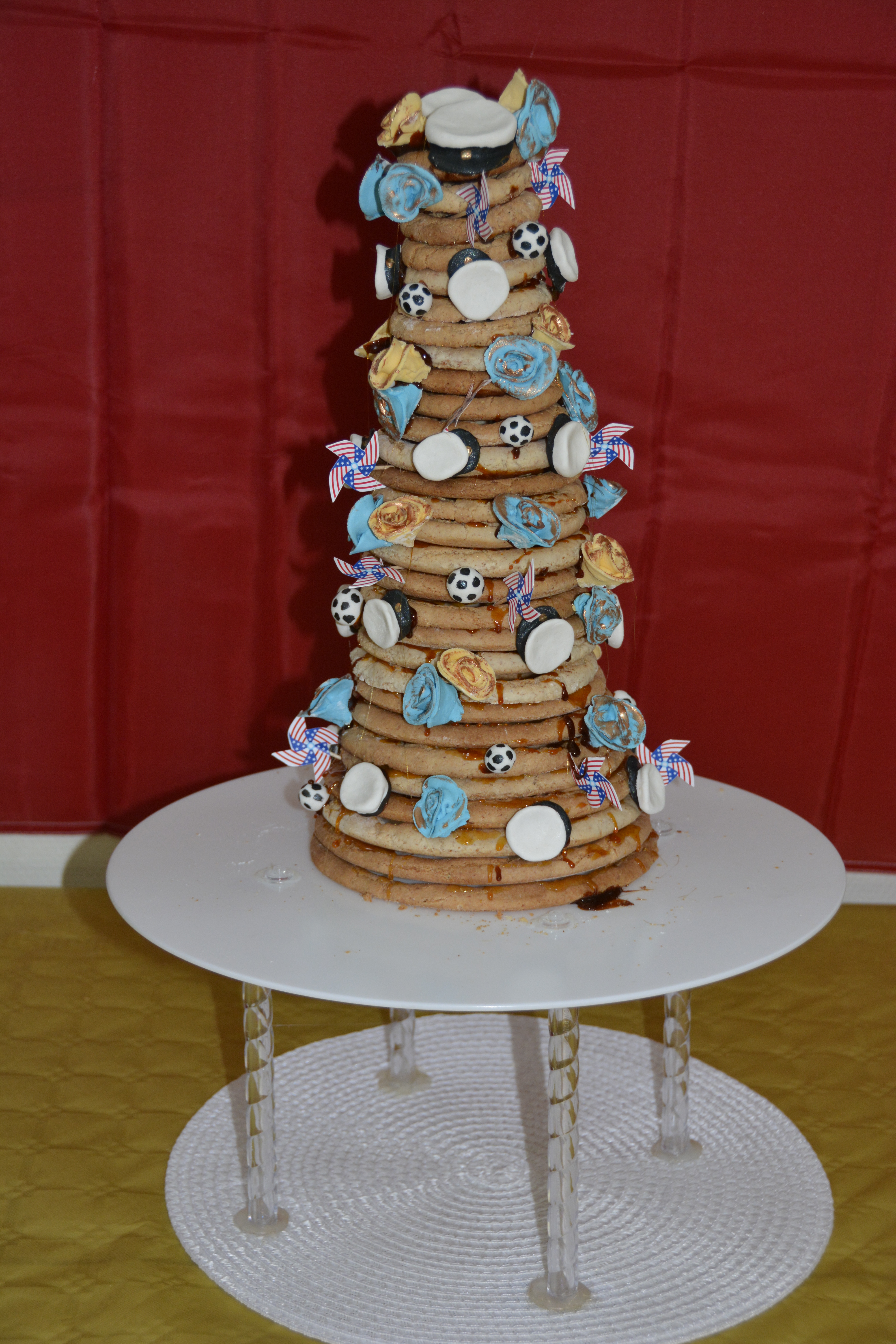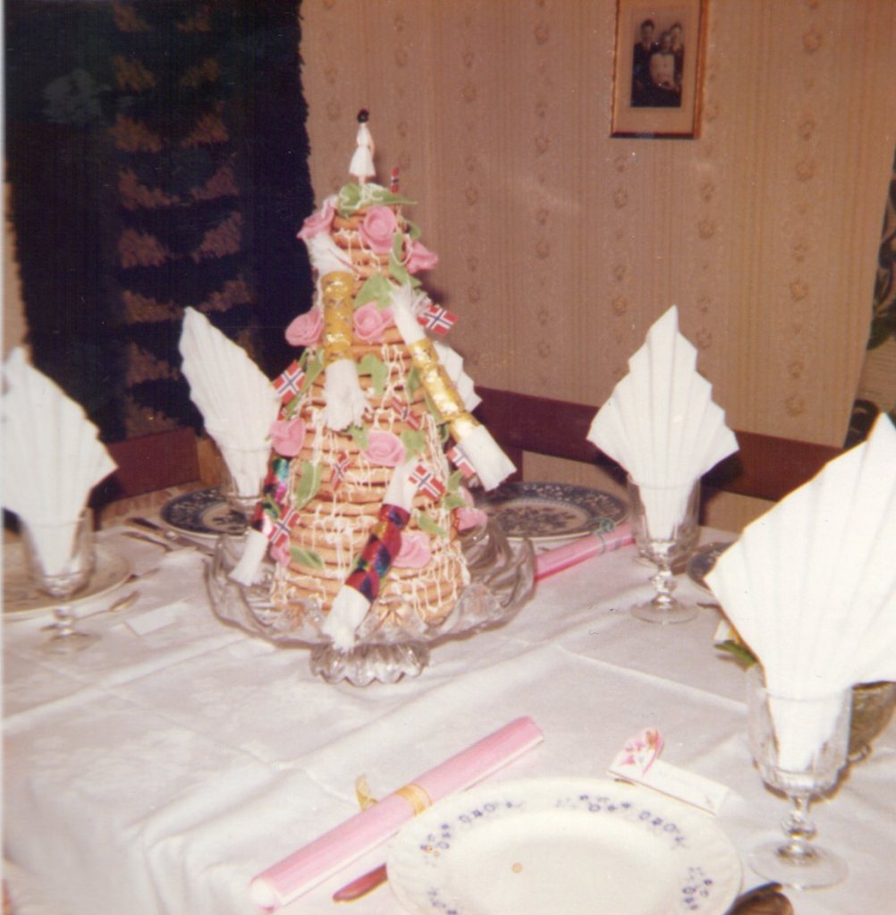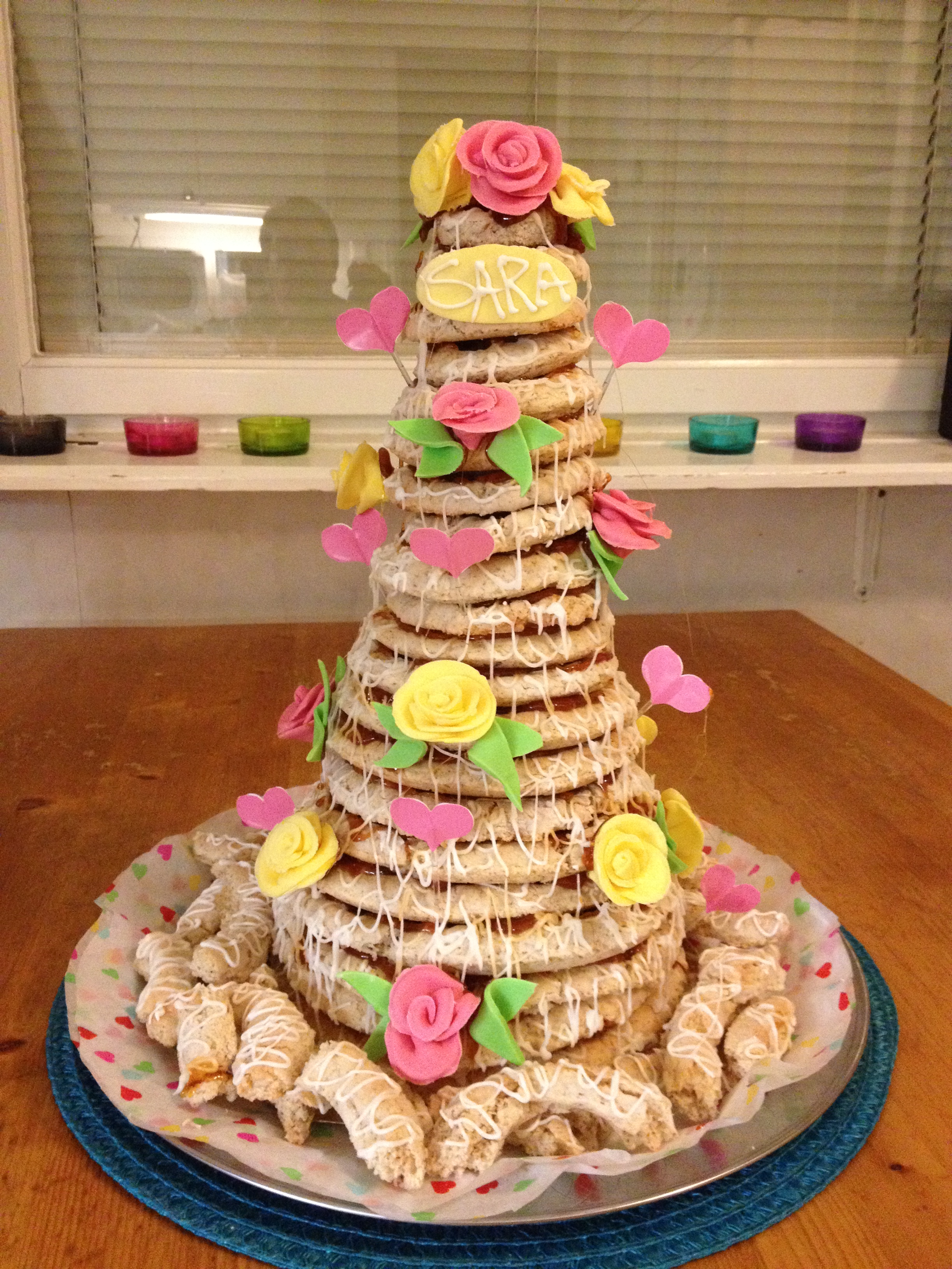 Kransekake, the main piece on a Norwegian partytable. Kransekake, with its tower of granulated almond paste rings, is the signature cake of Norway and a staple at wedding, anniversary, birthday, and holiday celebrations.