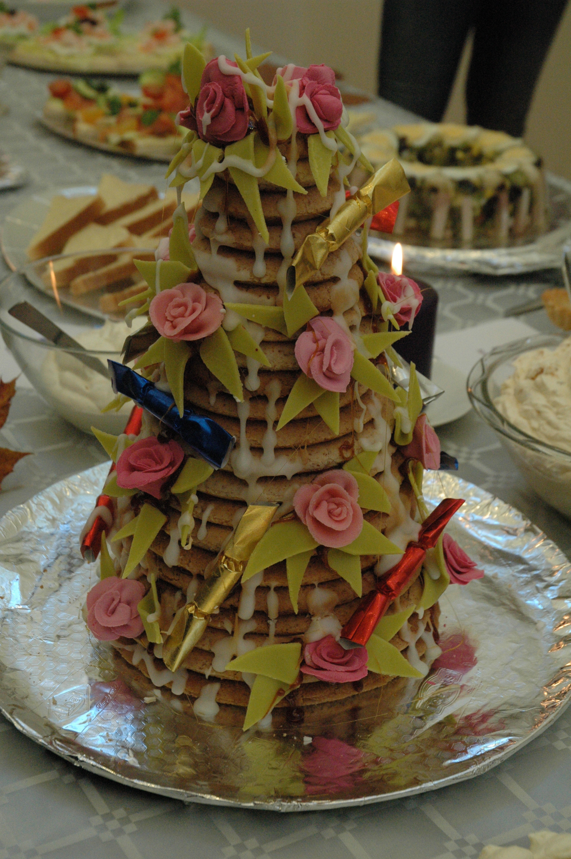 Decorate with edible dried marzipan flowers and leaves or crystallized flowers and ribbons if using as a wedding or special occasion cake. Or, do as the Norwegians do and decorate your tower with flags. To make the Kransekake stick together you can also use melted sugar as glue. Melt sugar in a frying pan and use a wooden spatel or knife to put some on the rings to make them stick together. Be really careful since the melted sugar get extremely hot and you can burn yourself. Use melted sugar to even glue the flowers and leafs or decorations.