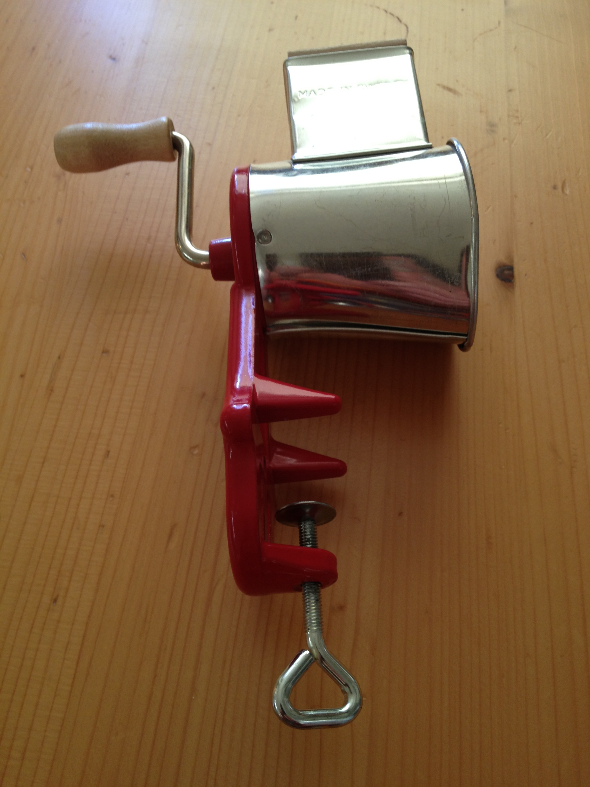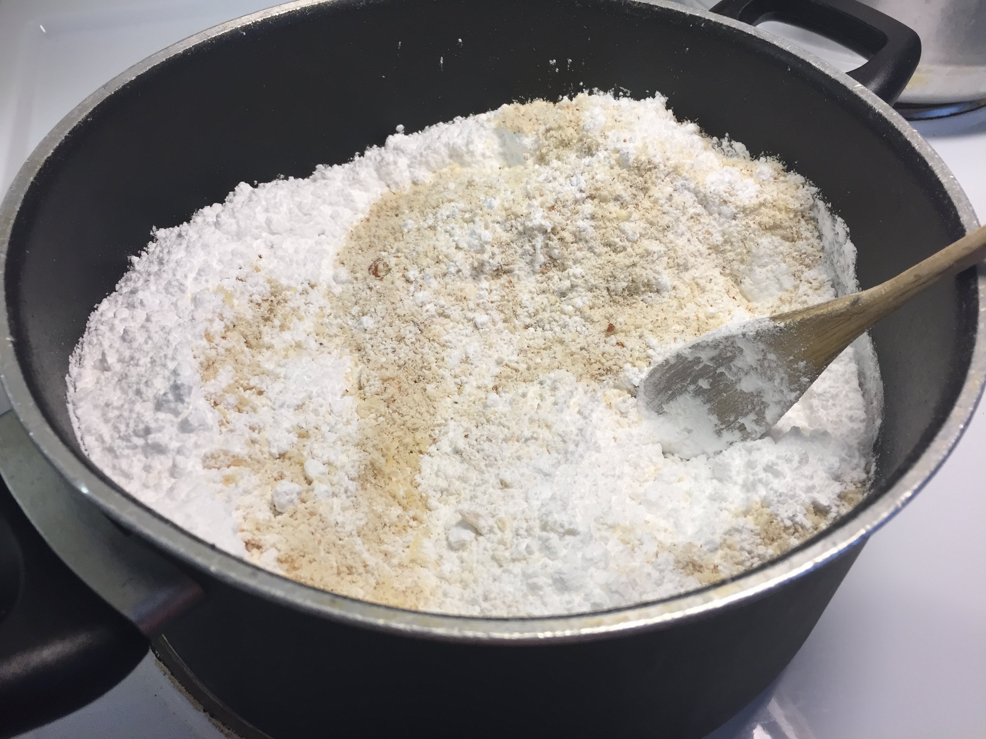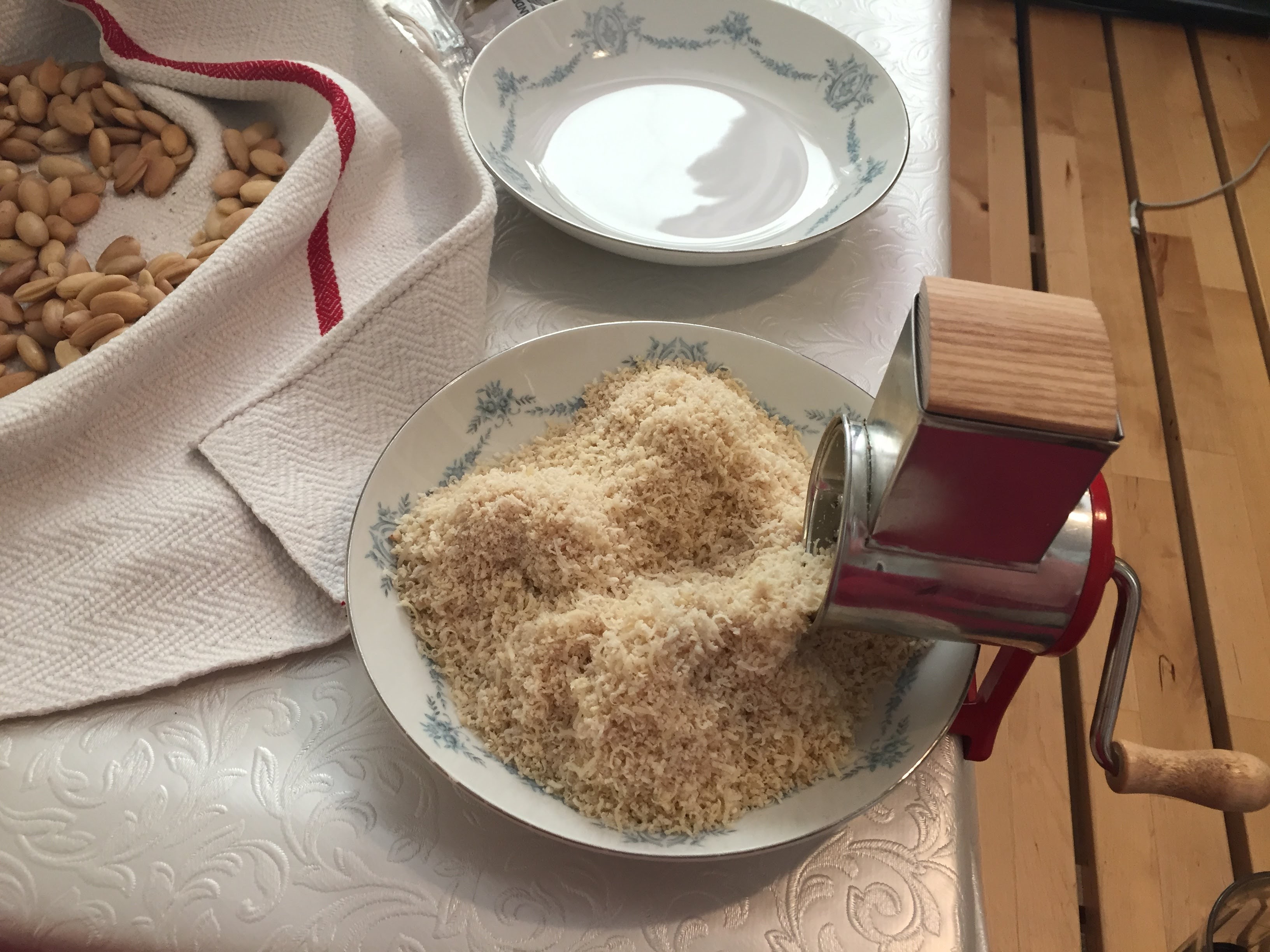 Grind the unblanched almonds in an almond grinder or a coffee / spice grinder (don’t use a food processor for this, for it will over-process the almond flour). Repeat the process with the blanched and dried almonds. Mix together the unblanched and blanched almond flours and the confectioner’s sugar. Then, run this mixture through your grinder a second time.
