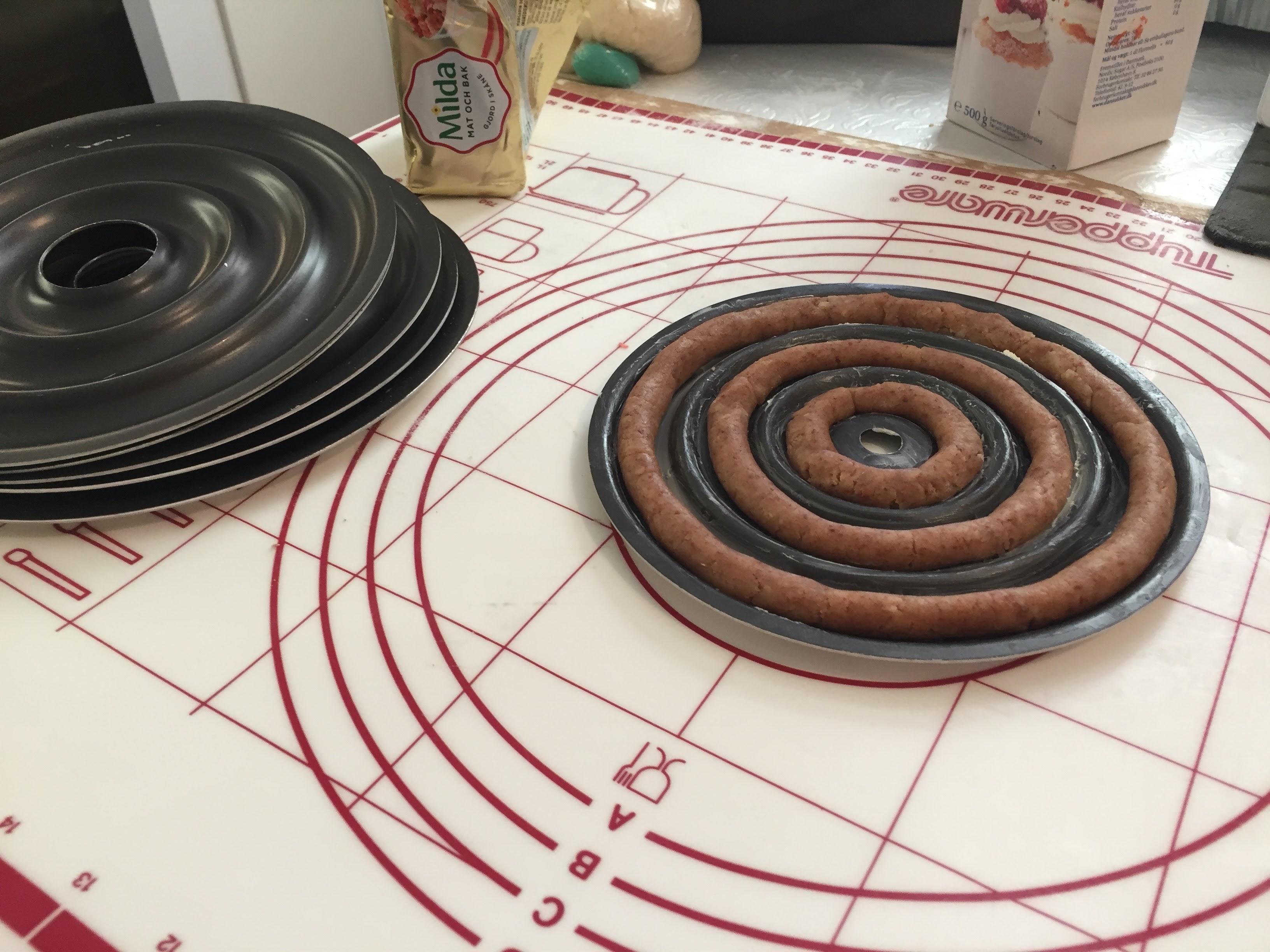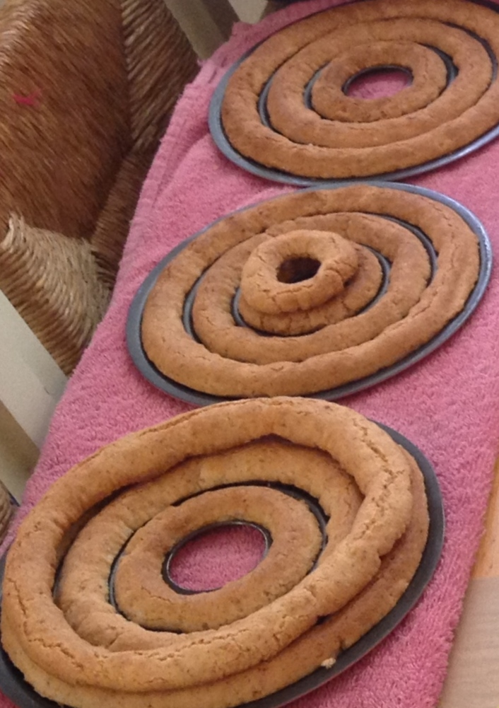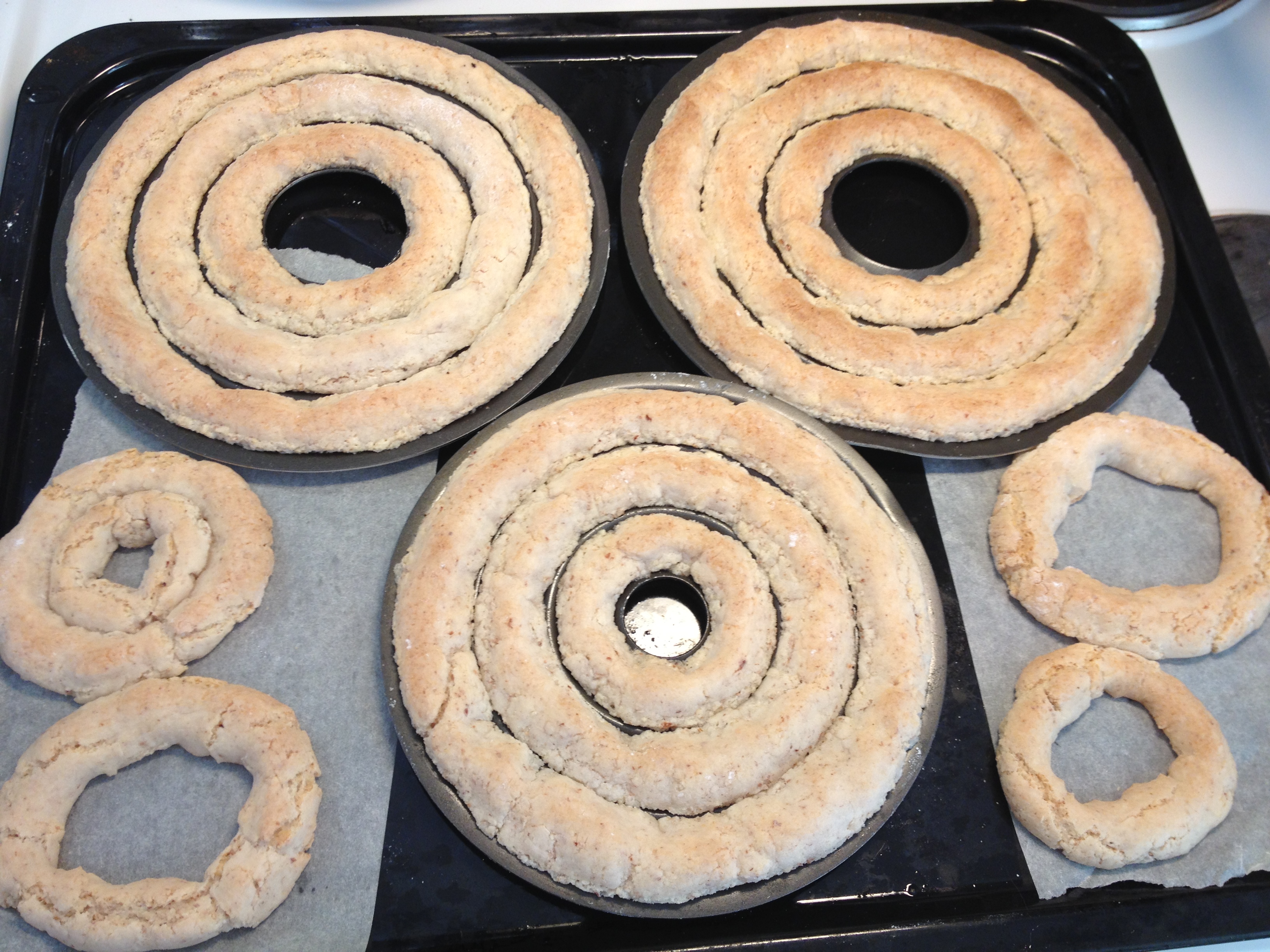 Preheat your oven to 200 C º. Flour a pastry board or clean counter with potato starch flour; butter and dust six kransekake pans (if using) with potato starch flour. Roll the almond paste into 18 1,3 cm”-wide “snakes,” descending in length – in 1,3 cm increments – from about 50 cm” long to 30″ long. Fit the snakes into the molds, pinching the ends together tightly to form rings (Note: with this dough you can easily re roll a few snakes if you’ve miscalculated the lengths so that they are evenly divided to fit the granulated rings of the kransekake molds). Fit the lengths into the kransekake molds.
