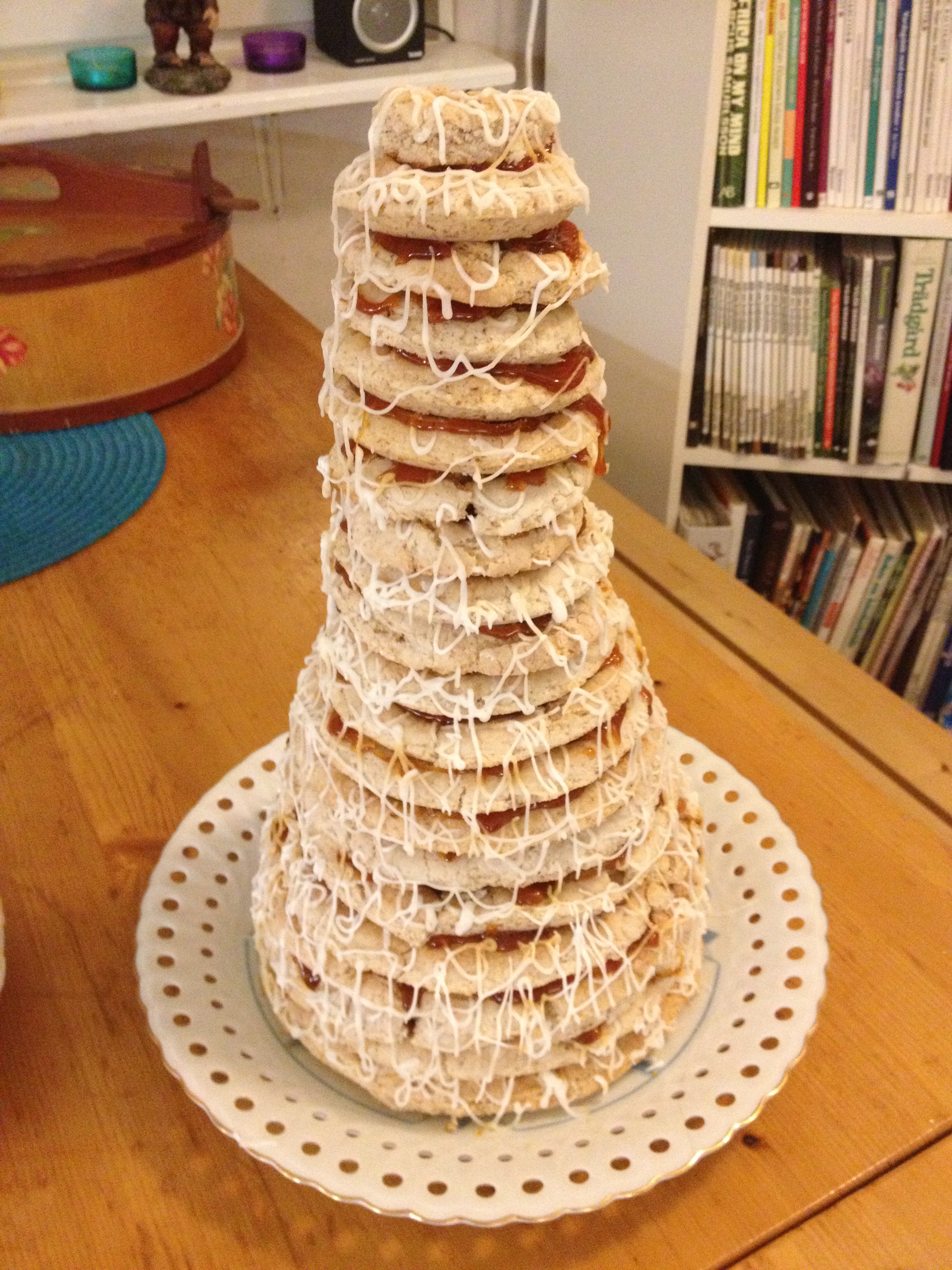 Rap the pans lightly on a counter to loosen, running a knife between the rings if necessary to separate. Then, carefully remove the largest ring, invert it, and place it on a serving or cake plate. Mix together the confectioner’s sugar, 2 egg whites, almond extract, and lemon juice to make a thick frosting. Place into pastry bag (small tip) or in a plastic freezer bag with the end snipped off. Pipe the frosting in a wavy pattern around the circumference of the bottom ring (the frosting, while decorative, also serves as the glue that will hold the cake together).