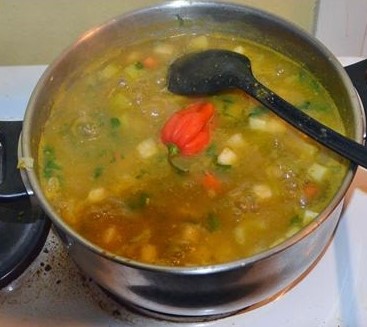 If you haven’t used them before, this recipe will introduce you to Habanero peppers. Habanero peppers are lethally hot. Take care not to use too much. A tiny amount of cut habanero goes a very long way. Why use them? They have an incredible flavor as well as heat. The pierced whole habanero used at the end of this recipe is a great way to get the flavor without too much spice. Choose a pepper that is perfectly whole and sealed until you prick it. Any more open, and it could make the stew way too spicy.