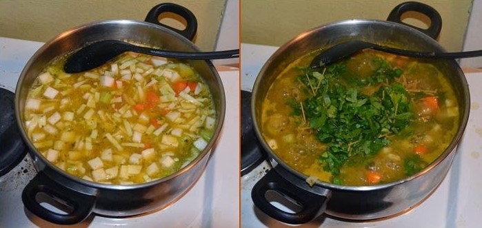 5. Add the squash puree to the chicken. Bring to a boil again and add the cabbage, carrots, turnips, potatoes and cloves. Cook uncovered until the vegetables are just tender, about 20 minutes. Adjust for salt and pepper.