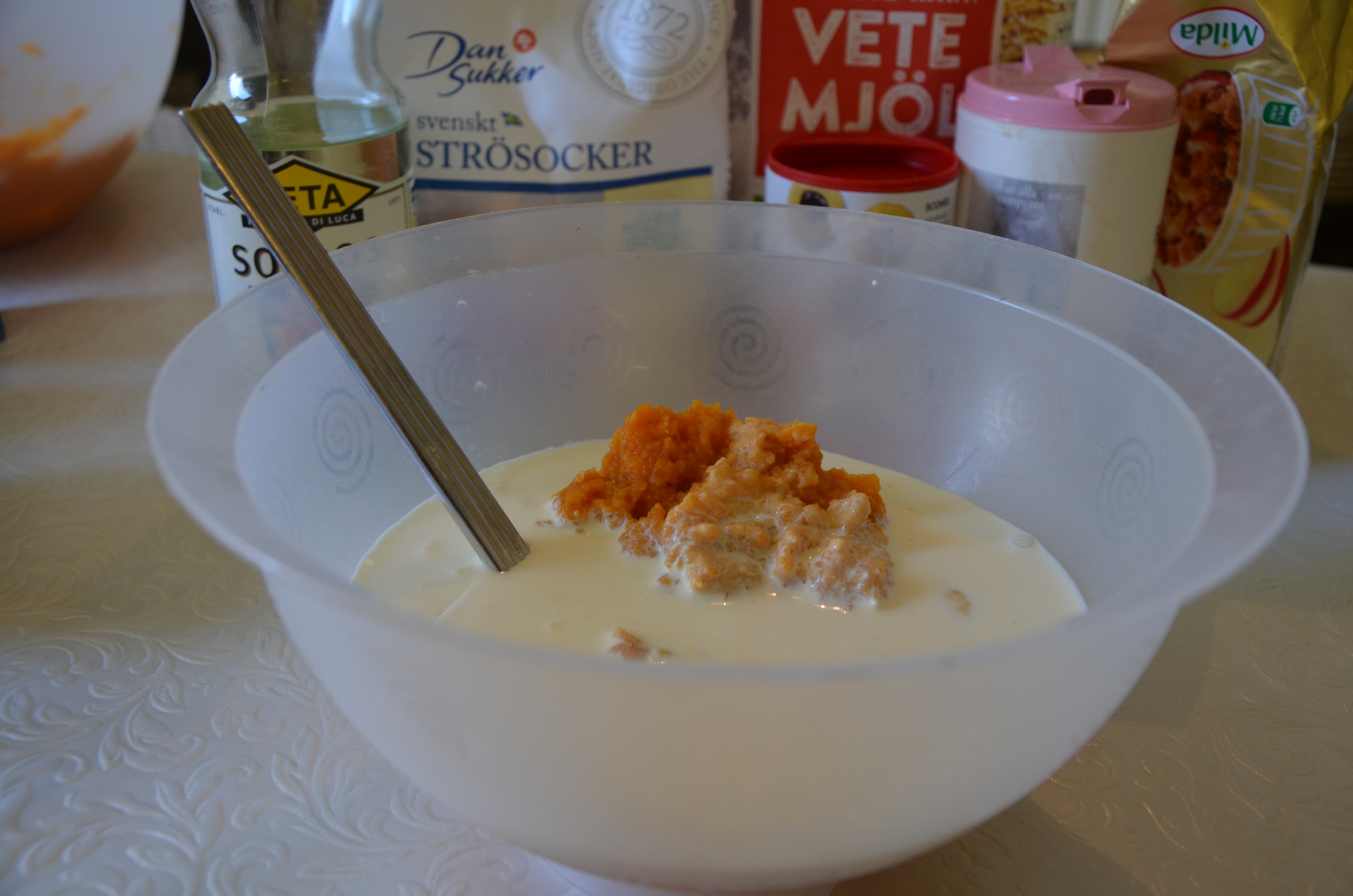 To prepare the pumpkin to be used in baking. Cut the pumpkin in wedges and remove the seeds. Bake the pumpkin in the oven for 1 hour on 180 Celsius degrees. The pumpkin is ready when it is soft when you press it. Take out from the oven and let it cool off. Spoon out the pumpkin meat let it sit in a sift and press out the water. Than make into a pure with a mixer.