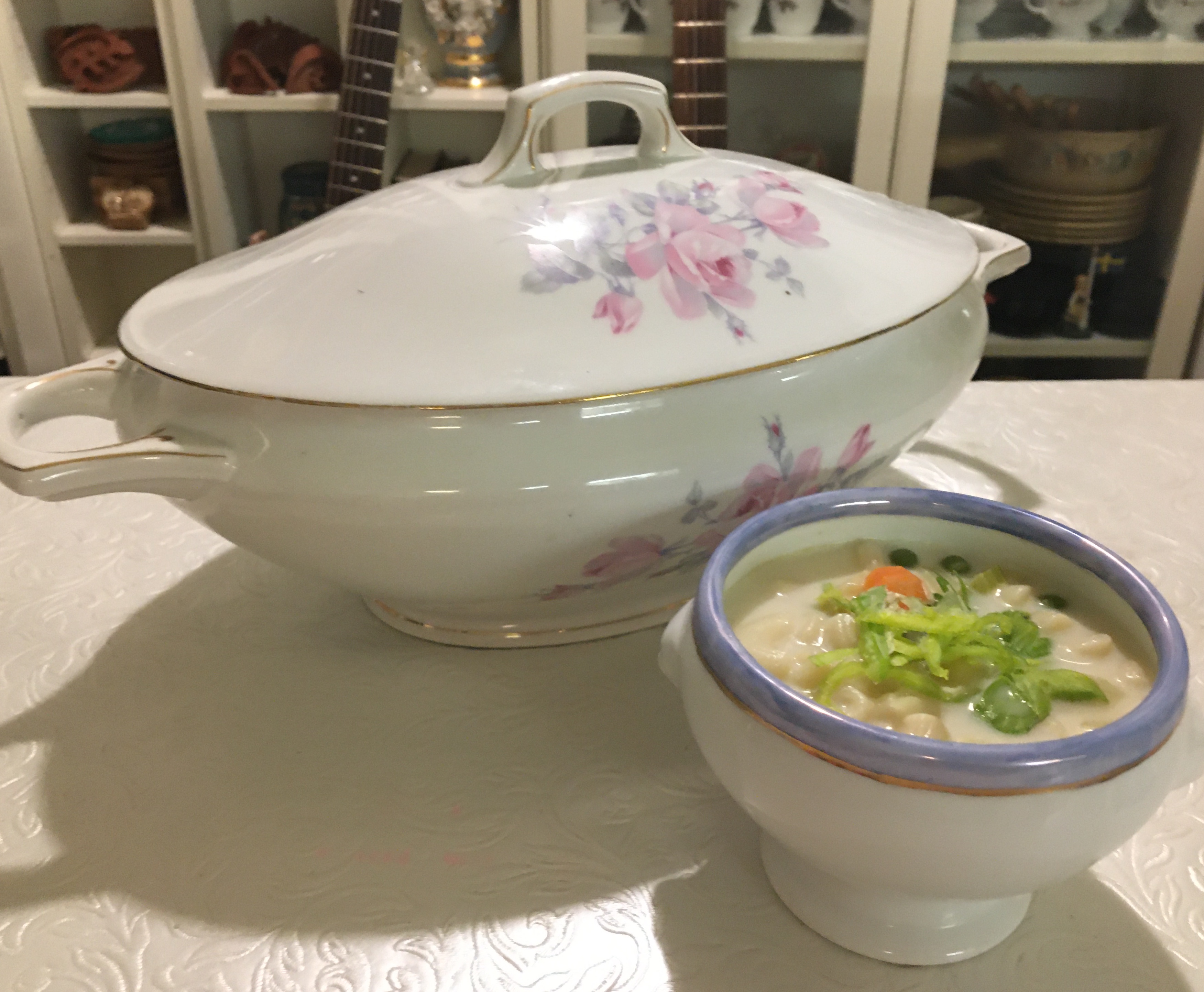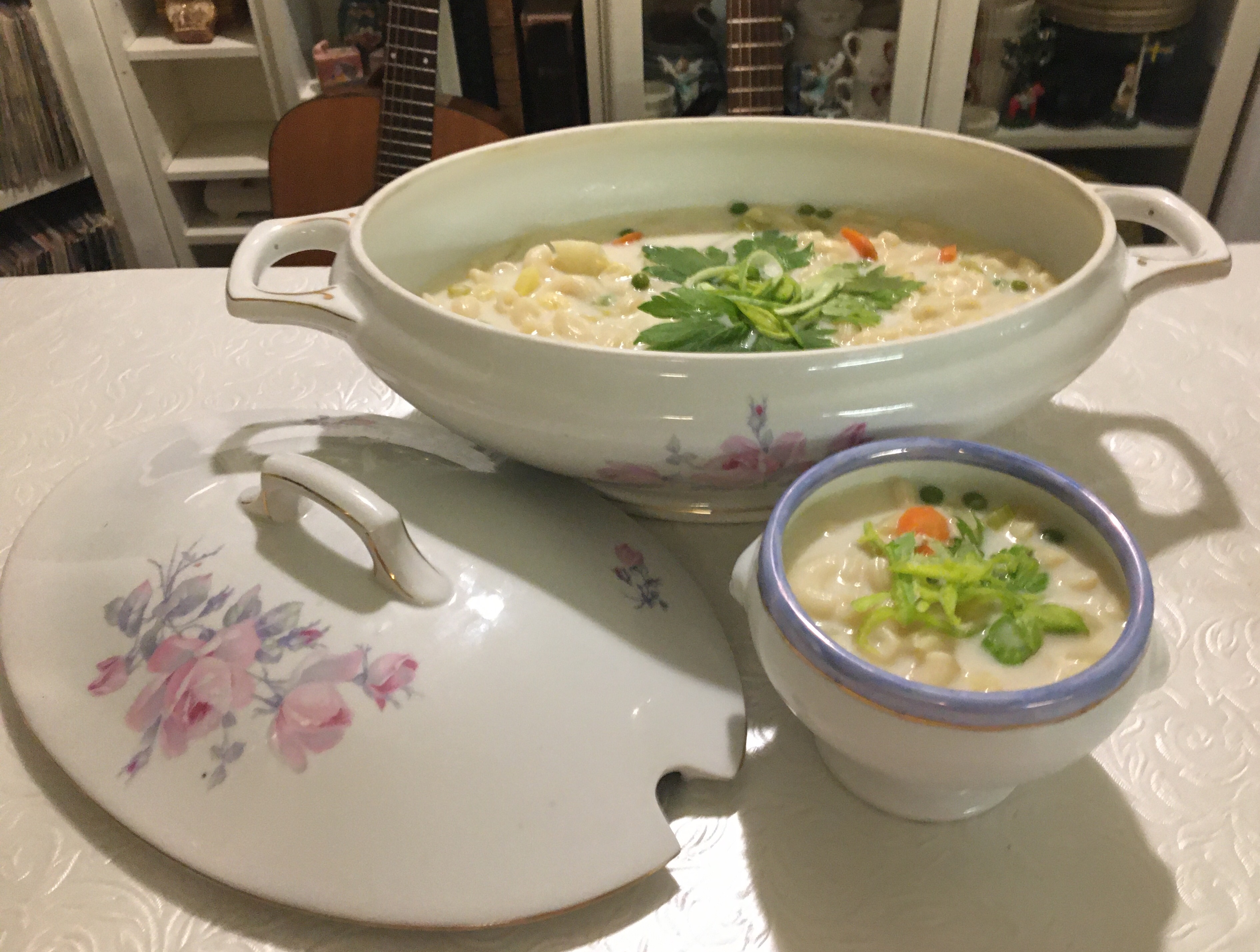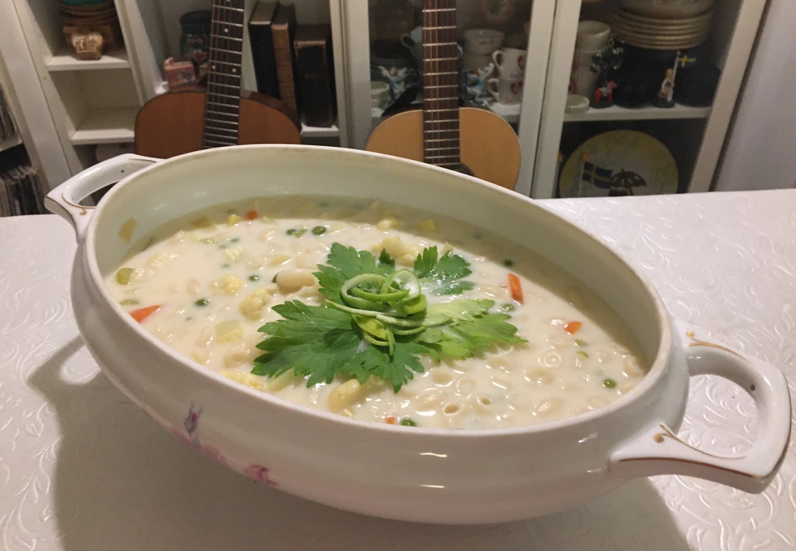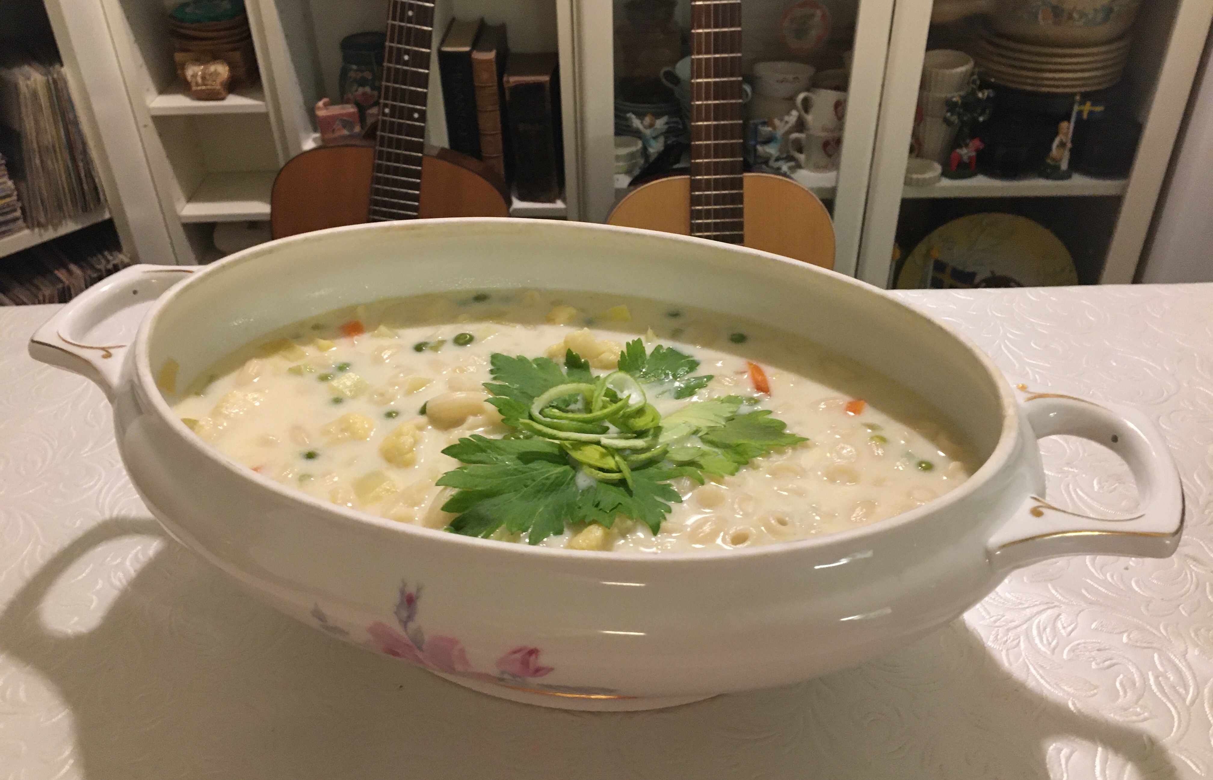 In Norway’s traditional cooking when I grew up, a dinner would always be a main dish and dessert. So in my mothers menues there is always a main dish, sides of vegetables and a dessert or a soup. Soups were used in all variations. I think it was economical and a way to use the broth from various cookings. You would get all the taste in the broth but could add cheaper but nutritious ingredients. So saving and using the broth from cooking meat, fish, vegetables, bones from meat, was natural and could give a feel of eating fish and meat just from the broth. From this the most tasteful soups could be made and you would feel good, full and comforted.